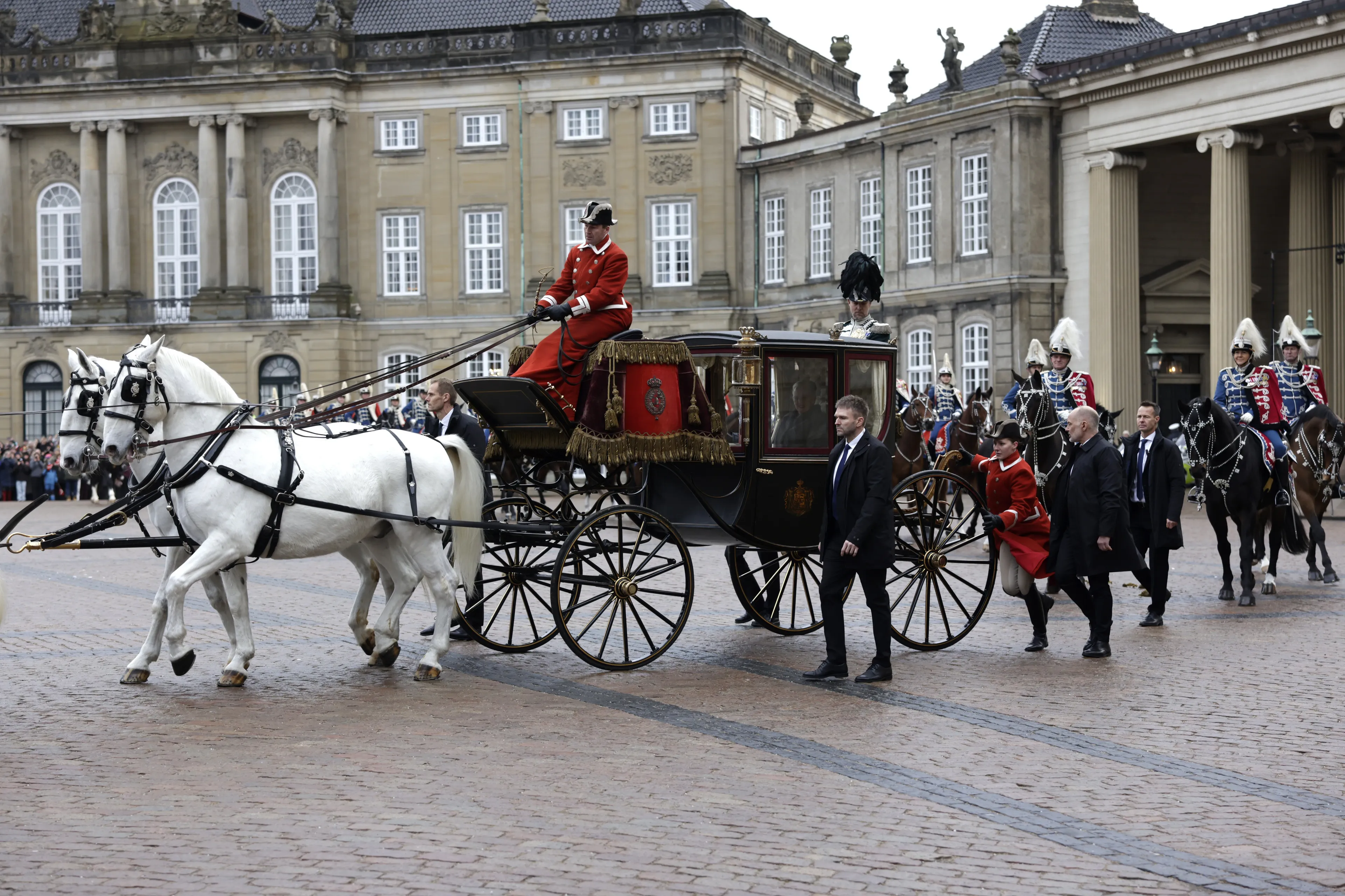 Koningin Margrethe heeft het paleis Amalienborg in Kopenhagen verlaten met de Golden Wedding Anniversary koets. Ze vertrekt naar paleis Christianborg om daar de abdicatieverklaring te tekenen. Hierbij wordt ze begeleid door de Gardehusarregimentet, de cavalerie-eenheid van het Koninklijk Deens leger. De stoet gaat door het centrum van Kopenhagen. Ook zien we kroonprins Frederik en kroonprinses Mary in de voertuigen.