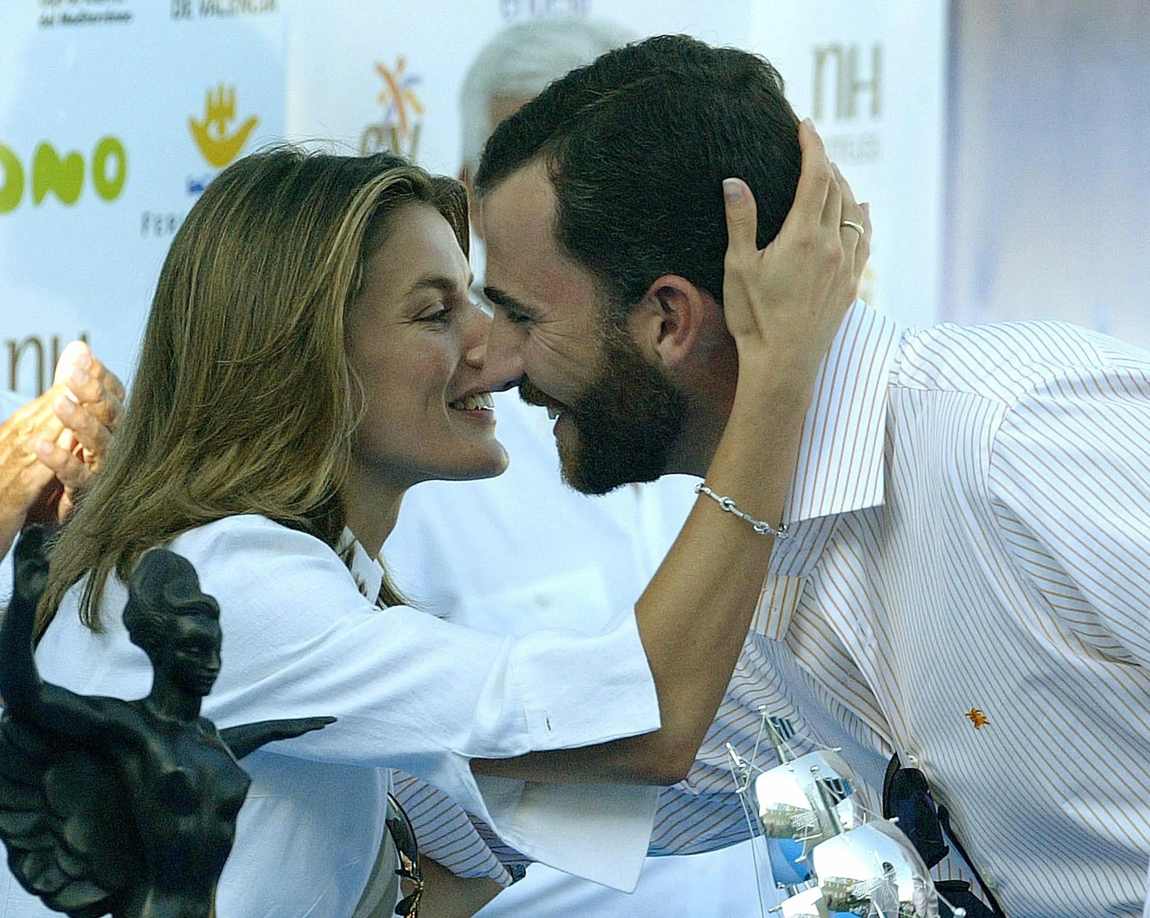 Koning Felipe en Koningin Letizia van Spanje omhelzen elkaar tijdens een zeilwedstrijd in 2004.