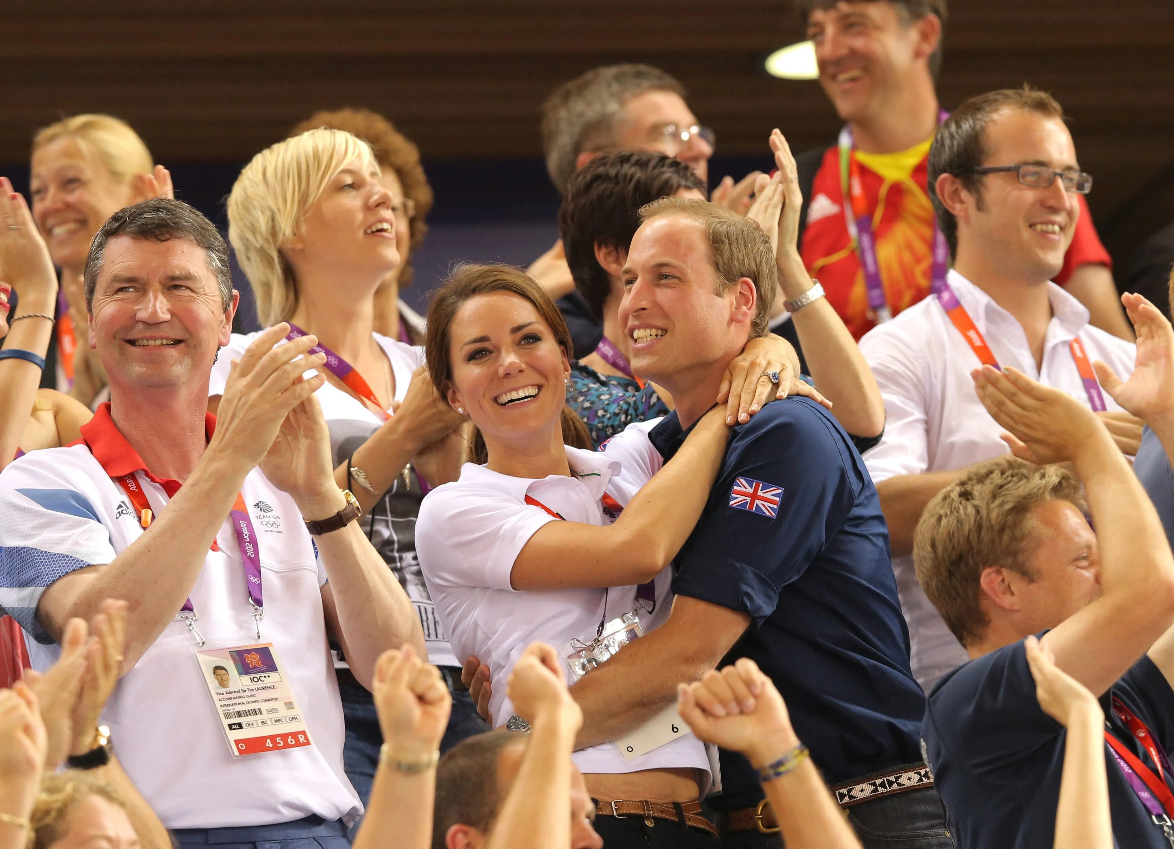 Prins William en zijn vrouw Catherine van Groot-Brittannië vliegen elkaar in de armen. Het stel juicht hier voor het Britse team tijdens de Olympische spelen in London.