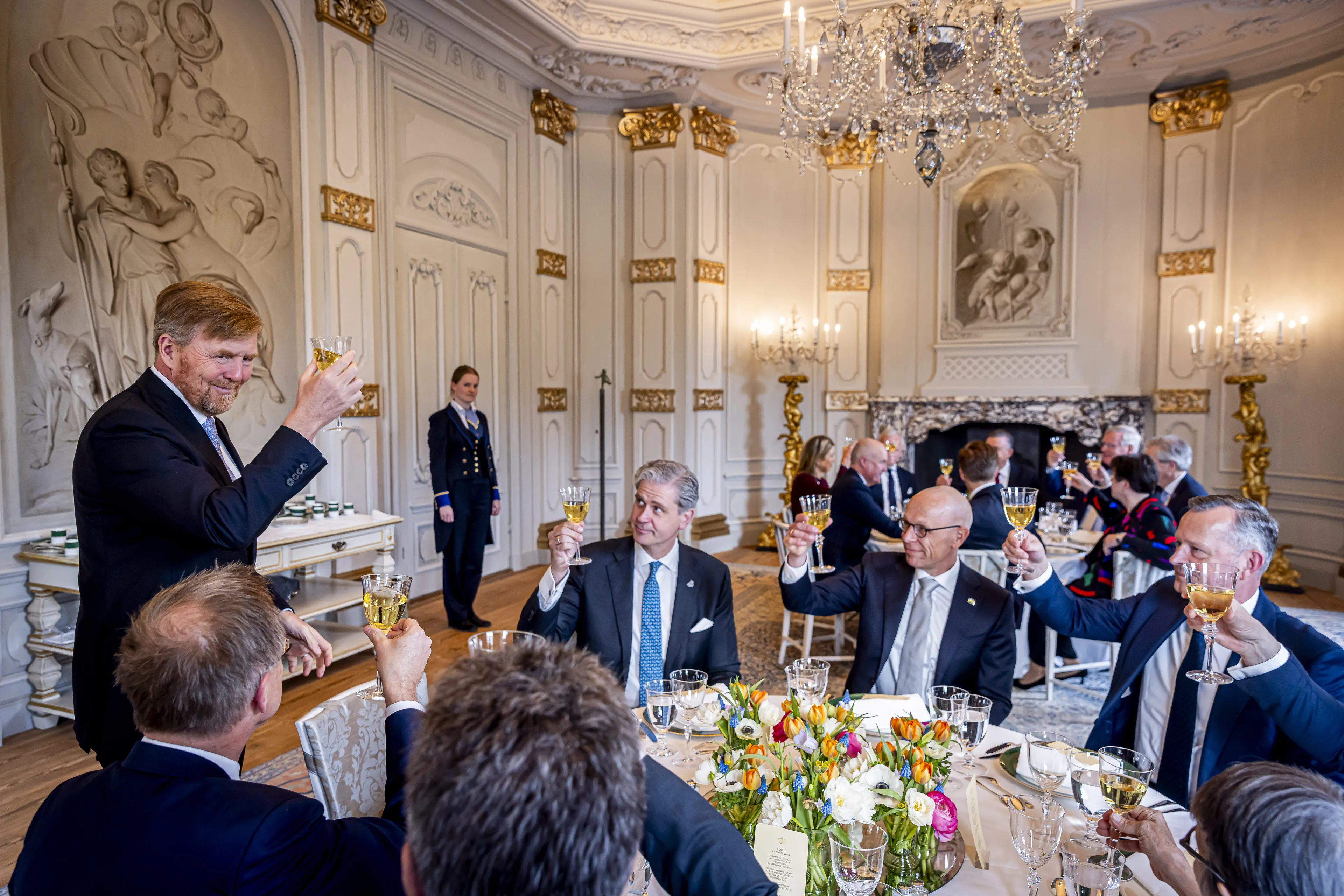 Voordat de lunch wordt opgediend, houdt koning Willem-Alexander een korte toespraak. "Ik hoop dat we weer een leuke, informele lunch kunnen hebben waar we de lokale problemen kunnen bespreken maar ook andere dingen", begint de koning. "Normaal gesproken zien we u snel bij een auto, bij binnenkomen of weggaan. Dan hebben we geen kans om met u te praten, dus als u iets te zeggen heeft gebruik deze lunch om de momenten die u anders niet gebruikt, te gebruiken", vertelt Willem-Alexander terwijl er een vrolijk gelach van het gezelschap klinkt. "Heel veel dank voor uw inzet voor Nederland en de provincies. Dank u wel", speecht de koning terwijl hij zijn glas heft.