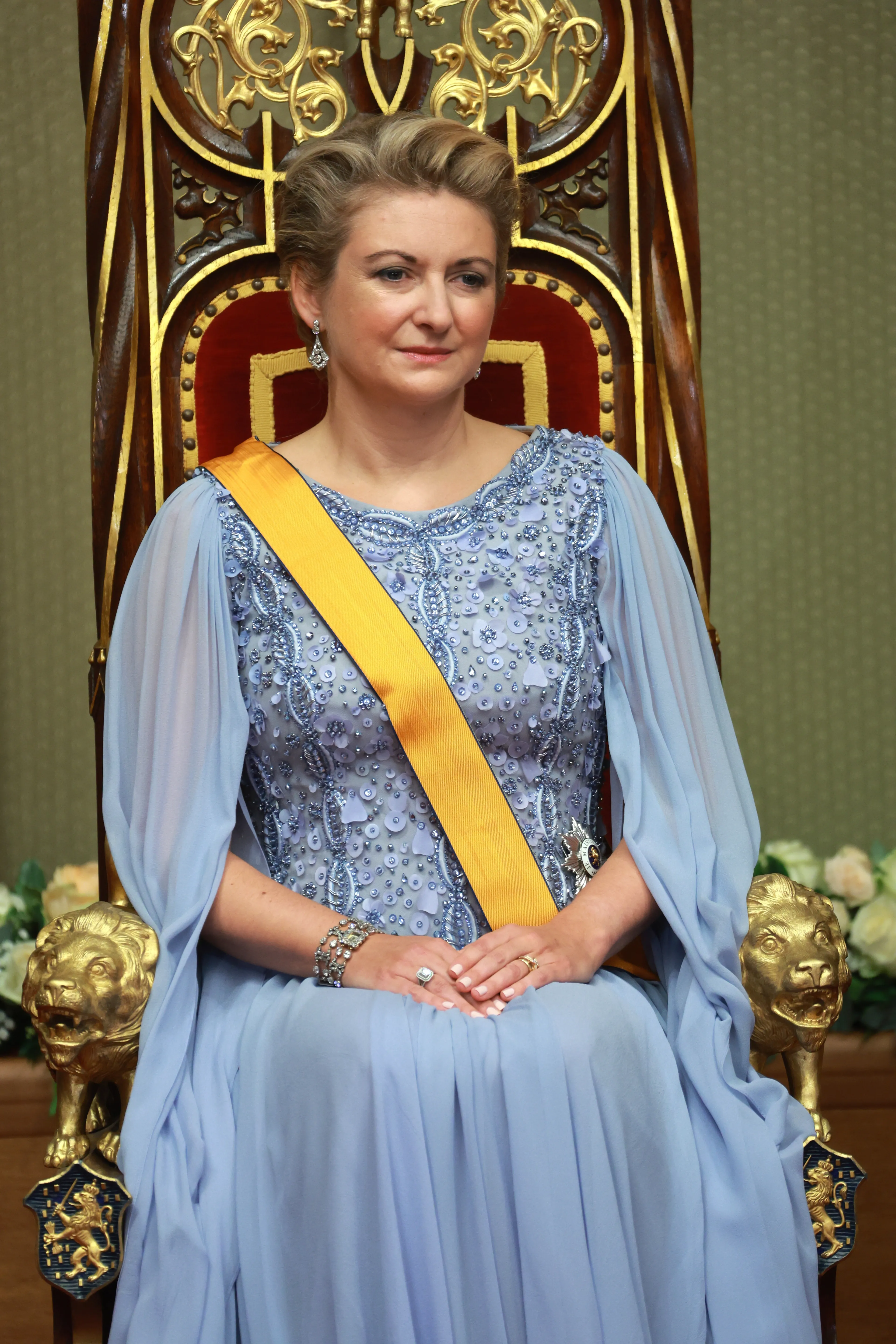 Stéphanie, de nieuwe groothertogin, staat vandaag in het middelpunt. De 41-jarige draagt vandaag een glinsterende galajurk van Elie Saab in lichtblauw.