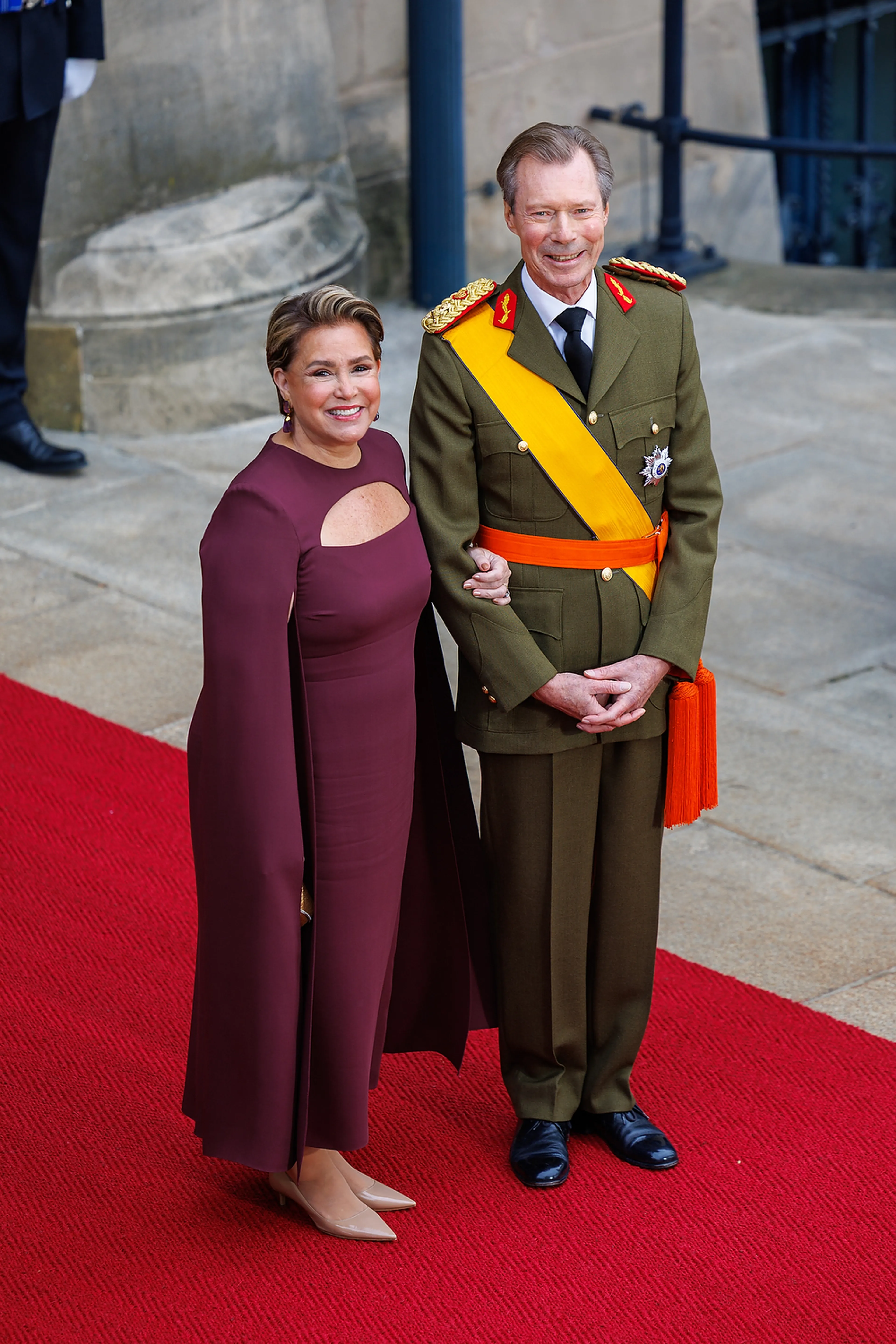 Maria Teresa kijkt vandaag toe hoe haar man afstand doet van de troon ten gunste van haar oudste zoon Guillaume. Op deze bijzondere dag draagt Maria Teresa een bordeauxrode capejurk van Natan met een speelse cut-out bij het decolleté.