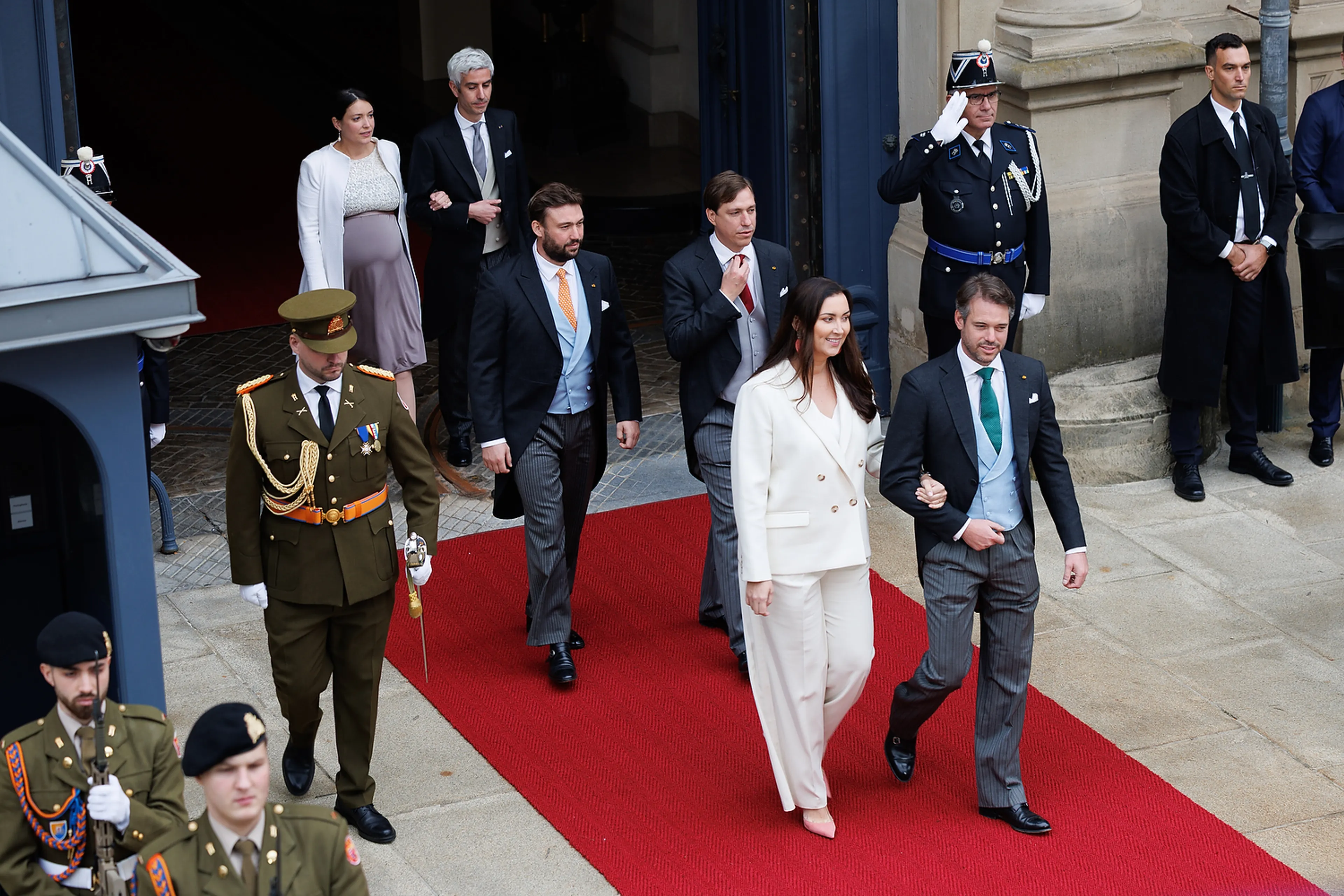 Prinses Claire is getrouwd met prins Félix, een jongere broer van de nieuwe groothertog Guillaume. Zij draagt op deze dag een wit oversized pak van Sézane.