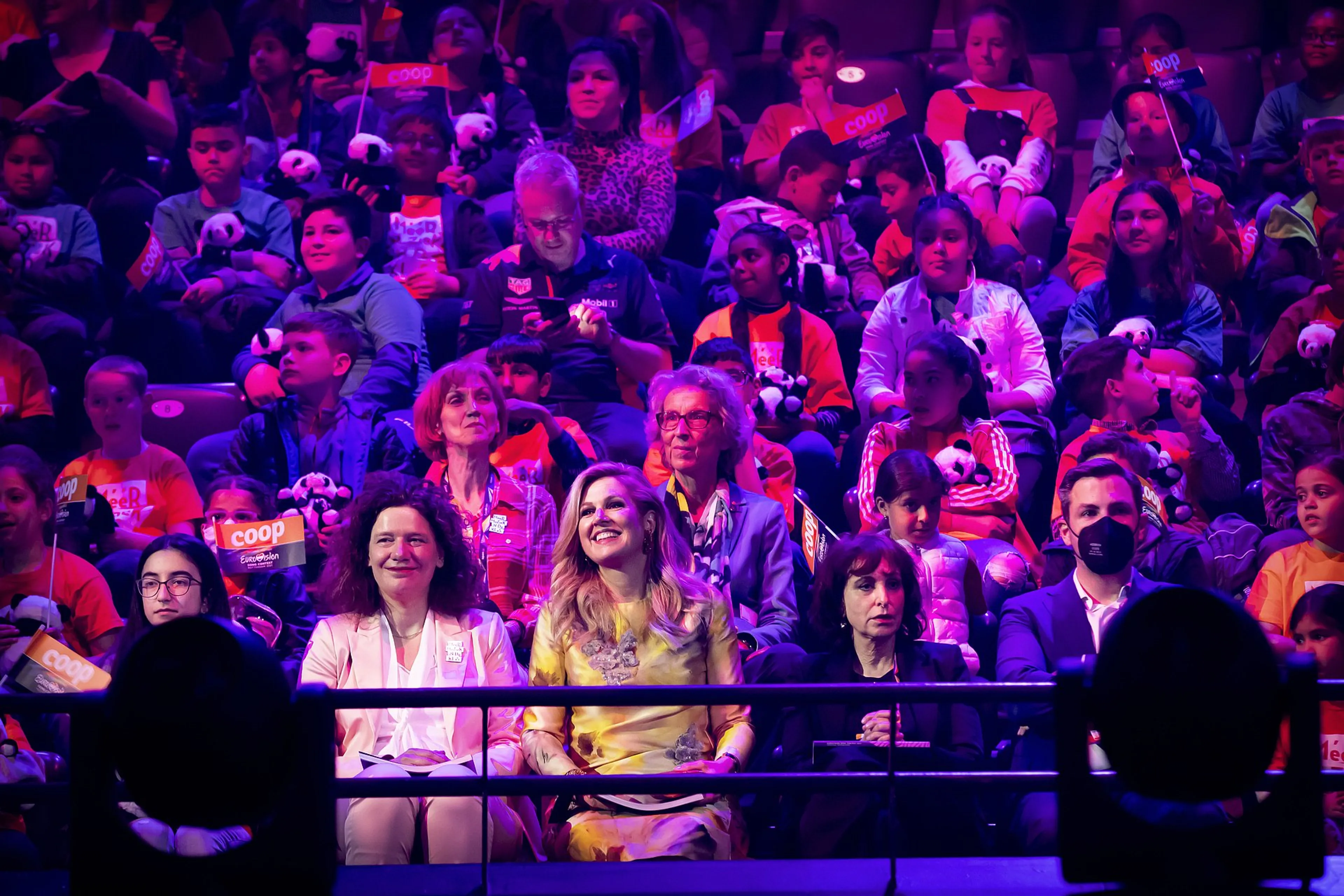Na een kledingwissel - van paars naar geel - keek koningin Máxima met een van de klassen van de Talmaschool mee bij de laatste repetitie voor de tweede halve finale, die donderdagavond plaatsvindt. Koning Willem-Alexander nam vorige maand al een kijkje in Rotterdam.