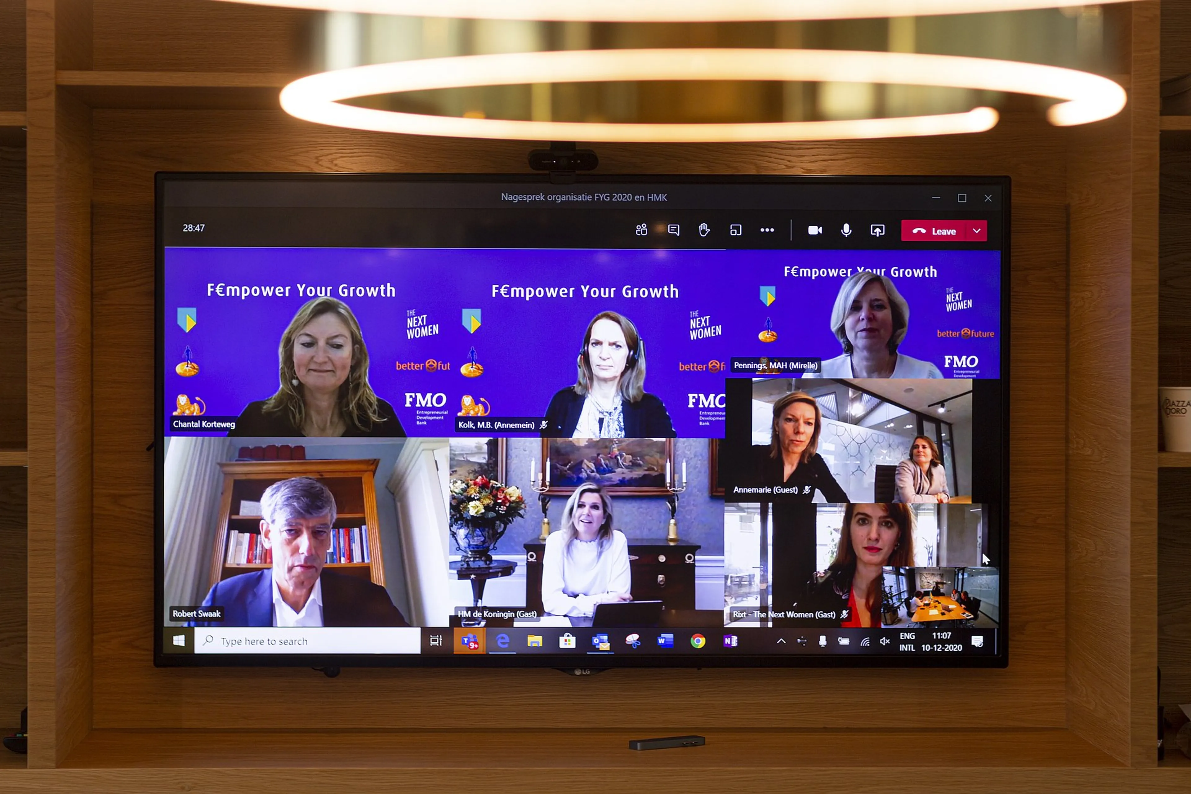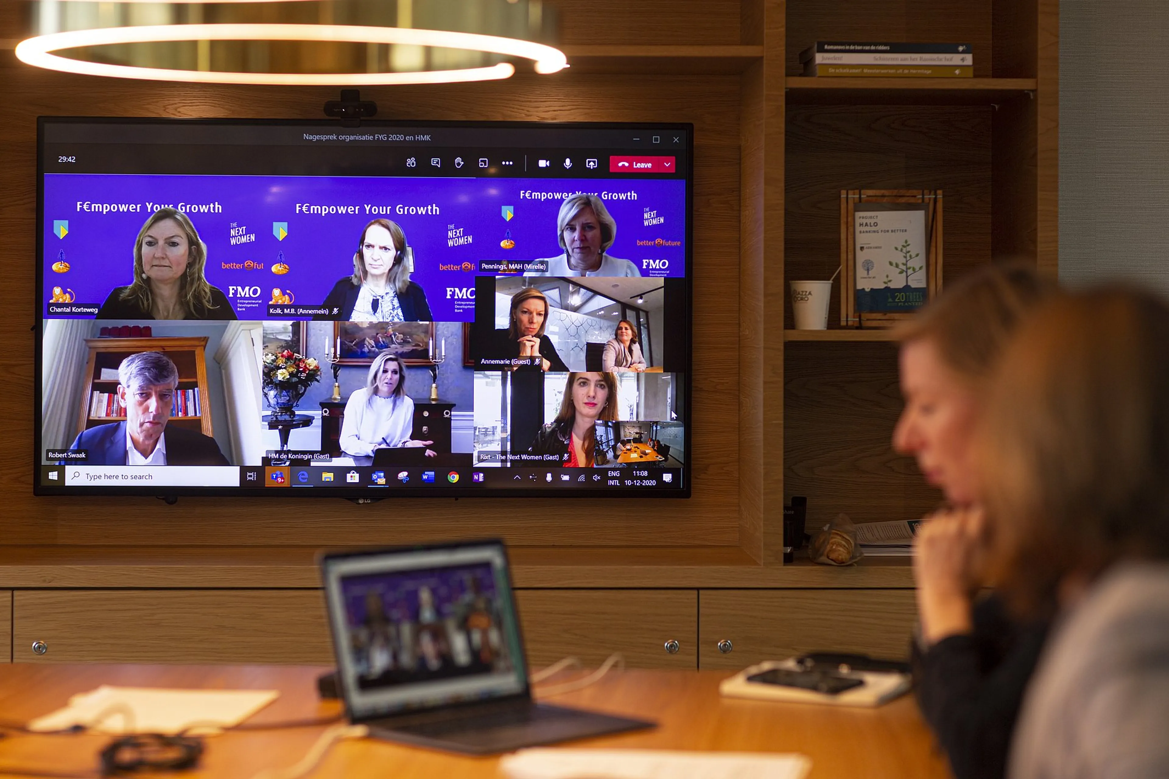 Koningin Máxima heeft donderdag de slotbijeenkomst van het F€mpower Your Growth Program 2020 voor vrouwelijke ondernemers bijgewoond. Dat deed de koningin gewoon vanuit eigen huis. In Paleis Huis ten Bosch had ze een directe videoverbinding met de overige deelnemers.