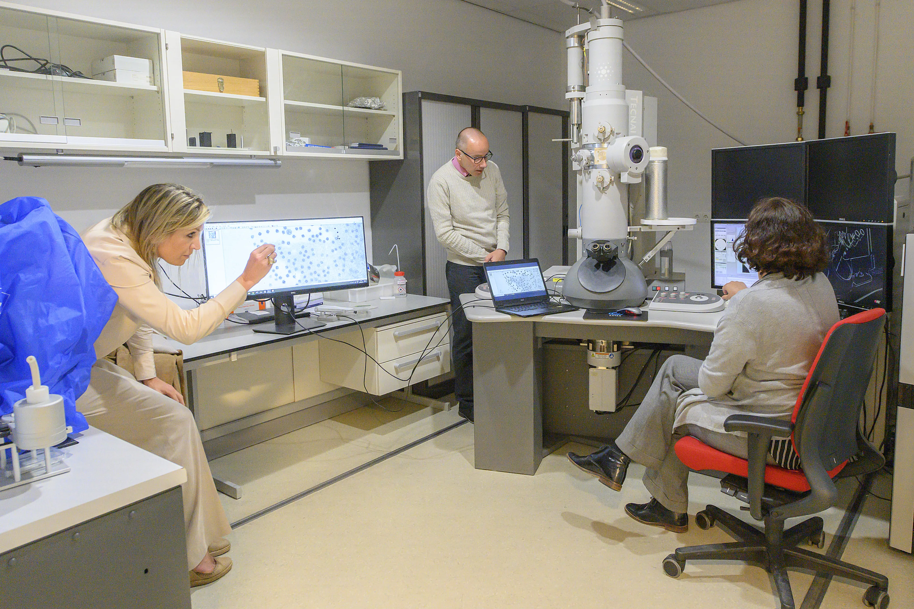 De koningin sprak in het ziekenhuis met medewerkers van de afdeling Medische Microbiologie. Van virologen en analisten kreeg ze uitleg over hun werkzaamheden in het lab bij het ontwikkelen en testen van vaccins en antivirale middelen. Daarnaast kreeg Máxima in een demonstratie met behulp van een elektronenmicroscoop te zien welke schade het virus in geïnfecteerde cellen aanricht.