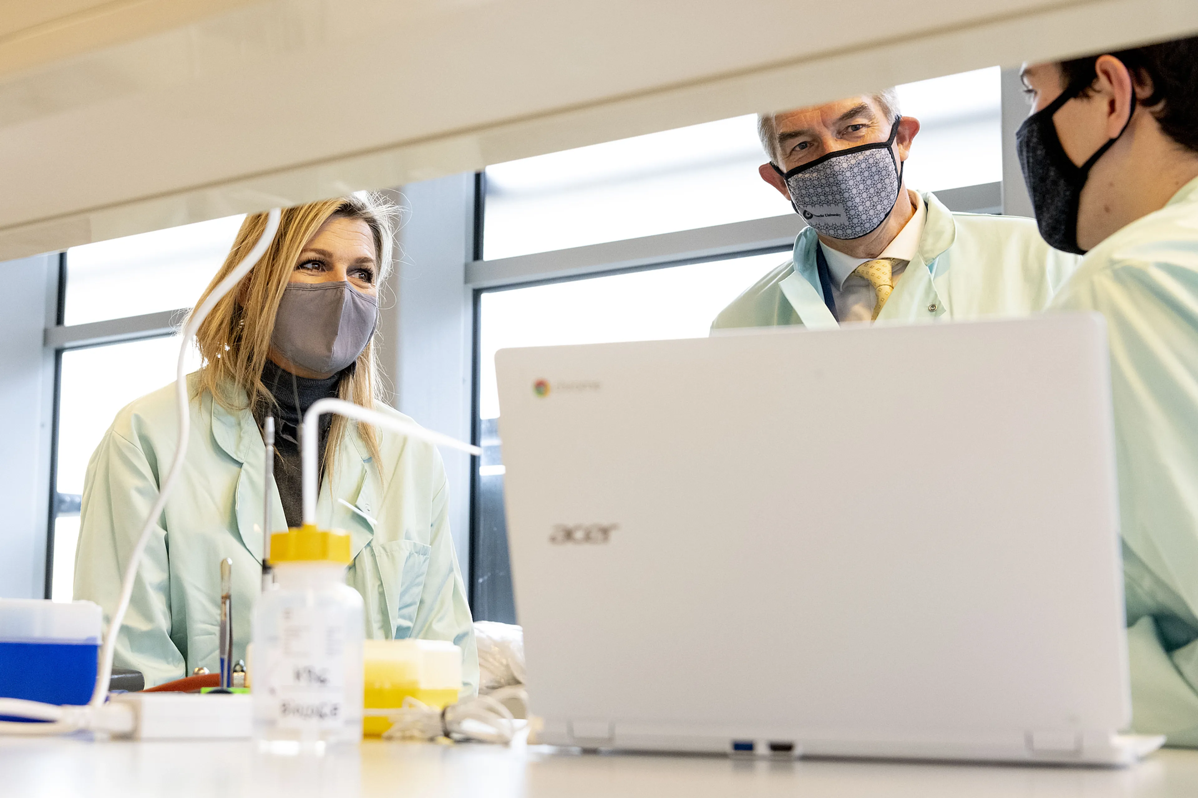 Koningin Máxima heeft dinsdag een werkbezoek afgelegd aan de Universiteit Utrecht. Gekleed in een lichtgroene 'doktersjas' woonde ze er onder meer een biologiepracticum bij.