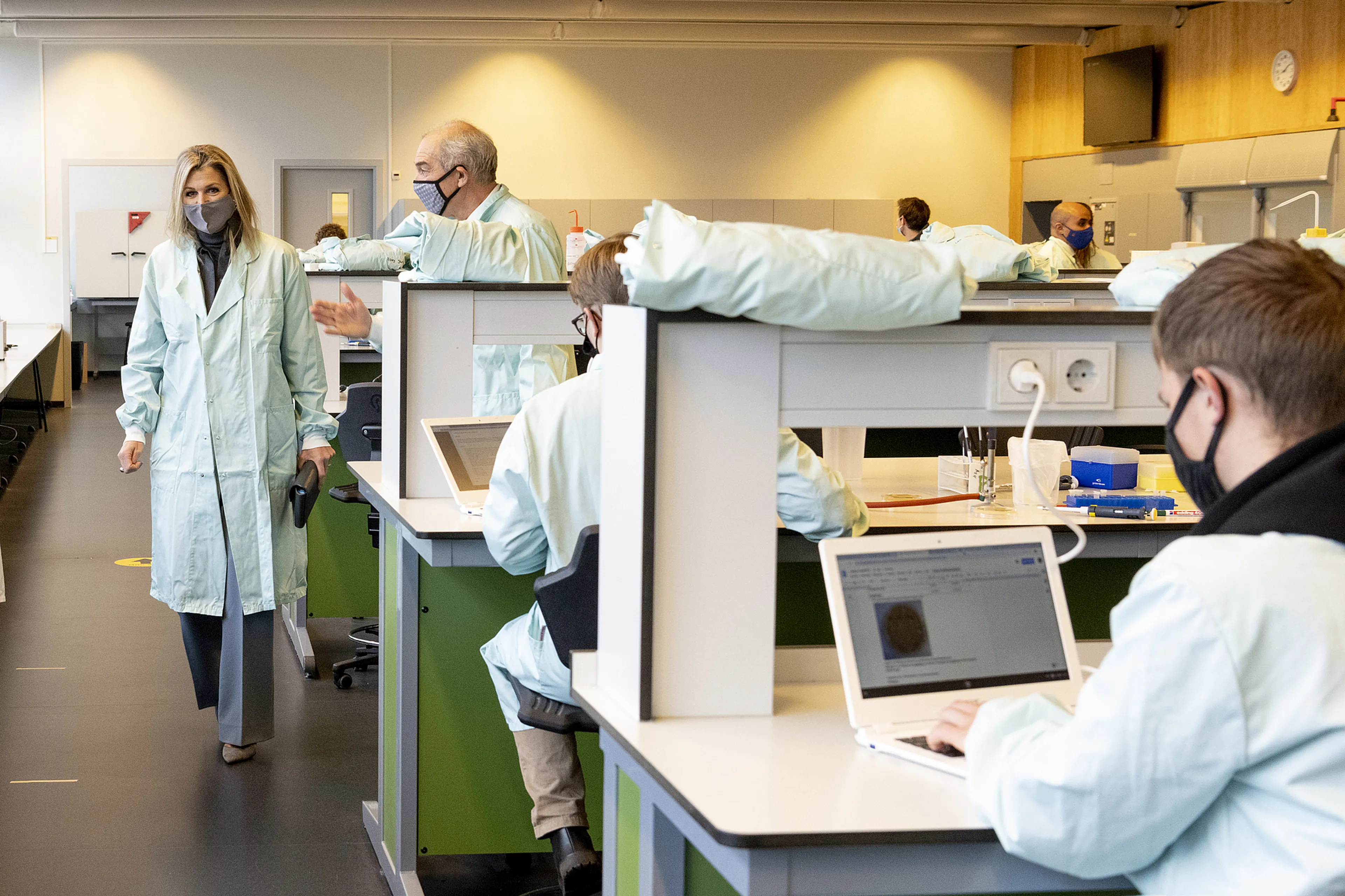 Máxima ging hier met coördinatoren, studenten en docenten over in gesprek, onder meer tijdens het biologiepracticum. De koningin kreeg tijdens de les te horen wat nog wel kan met de geldende maatregelen en hoe dat in zijn werk gaat.