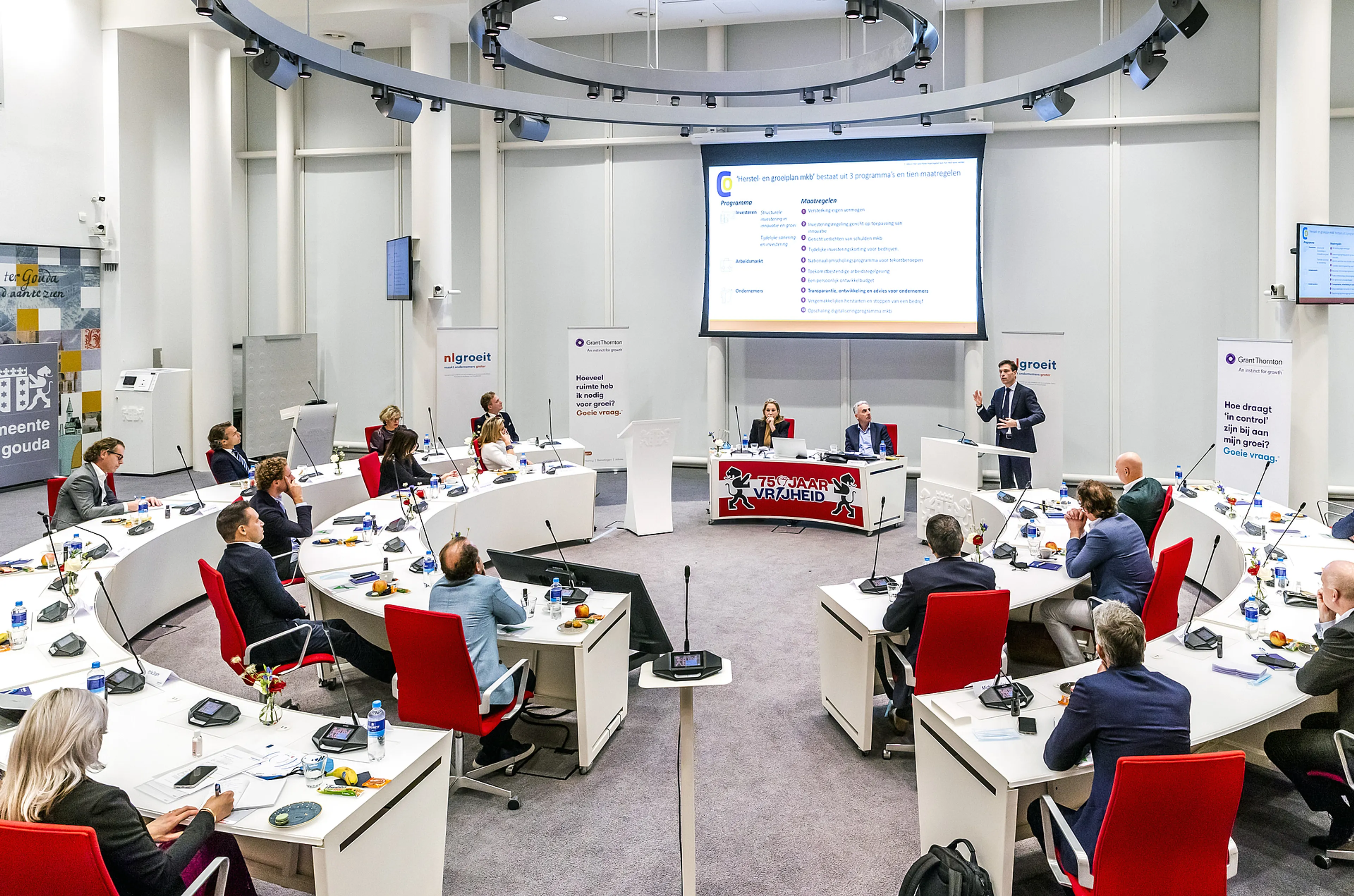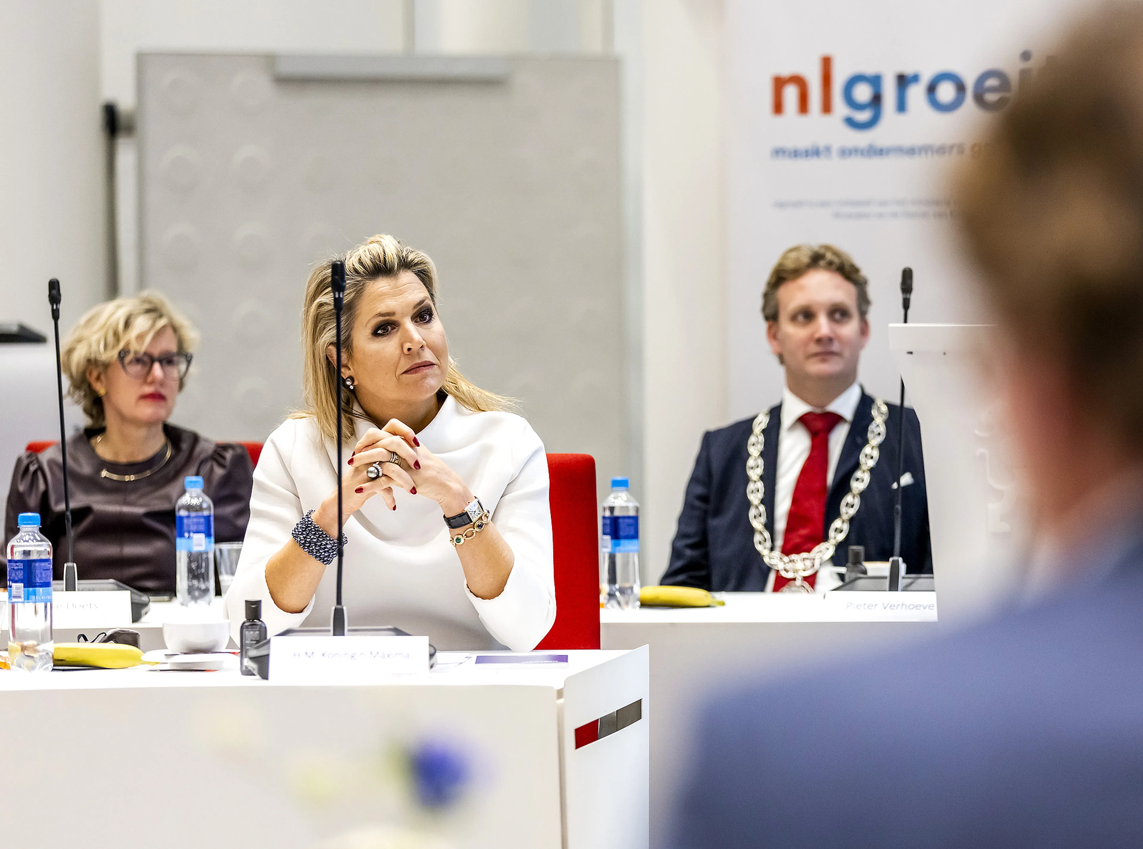 Koningin Máxima heeft deelgenomen aan een bijeenkomst van NLgroeit in Gouda. In de ochtend schoof zij aan om te praten over het platform, dat zich onder meer inzet voor het ondersteunen van ondernemers bij hun groei en ontwikkeling.