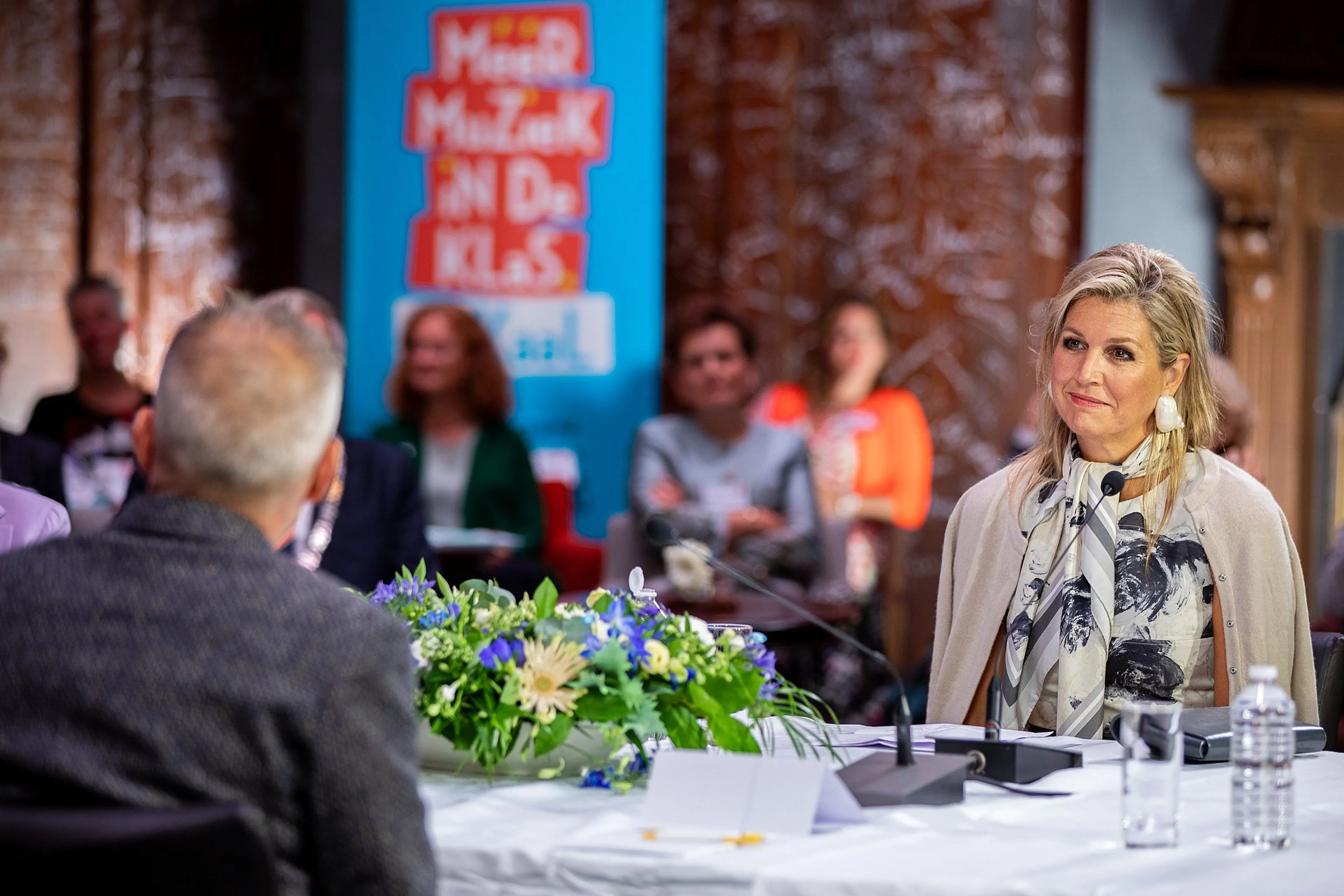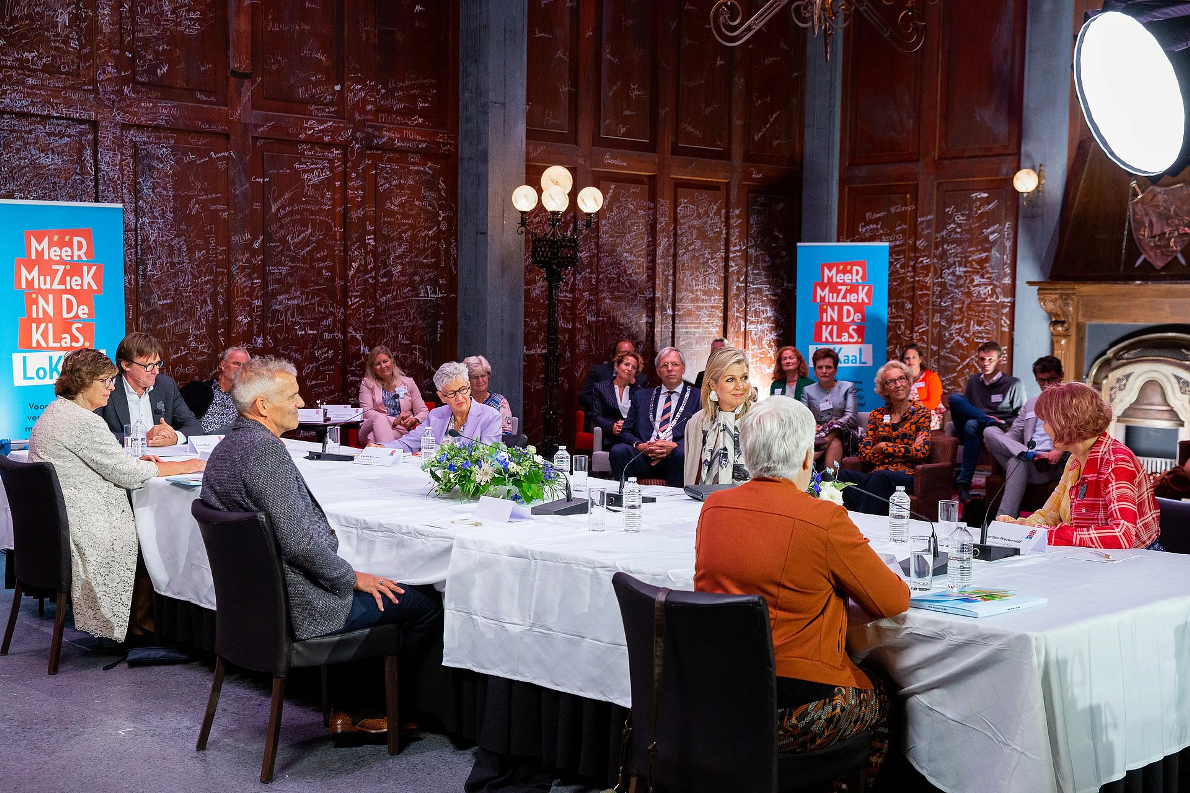 Koningin Máxima was niet alleen gekomen om te luisteren maar nam zelf ook aan de gesprekken deel. Ze opperde dat nog duidelijker moet worden gemaakt hoe belangrijk muziekonderwijs is voor de cognitieve ontwikkeling van kinderen. Als dat wordt benadrukt moet het makkelijker zijn om twijfelende scholen over de streep te trekken.