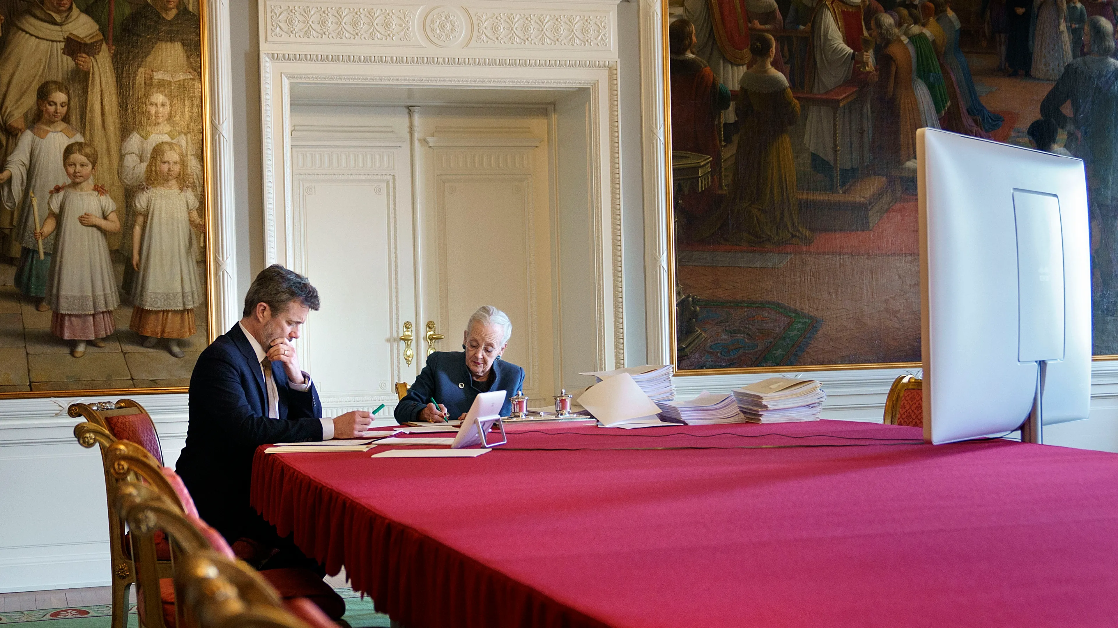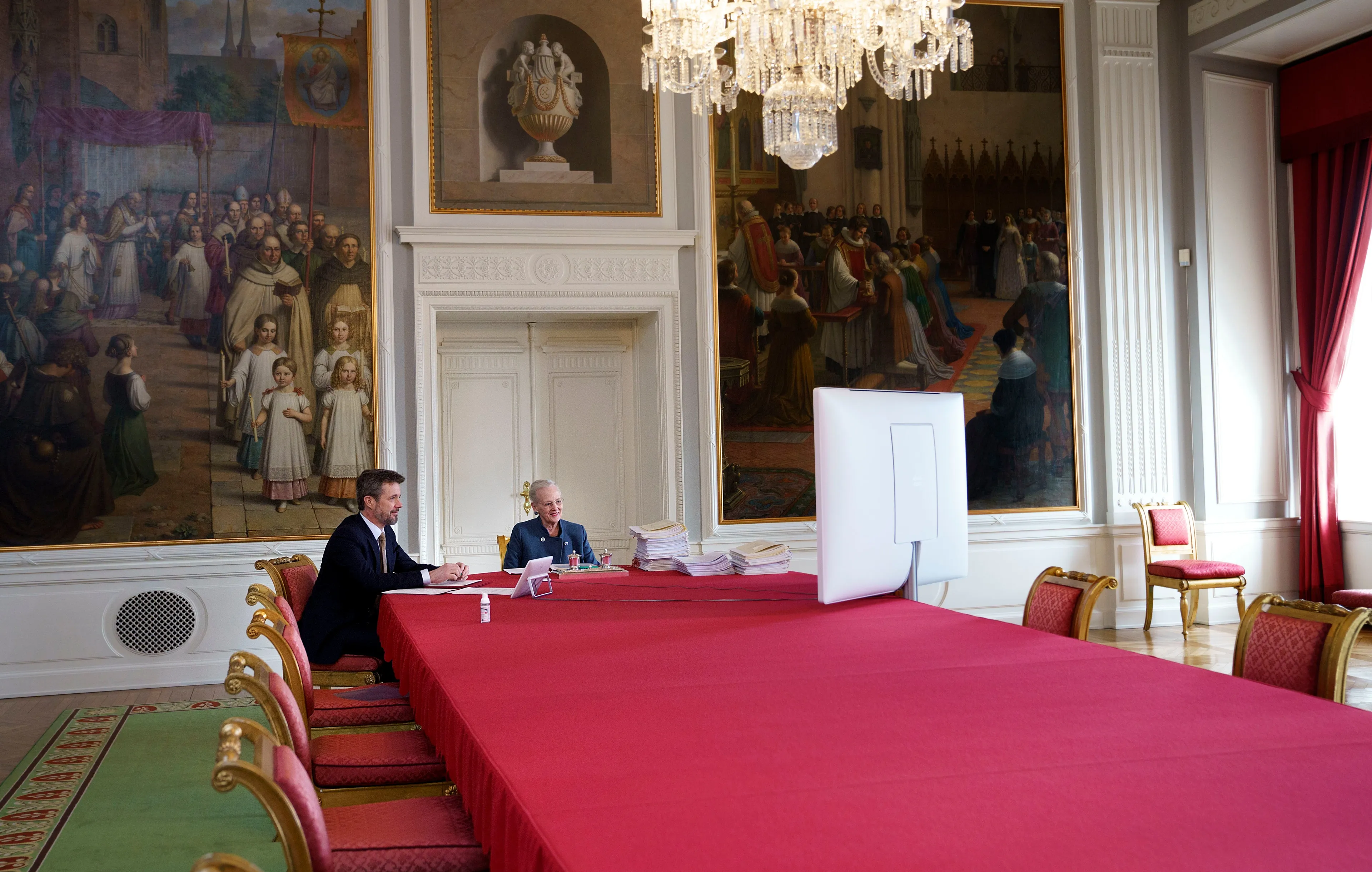 Voor het eerst in de Deense geschiedenis wordt een zitting van de Raad van State volledig digitaal gehouden. Vanwege de coronacrisis is besloten om op afstand bijeen te komen, meldt het Deense hof. Koningin Margrethe en haar zoon kroonprins Frederik loggen samen in vanuit Christiansborg Slot in Kopenhagen. De ministers doen dat vanuit de verschillende regeringsgebouwen.
