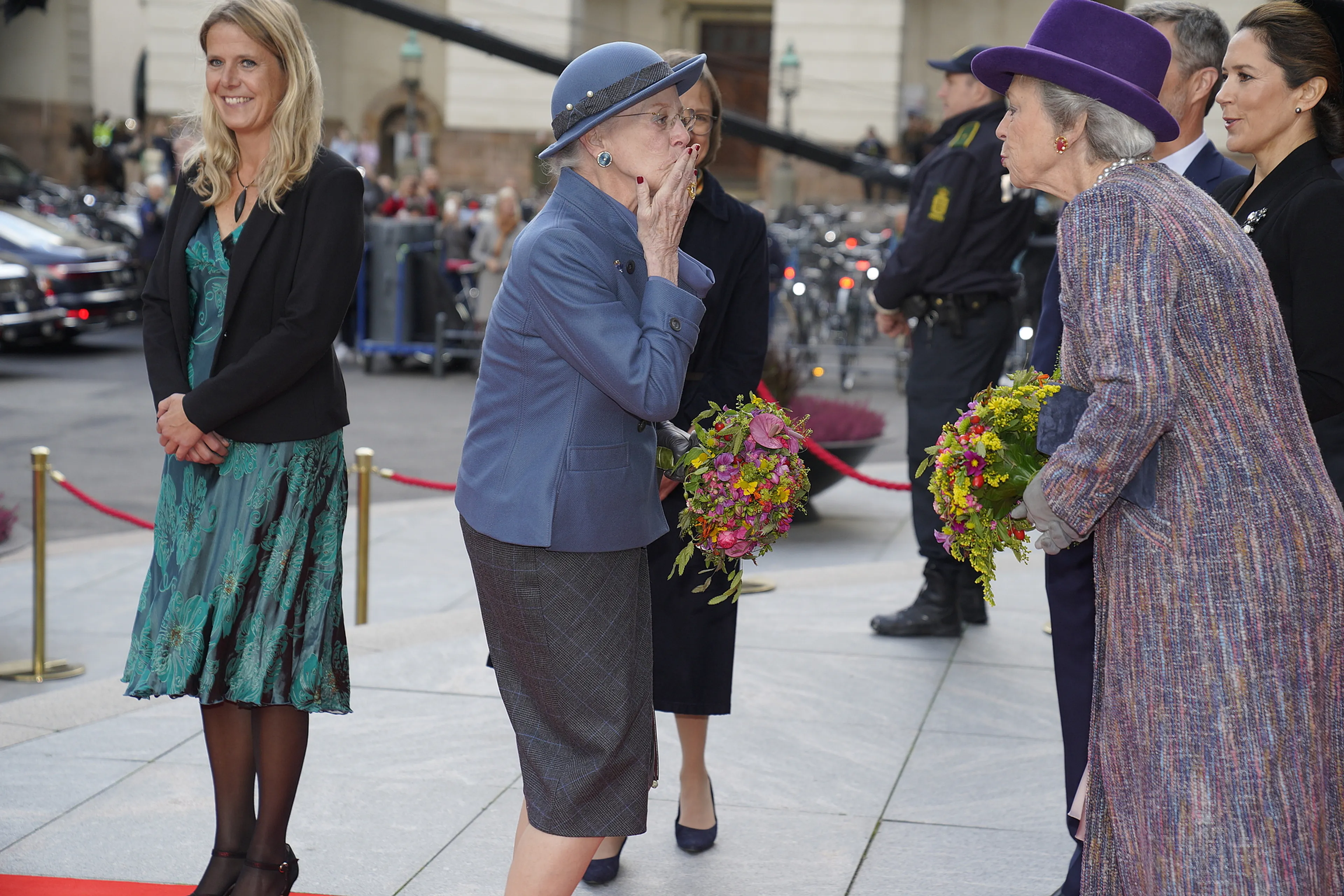 De coronamaatregelen zorgden voor een opvallend tafereel. Bij aankomst begroette Margrethe haar jongere zus Benedikte niet met een handdruk of omhelzing, maar blies ze een kus naar haar.
