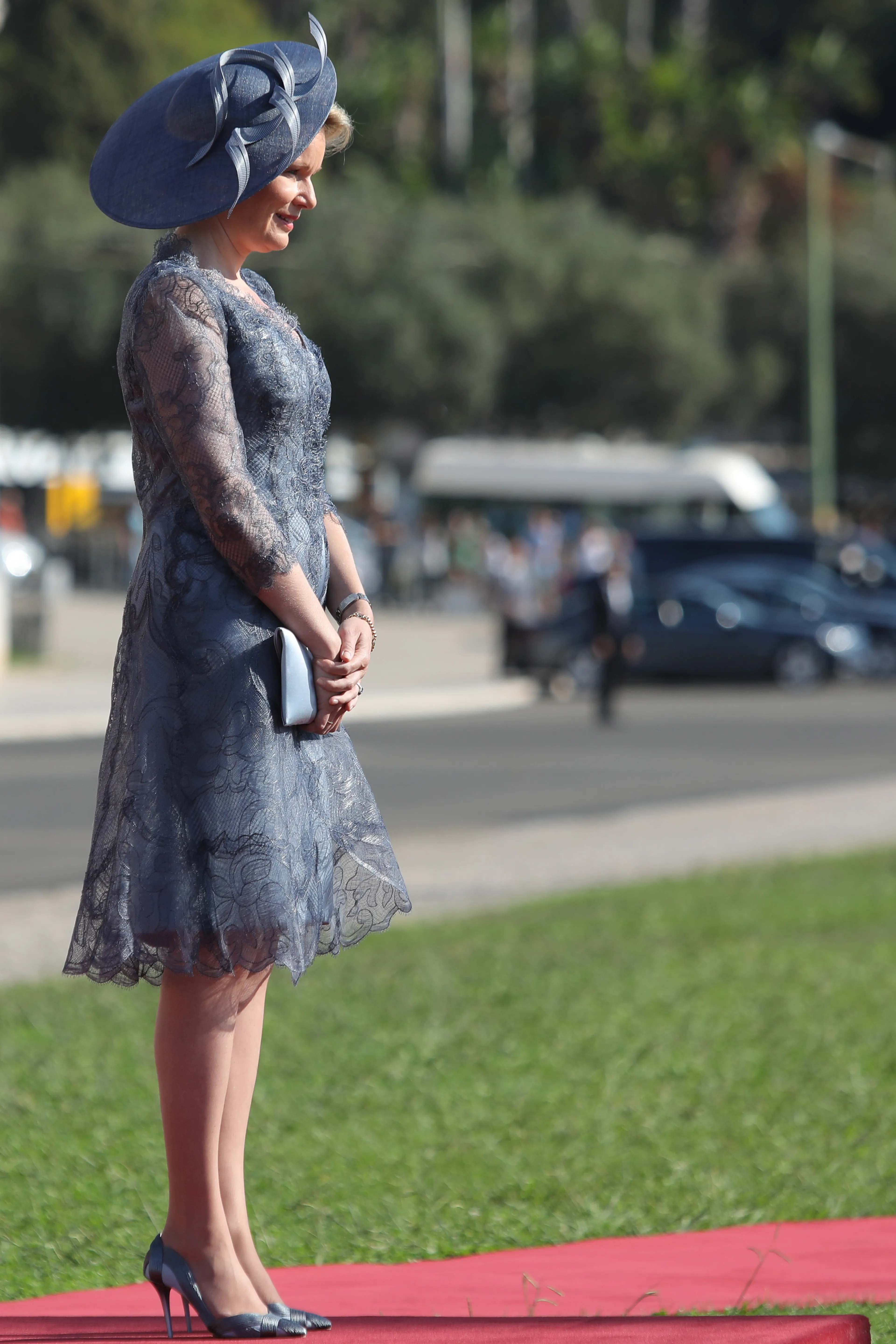 Koningin Mathilde heeft voor de eerste dag van het staatsbezoek gekozen voor een bekende outfit. Ze draagt een creatie van het Italiaanse modehuis Giorgio Armani: een grijze mouwloze satijnen japon met eroverheen een kanten mantel met lange mouwen. De bijpassende hoed is van de Britse ontwerper Philip Treacy.