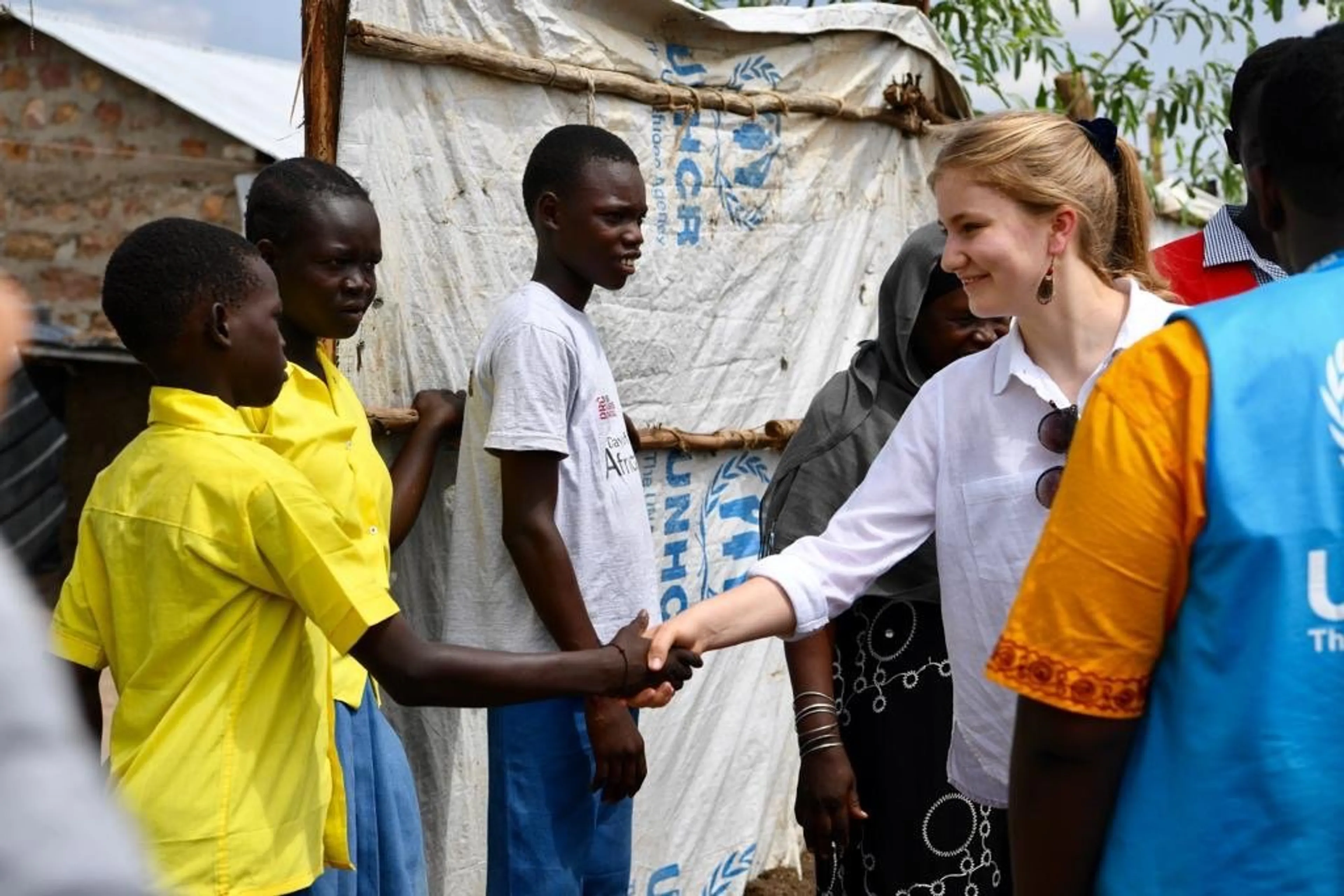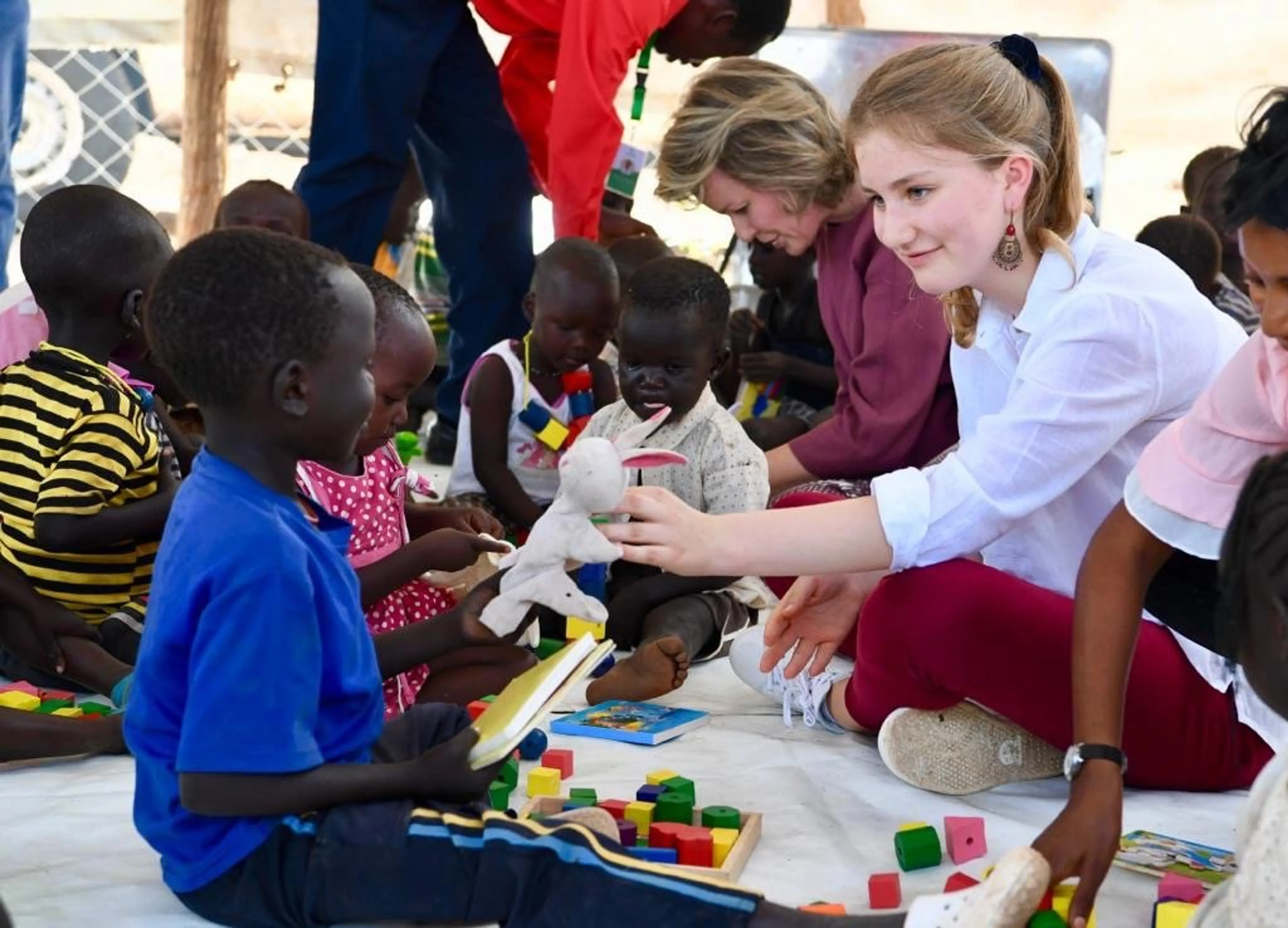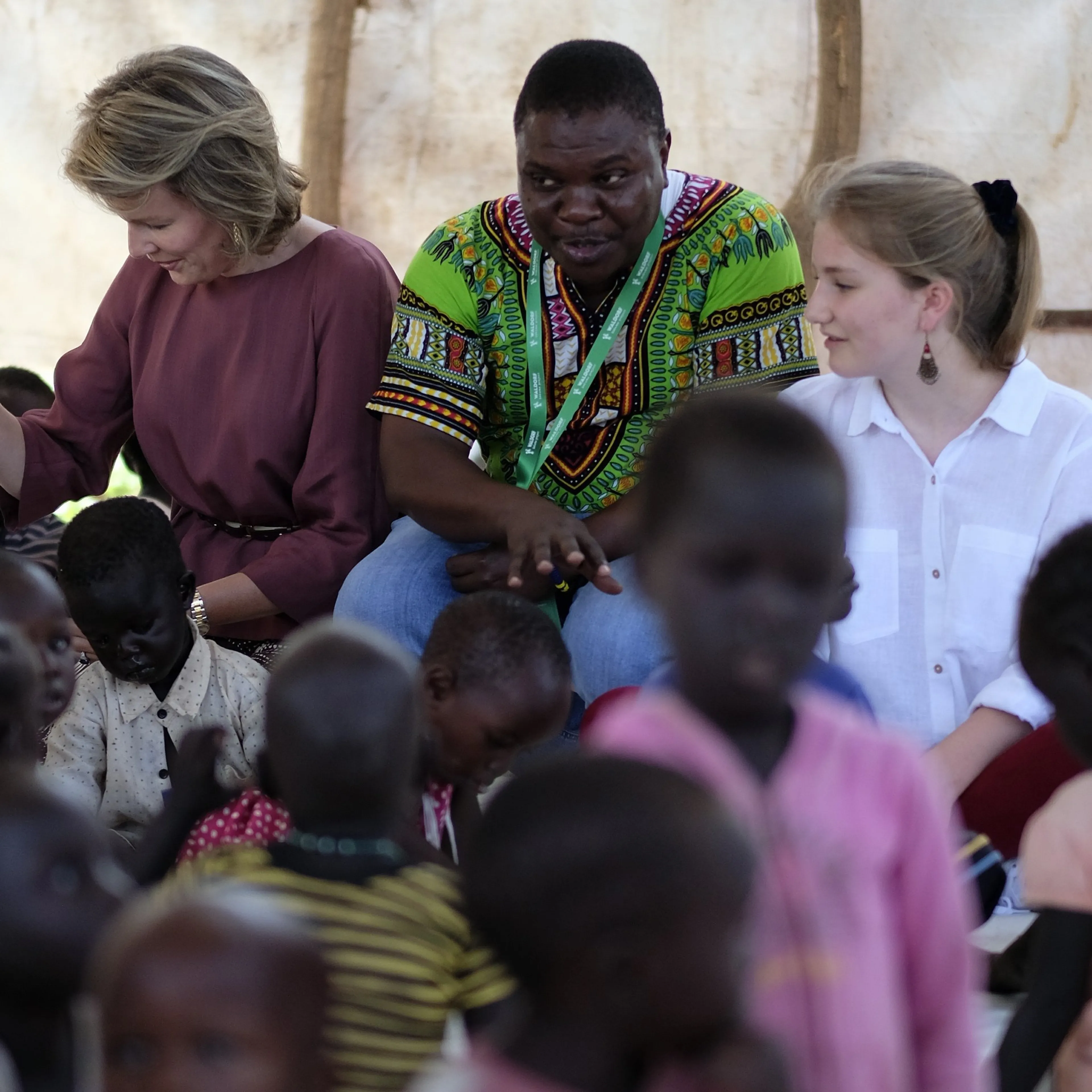 Mathilde en de 17-jarige Elisabeth werden verwelkomd door dansende kinderen en kinderen die muziek maakten met zelf gemaakte instrumenten van afval. Tijdens het bezoek mocht de prinses een baby van vijf maanden vasthouden.