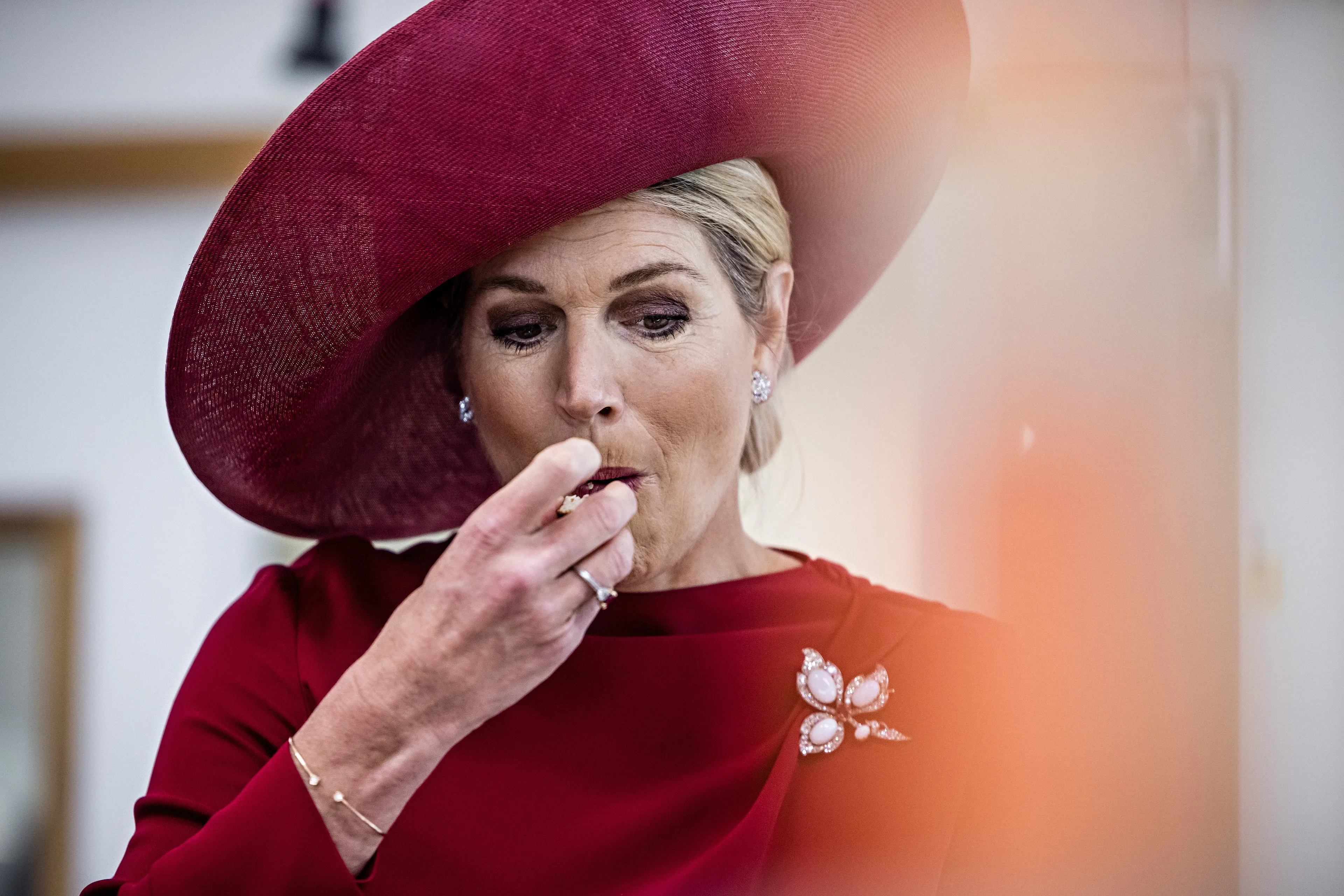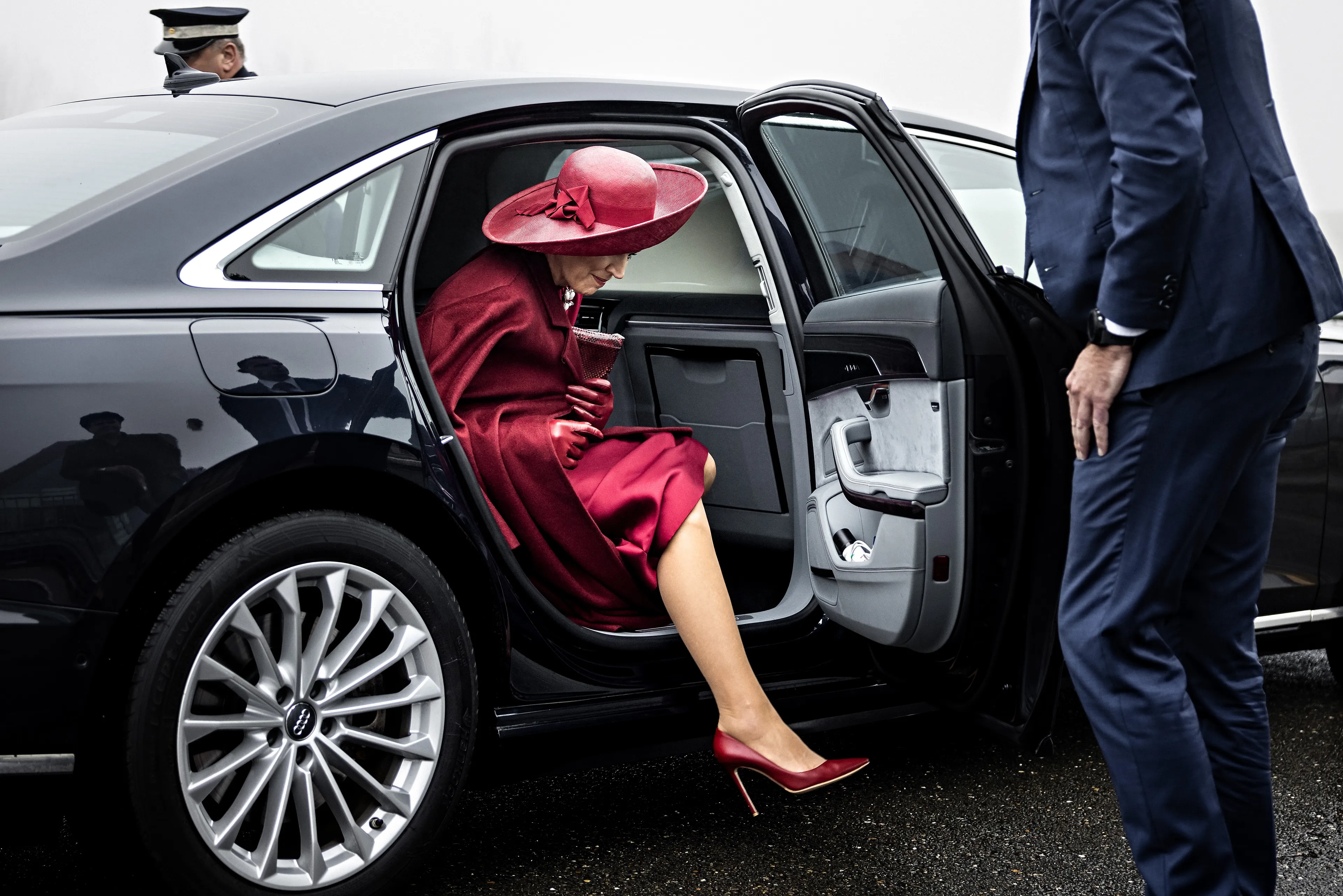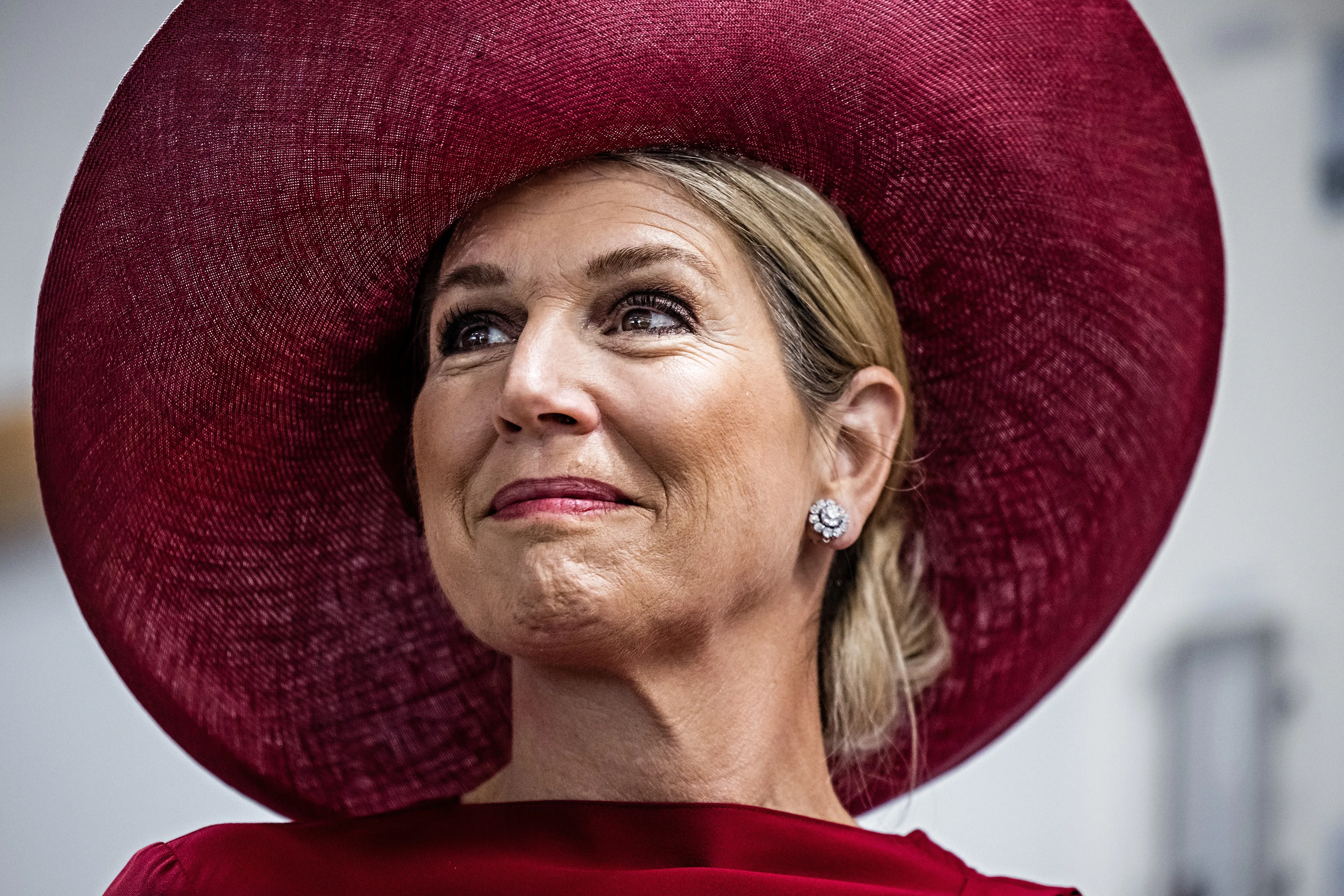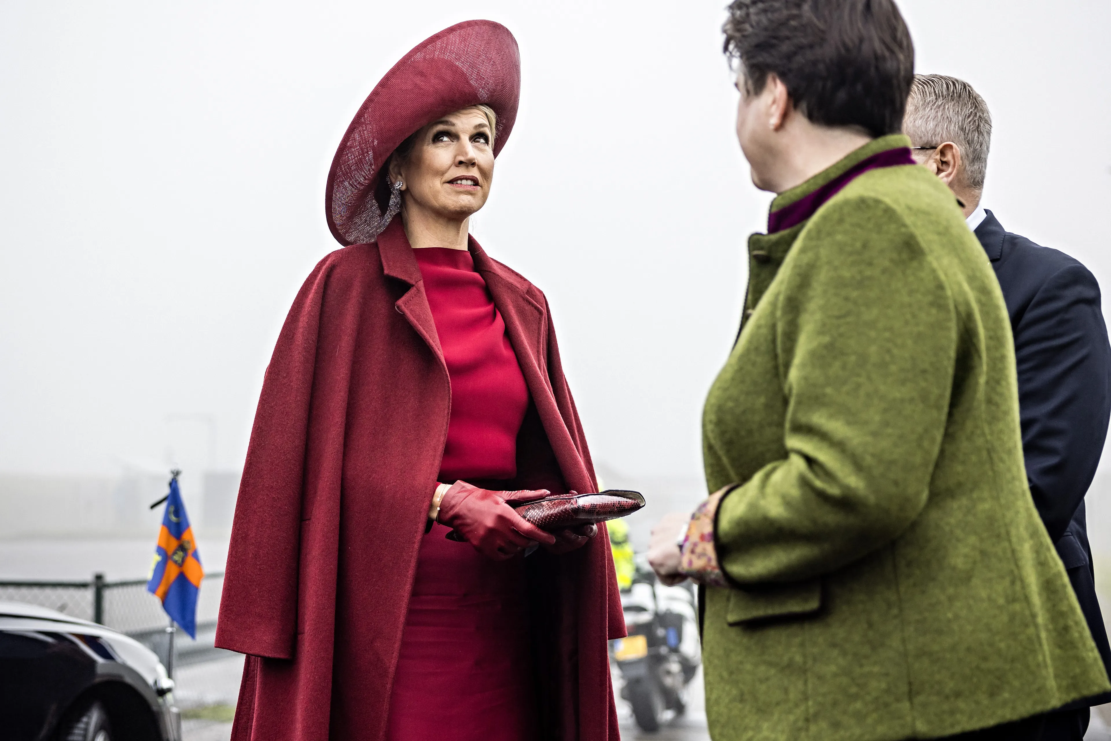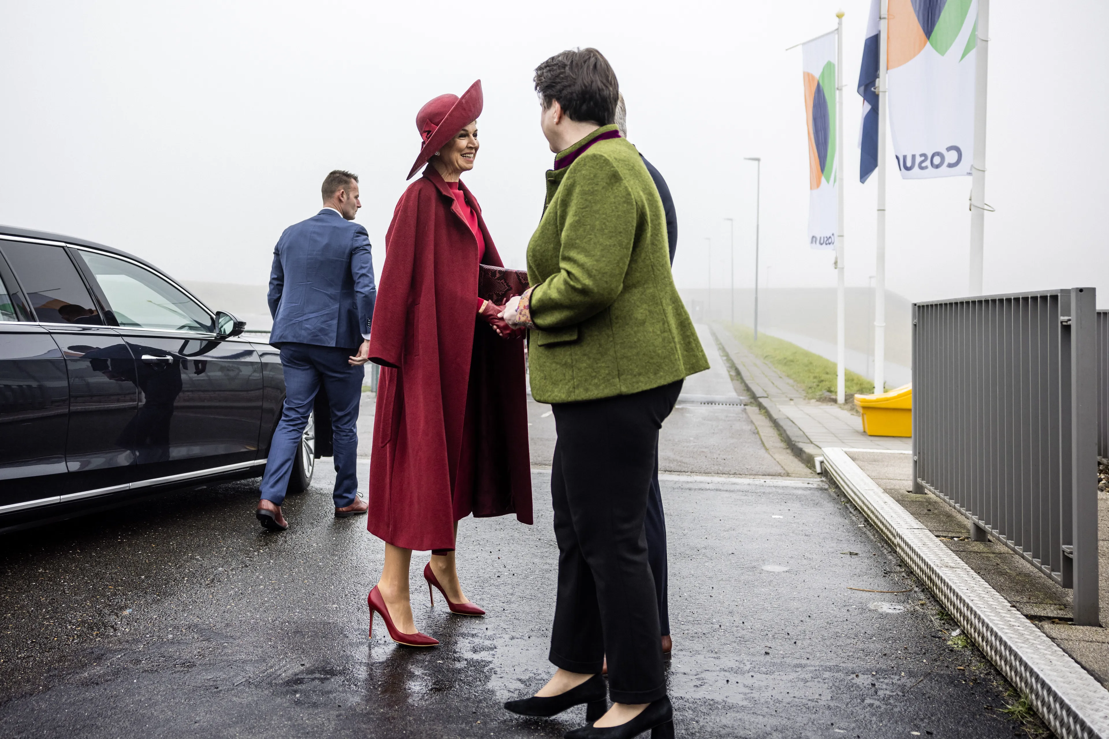Voor het mistige bezoek kiest koningin Máxima voor een bordeauxrode set van Natan bestaande uit een rok en een top met lange mouwen. Een kleur die Catherine, de prinses van Wales gisteren ook droeg voor een bezoek aan een ziekenhuis. De outfit van Máxima hebben we al eens eerder gezien bij de welkomstceremonie voor koning Felipe en koningin Letizia in april 2024.