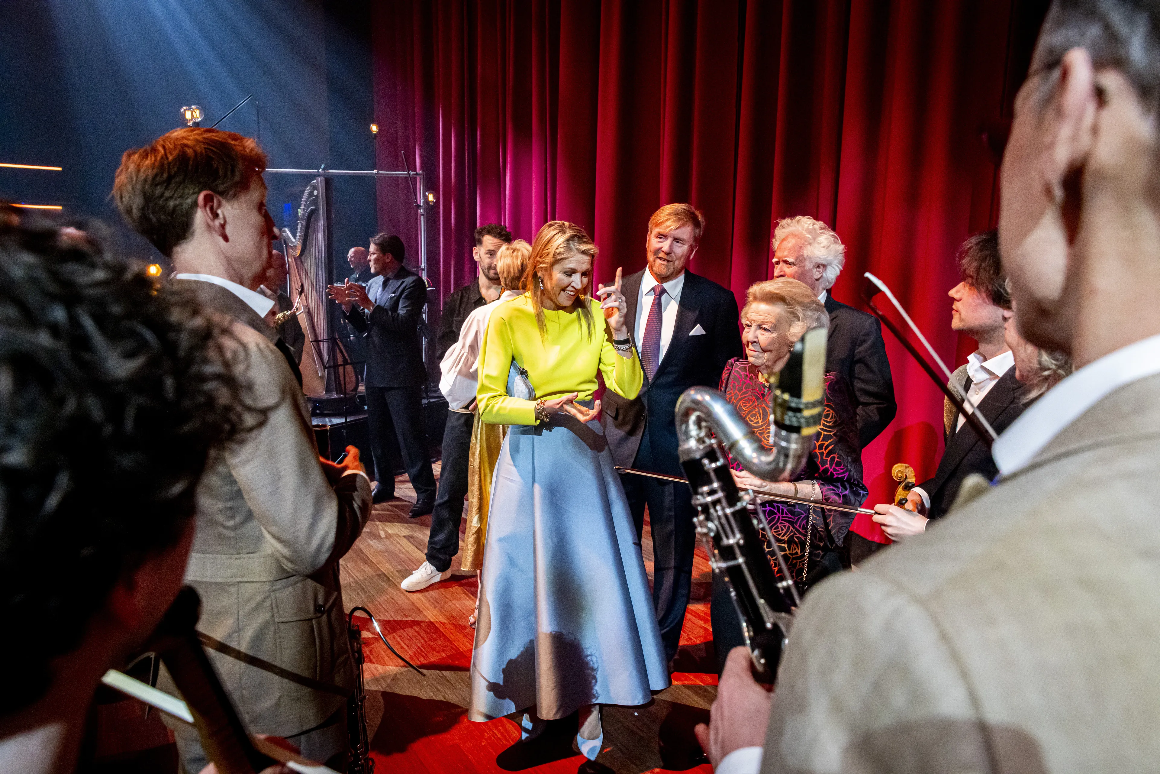 We weten natuurlijk niet hoe het met jullie zit, maar over het algemeen is kanariegeel niet het meest makkelijke kleur om mee te combineren. Koningin Máxima denkt daar anders over, want tijdens het Koningsdagconcert in 2024 verscheen ze in een bonte combinatie. Een lichtblauwe satijnen rok van modehuis Natan met daarop een felgele top.