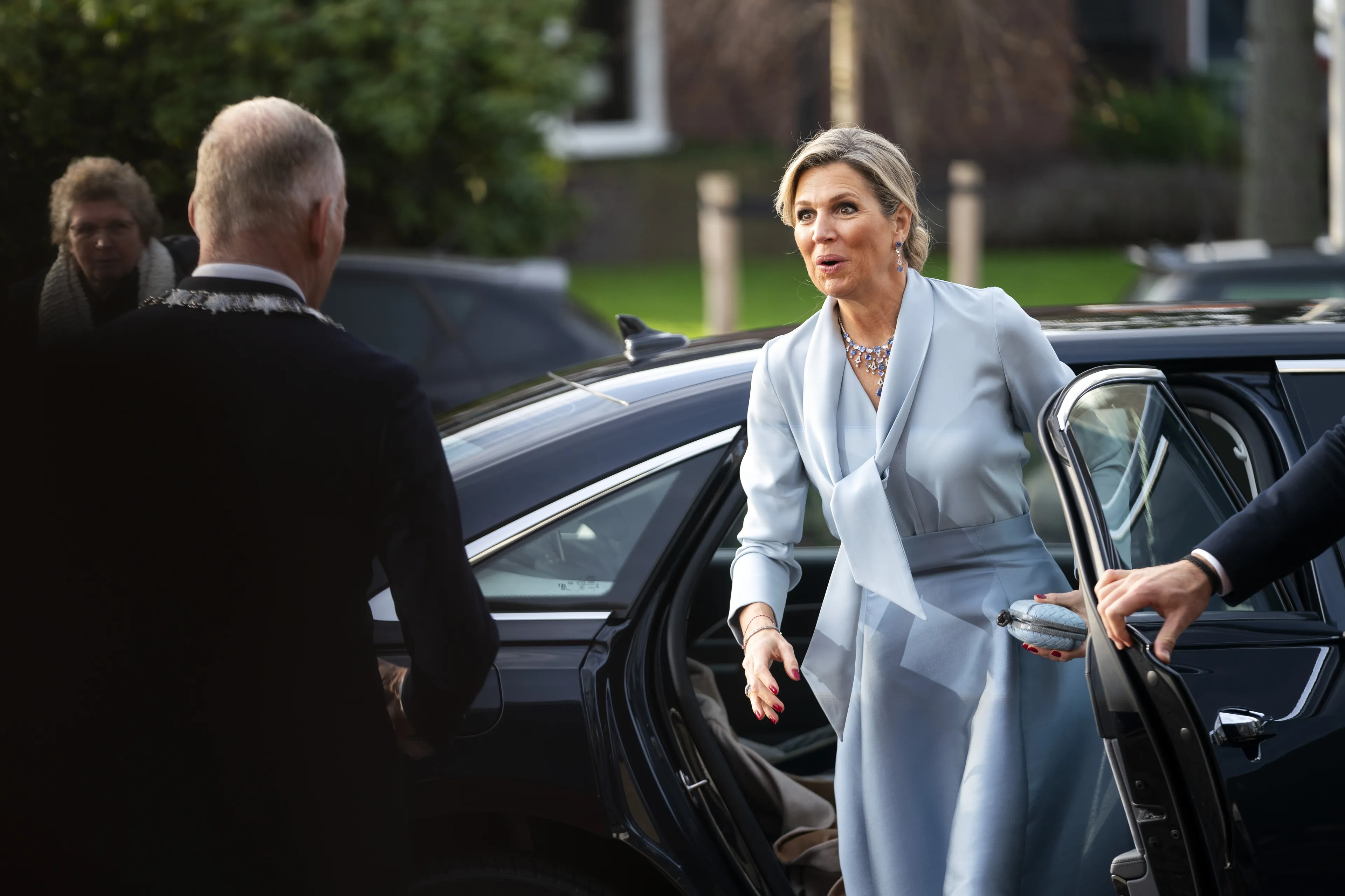 Zoals gezegd droeg koningin Máxima donderdag een lichtblauwe outfit. Ze combineerde een blouse met een lange zijden rok. Het geheel, dat overigens nieuw is in Máxima's kledingkast, doet denken aan de japon van het fictieve tekenfiguur Assepoester.