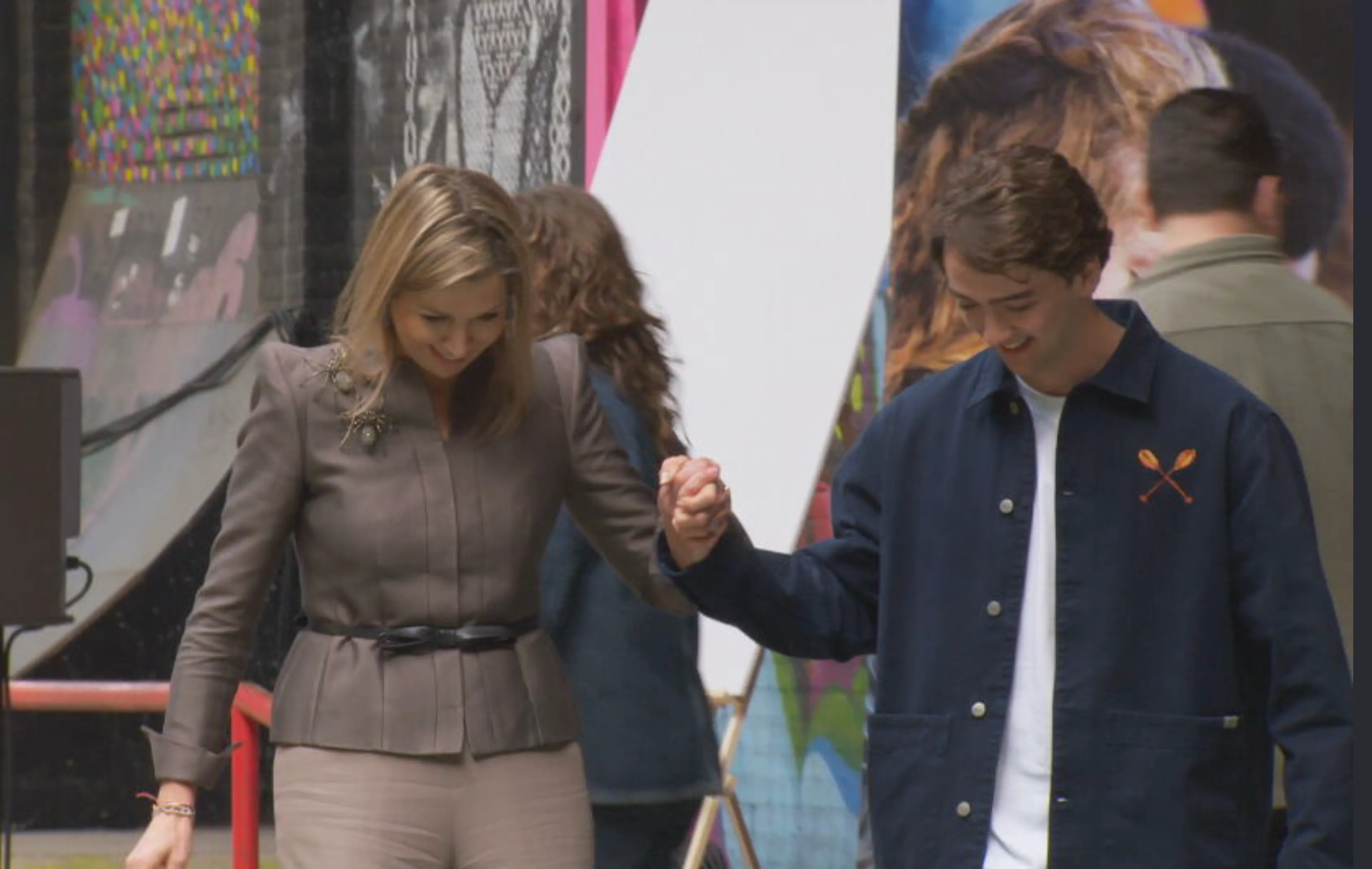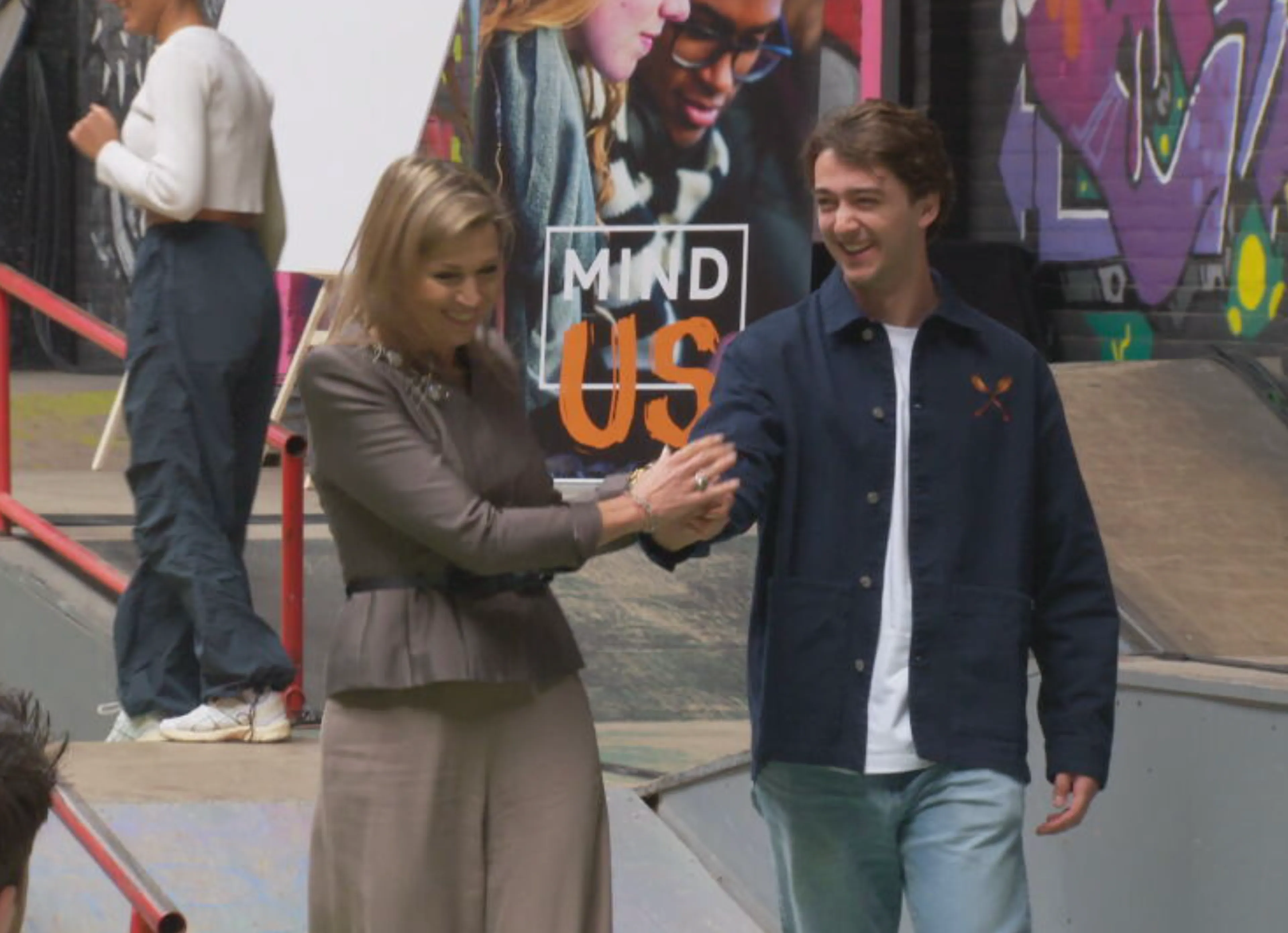 Koningin Máxima lanceert de nieuwe stap van MIND Us op het podium, in aanwezigheid van een aantal jongeren. Na afloop van de lancering heeft de koningin, die een paar torenhoge pumps draagt, moeite om van het ietwat onhandige afstapje af te komen. Een galante jongeman schiet de hulp en Máxima pakt glimlachend zijn hand.