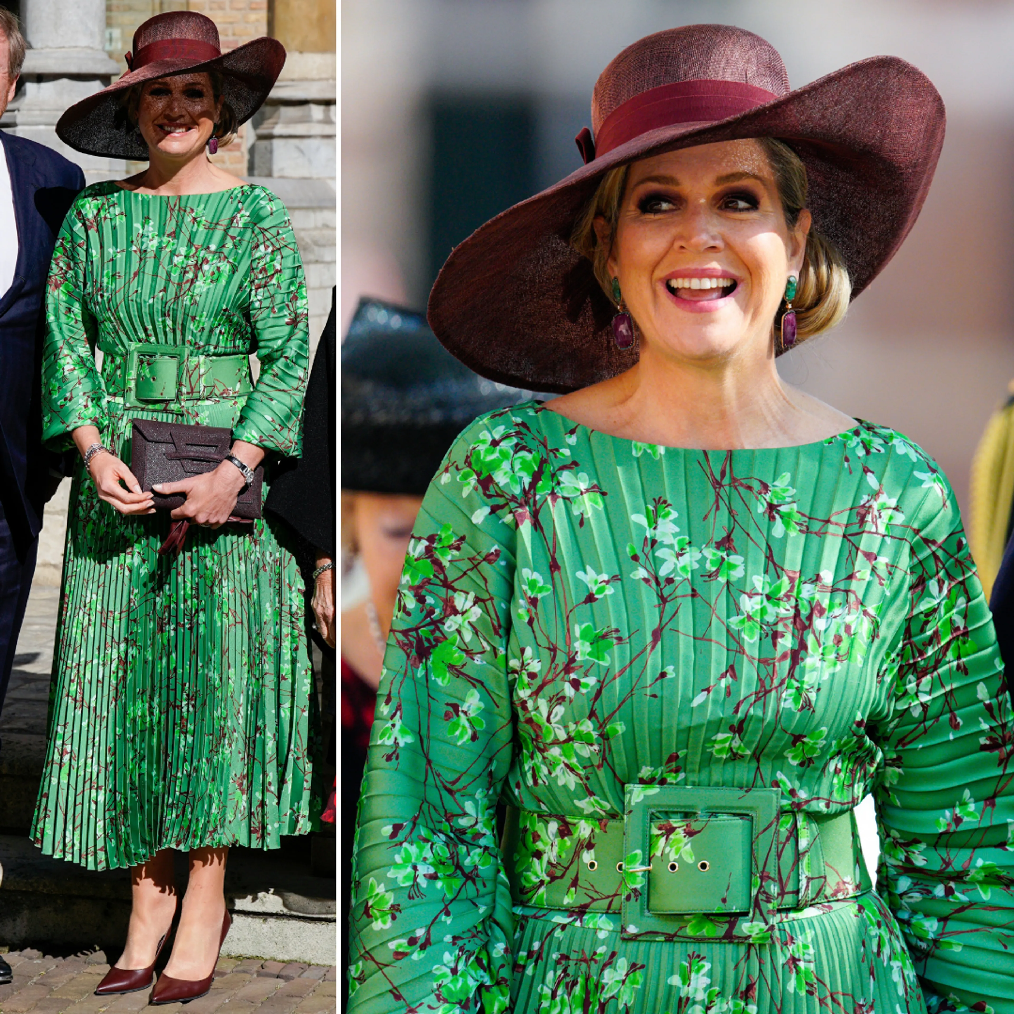 De laatste keer dat de koningin bij de Four Freedoms Awards was, werd een opvallende groene japon van Natan gedragen. Het geheel kennen we van het streekbezoek aan Salland, in september 2021.