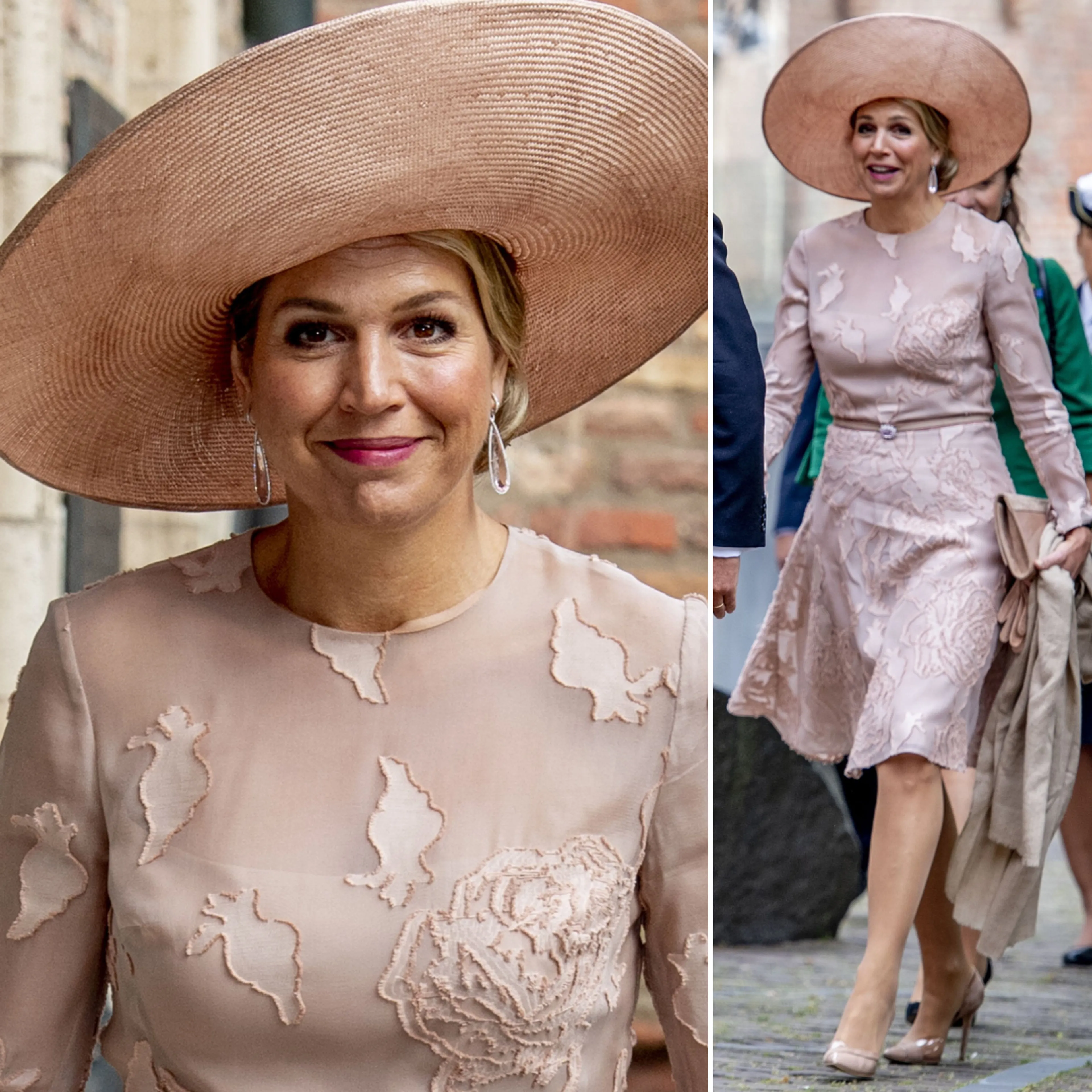 Twee jaar later is koningin Máxima opnieuw in Middelburg. Voor de gelegenheid wordt een bekende manteljurk uit de kast getrokken. Máxima heeft het ontwerp eerder gedragen in 2015, toen koningin Mathilde op bezoek was in Nederland. Op haar hoofd draagt de koningin een bruine hoed van Fabienne Delvigne.