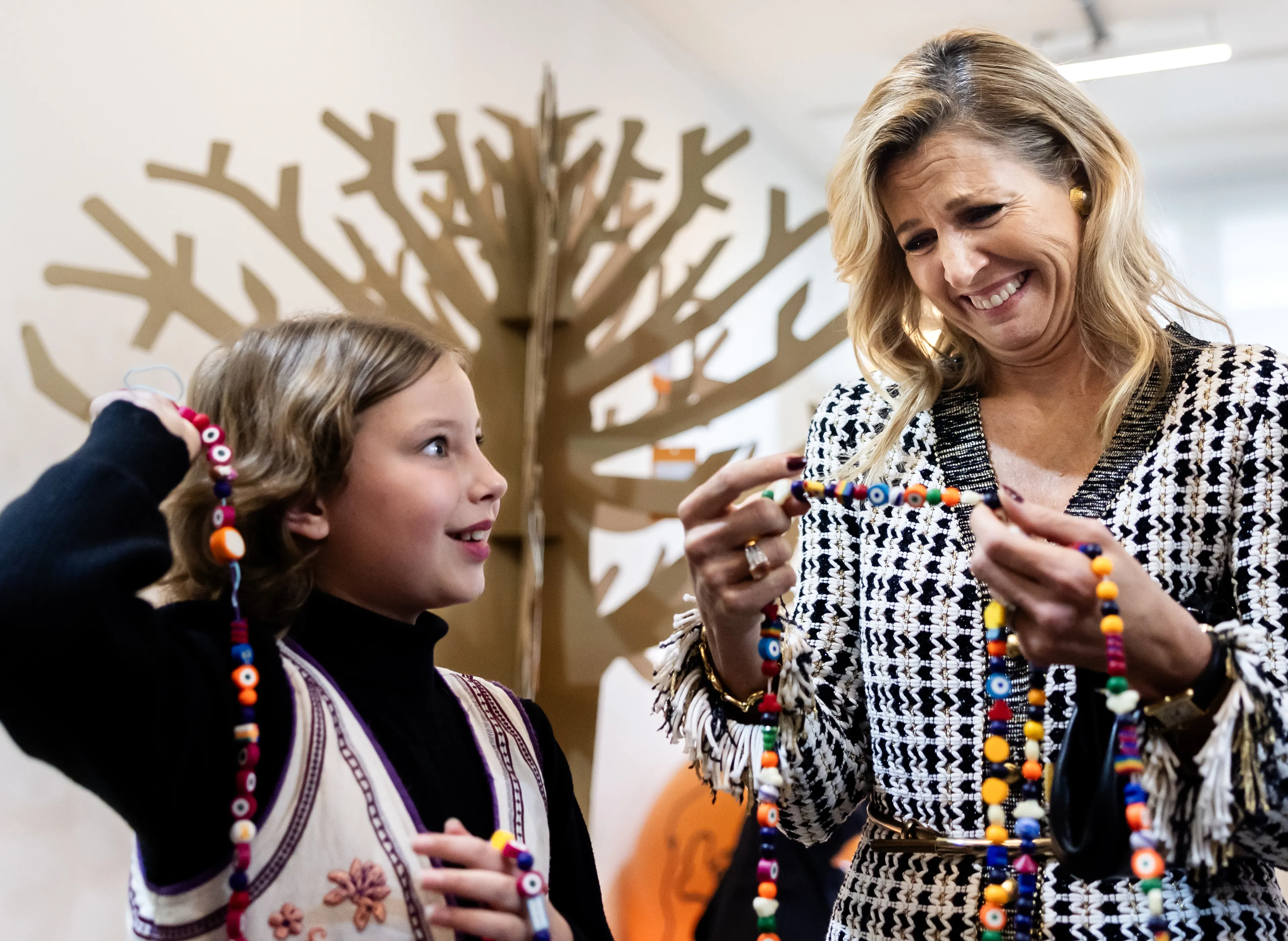 Op 15 oktober opende koningin Máxima onder andere de tentoonstelling 'Heroes - kinderkanker de wereld uit'. Ze ging in gesprek met Saar (10) over haar meterslange Kanjerketting. Ze droeg voor dit moment een bekende tweed-look van Oscar de la Renta.