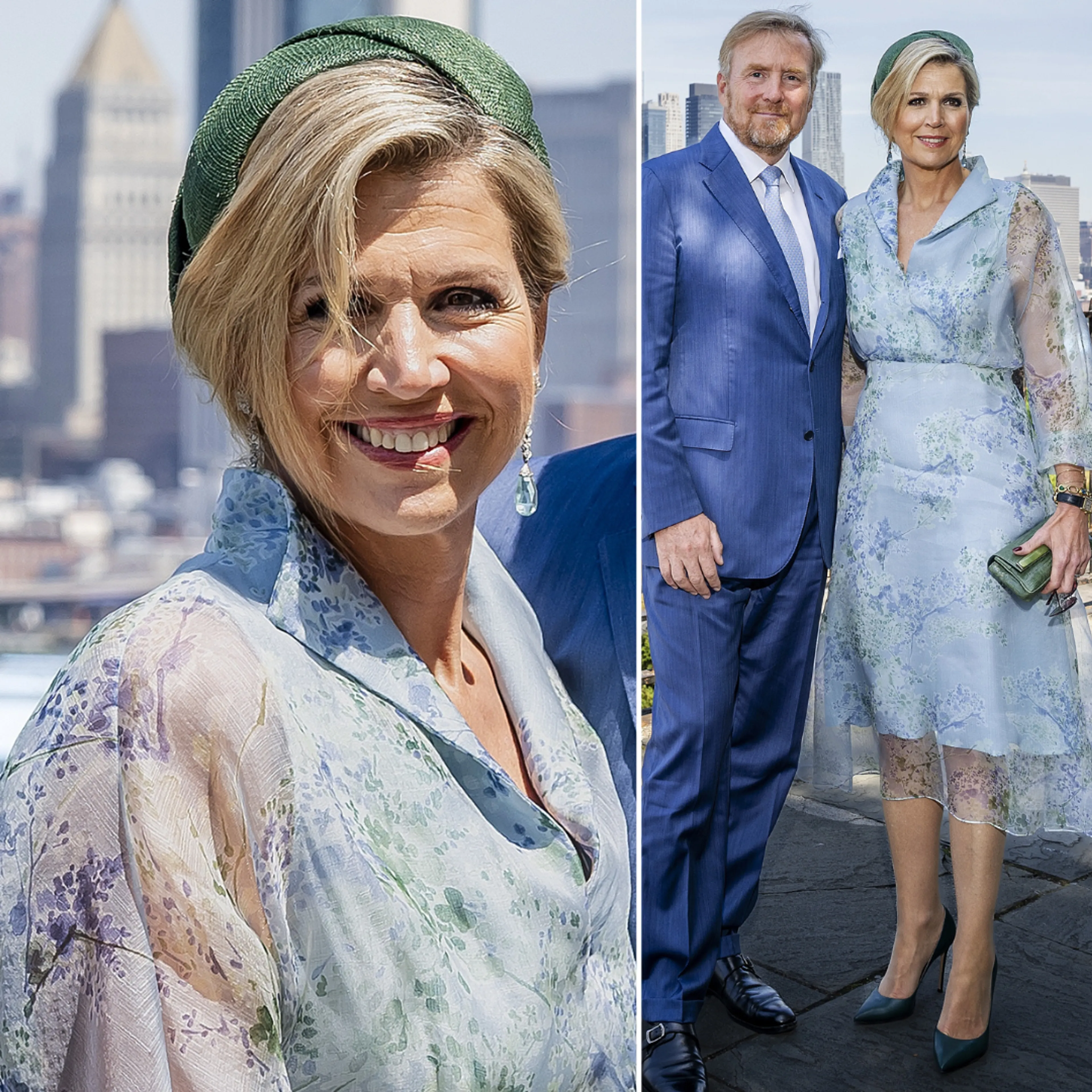 Koning Willem-Alexander en koningin Máxima sluiten hun bezoek af in New York City. Daar draagt de koningin een nieuwe outfit met een bijpassend donkergroen hoedje. Voor het afrondende gesprek met de Nederlandse pers kleedt Máxima zich om. Ze draagt voor de gelegenheid een nieuwe jurk met felle kleuren van Carolina Herrera.