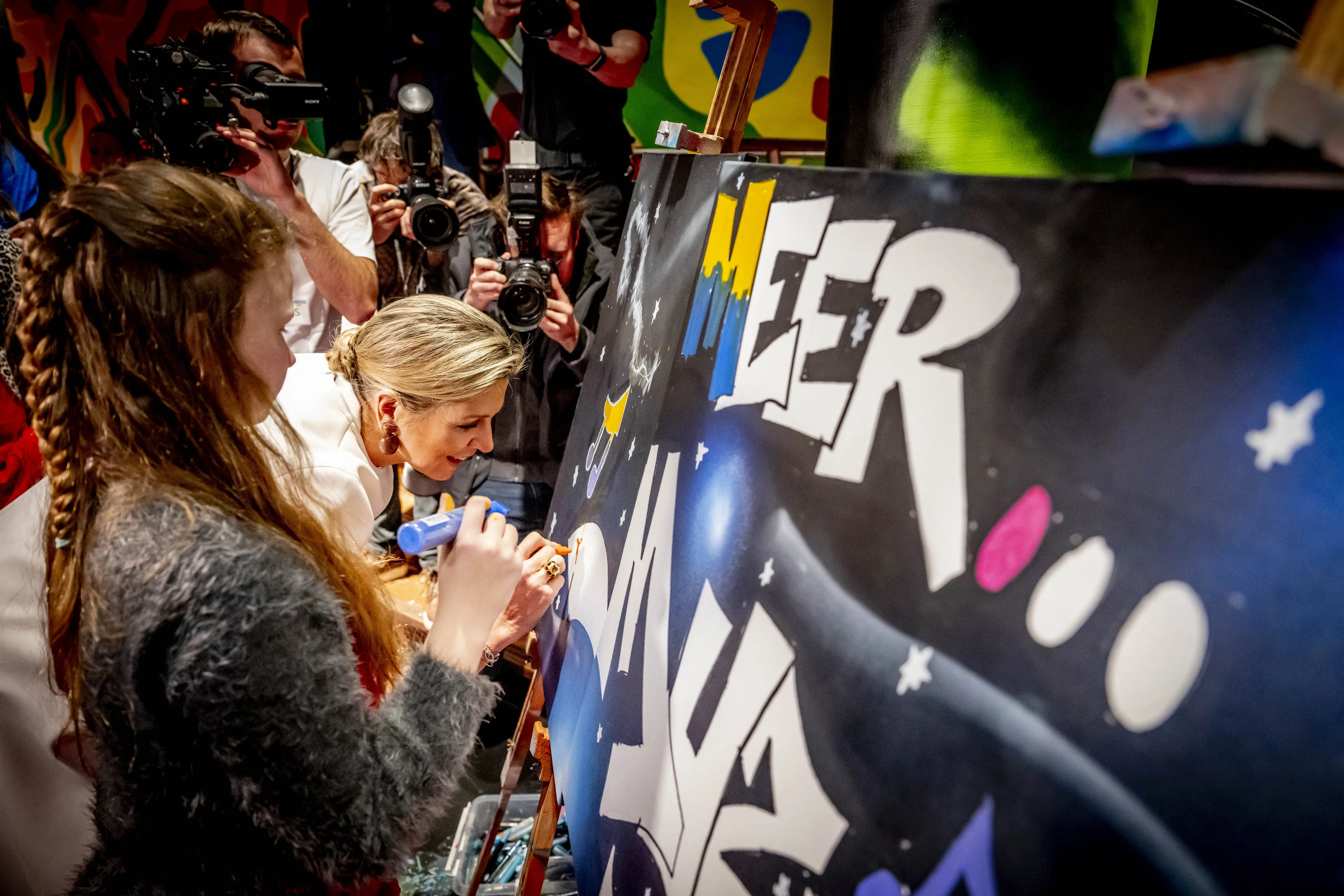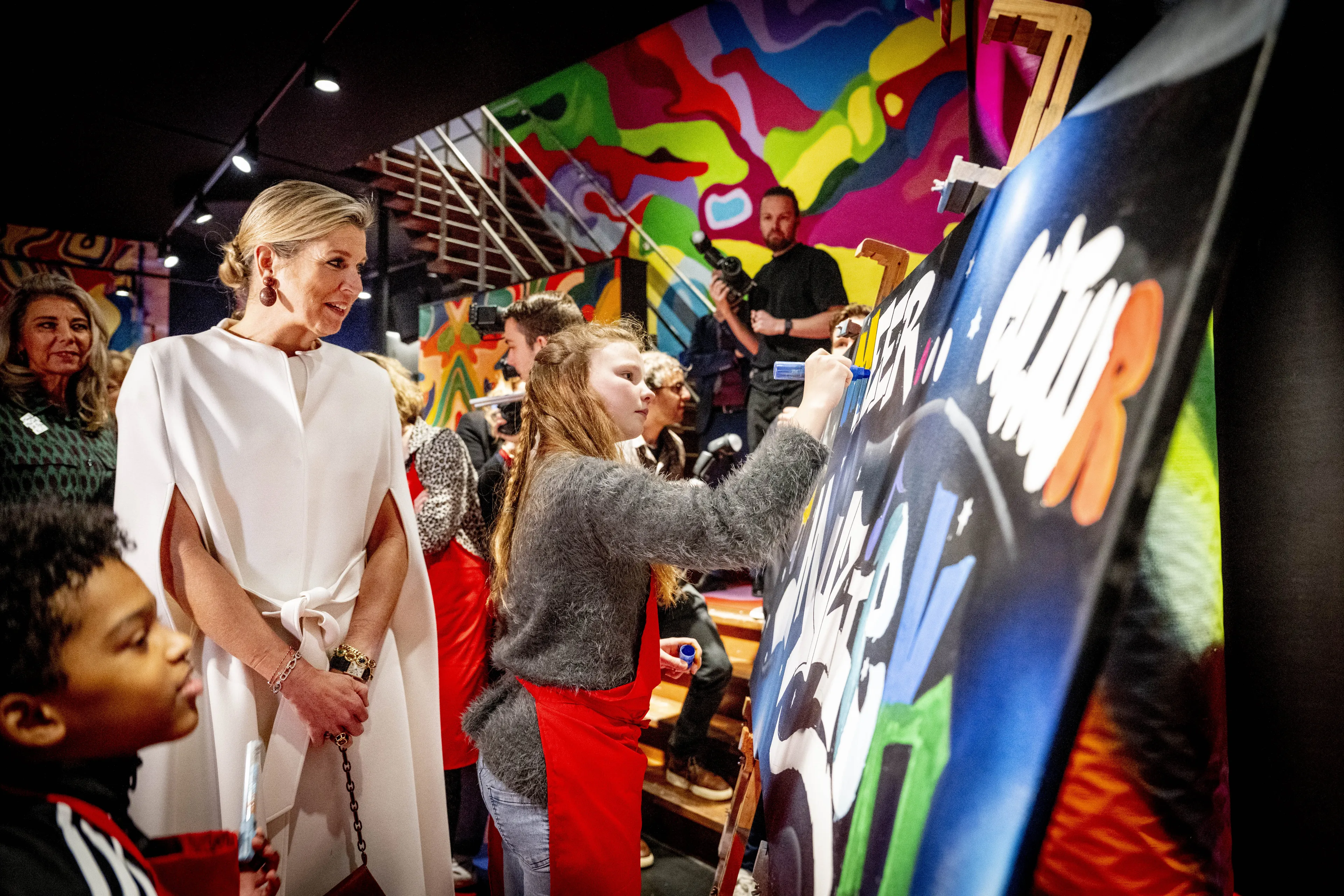 Tijdens het bezoek wordt gelukkig niet alleen gepraat, want Máxima mag ook meedoen aan een graffiti-workshop. En met een spierwitte outfit is dat natuurlijk oppassen geblazen! Basisschoolleerlingen laten vol enthousiasme hun werk aan de koningin zien en vertellen over de workshop. Gelukkig voor de koningin blijft haar mantel net zo wit als dat hij vanochtend was.