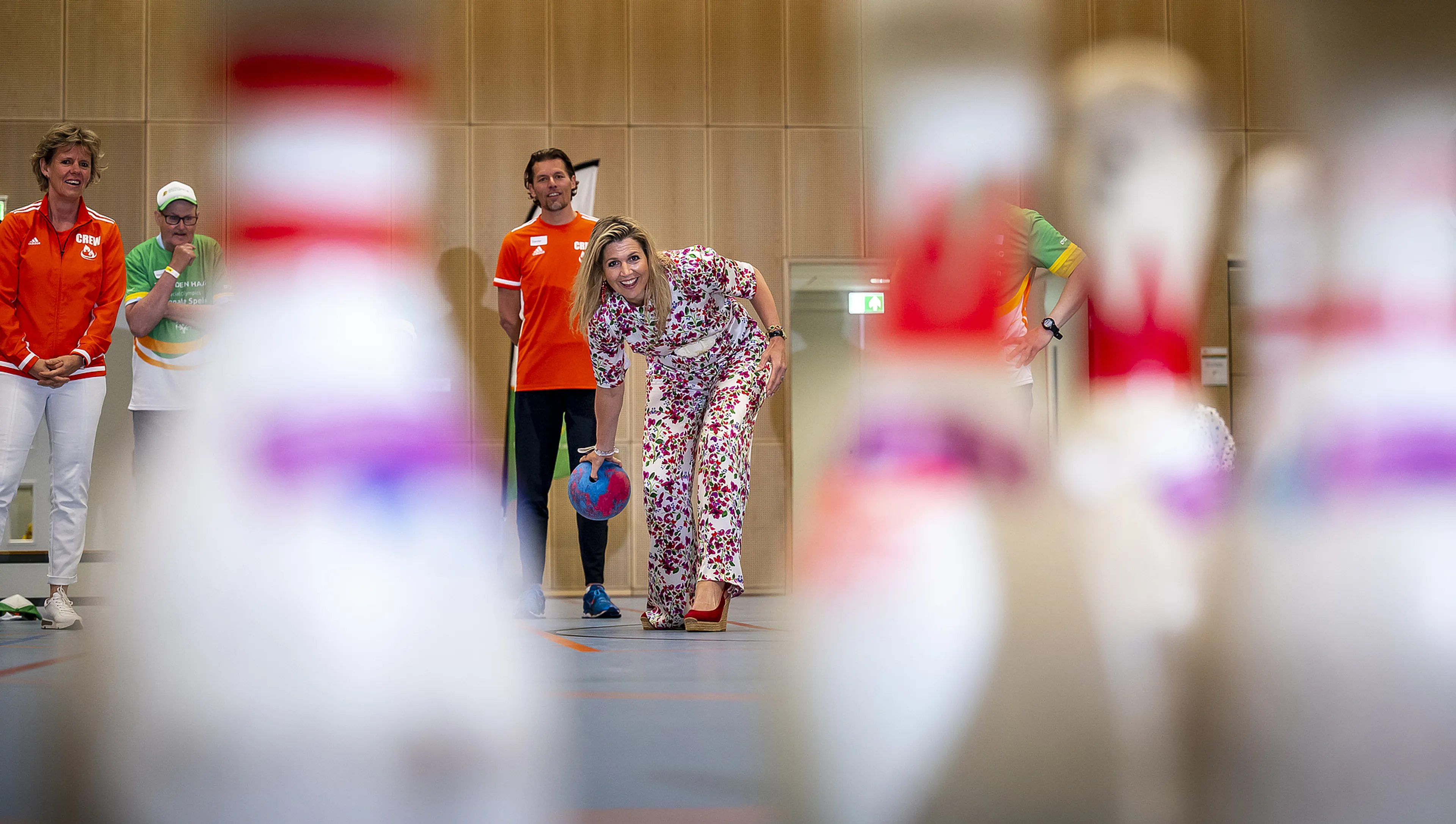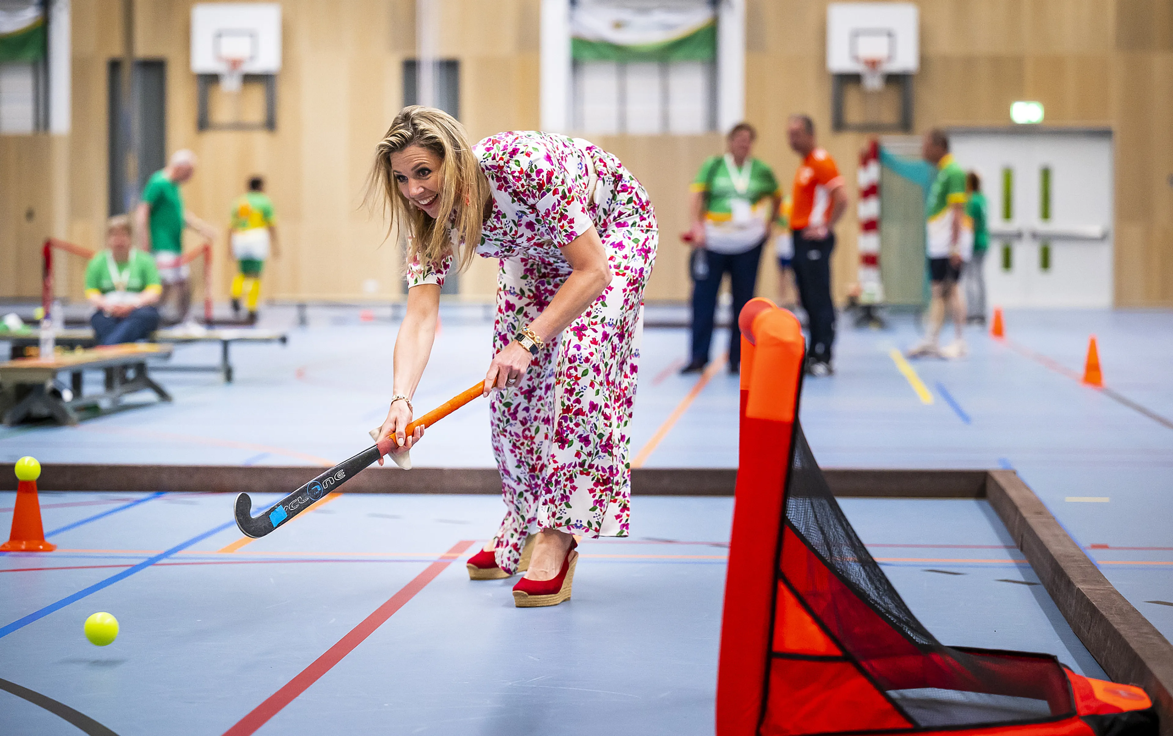 Na de introductie ging Máxima de sporthal in om een kijkje te nemen bij trainingen van Team Den Haag. De koningin pakte de hockeystick op om mee te oefenen met een aantal hockeyers, die enthousiast de bal heen en weer speelden naar haar. Naast de hockeyers waren bowlers in de weer en ook hier pakte Máxima de bal op om een paar kegels omver te werpen, en korte gesprekjes aan te knopen met de spelers en hun begeleiders.