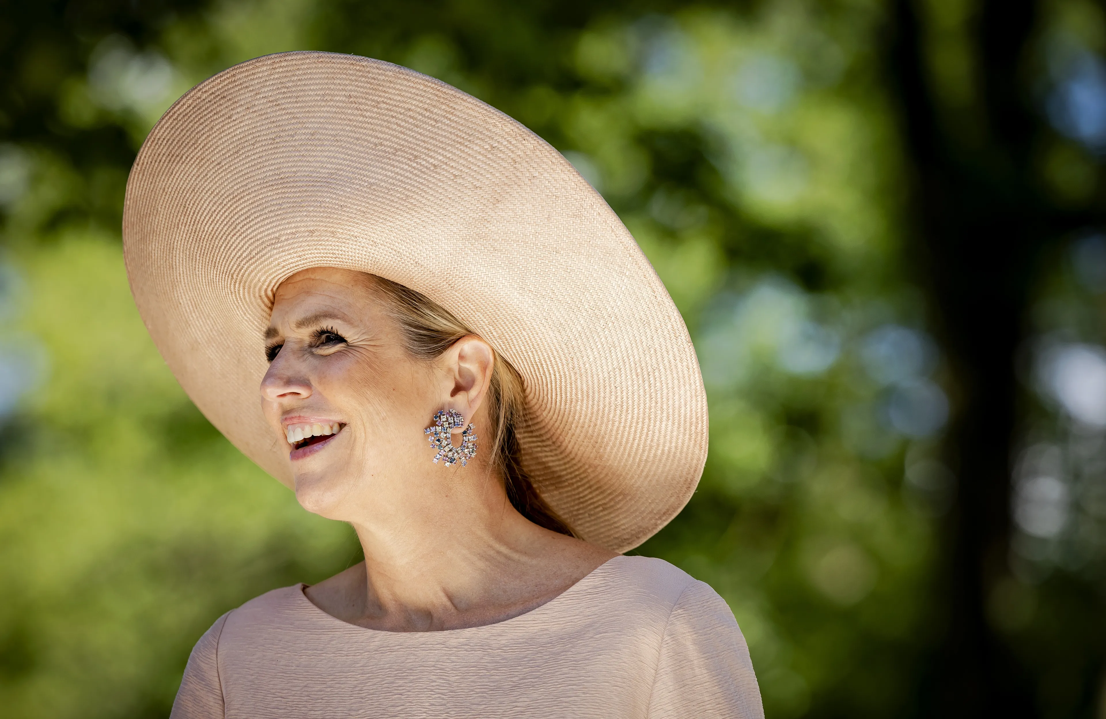 Koningin Máxima draagt woensdag een lichtroze jurk van het Belgische modehuis Natan en een bijpassende hoed van Fabienne Delvigne. Het geheel is al diverse keren gedragen door de koningin.