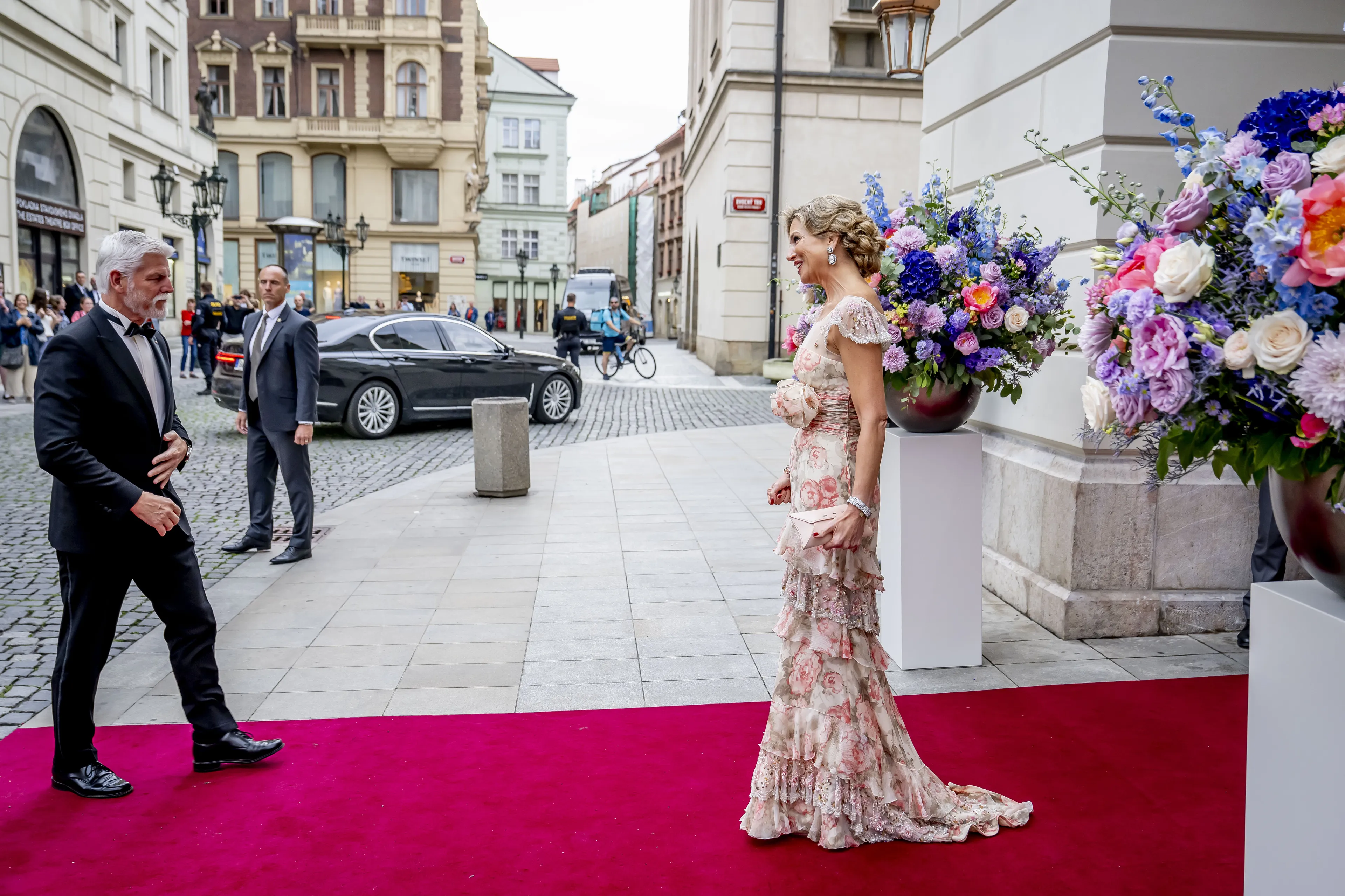 Het laatste onderdeel van het staatsbezoek aan Tsjechi毛 is de contraprestatie: het bedankje van Nederland voor de gastvrijheid van de afgelopen dagen. Ook dit onderdeel moet de koningin nu in haar eentje doen. Voor de gelegenheid koos de koningin een jurk die ze al heel wat jaren in de kast heeft hangen.