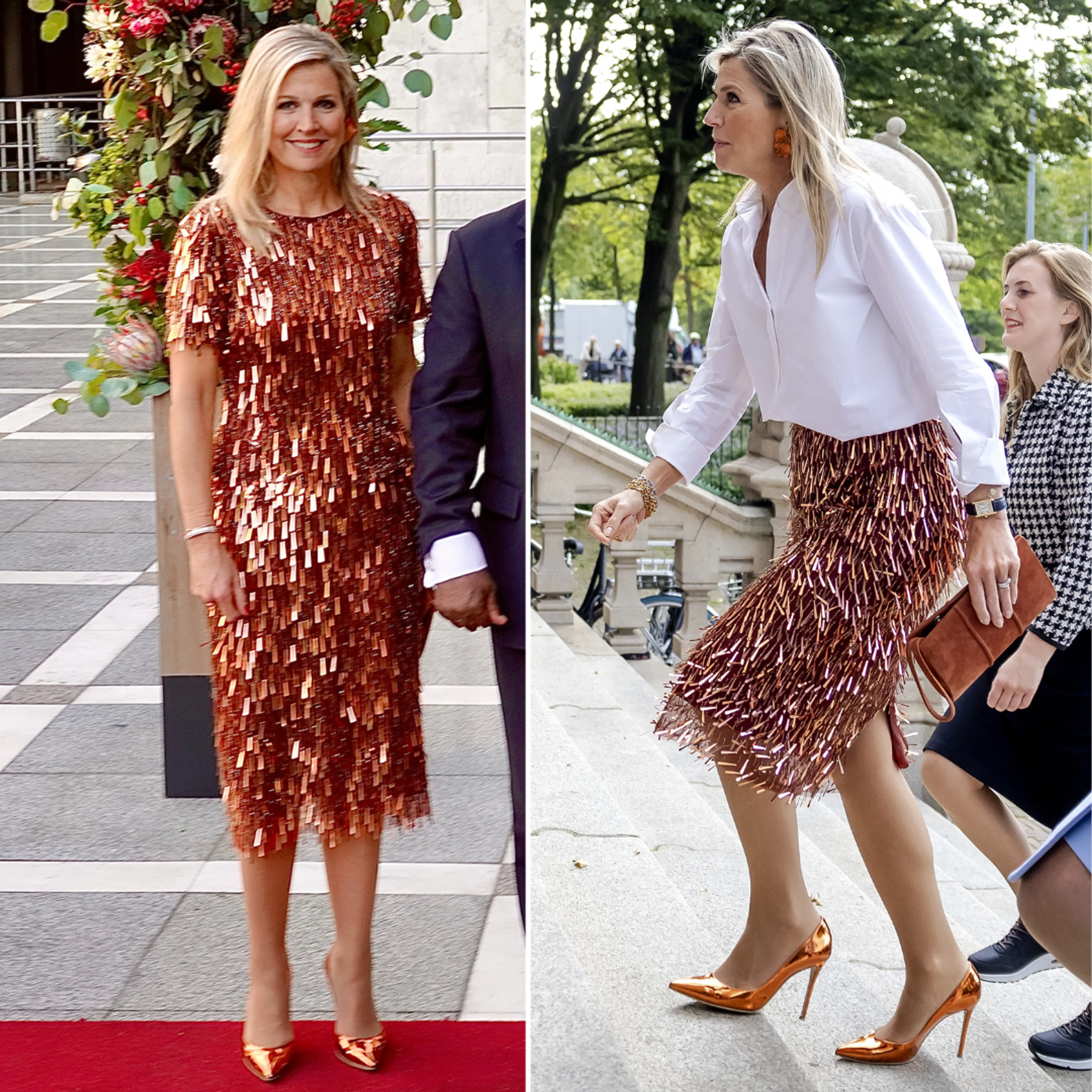 Tijdens de contraprestatie draagt Koningin Máxima een creatie het Belgische modehuis Natan. De rok droeg ze in september al naar het winnaarsdiner van de Koning Willem I Prijzen.