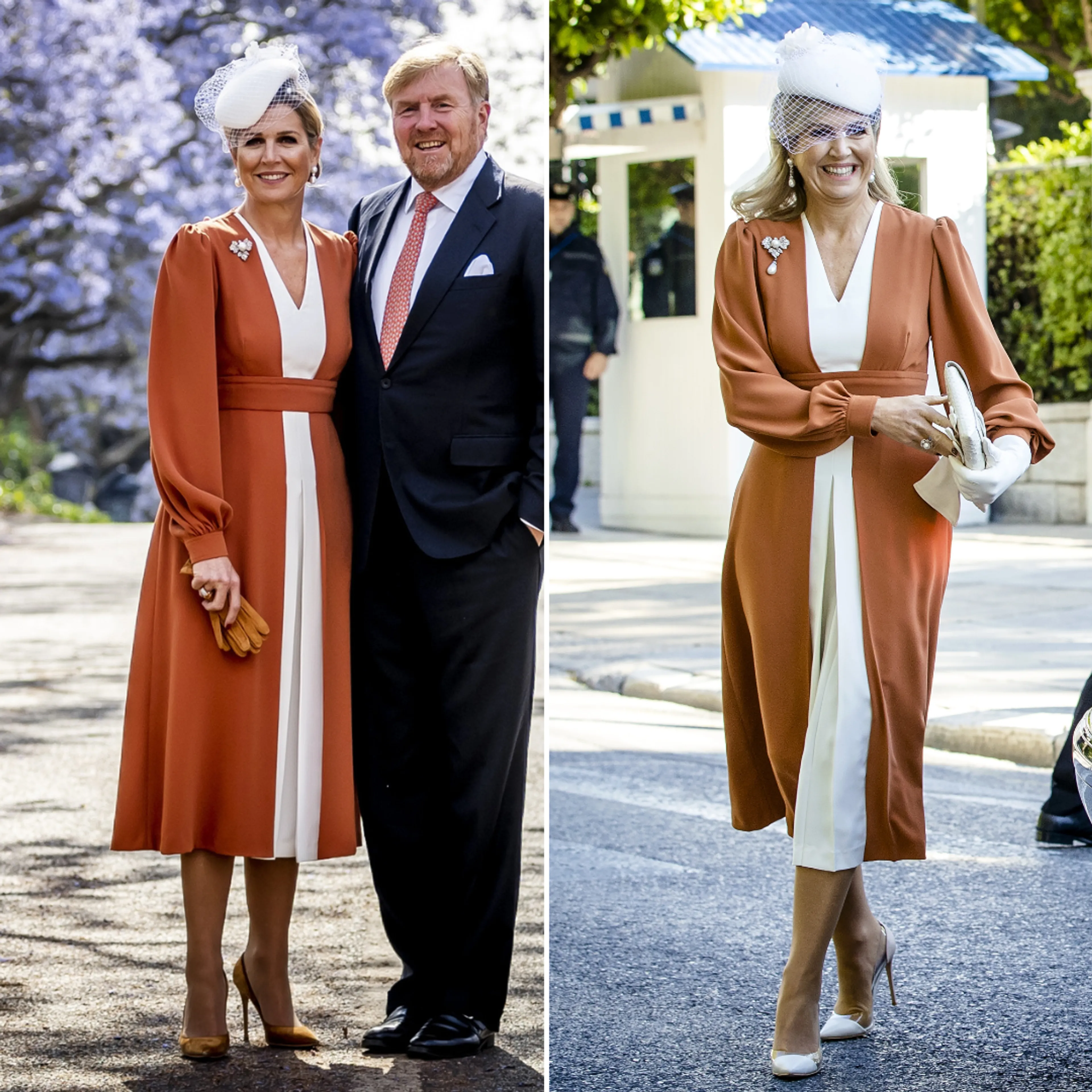 Later op de dag wisselt de koningin van outfit. Ze draagt wederom een jurk en hoed die we al kennen. De oranje en witte japon van het merk Zeus + Dione draagt ze eerder al bij het staatsbezoek aan Griekenland in 2022.