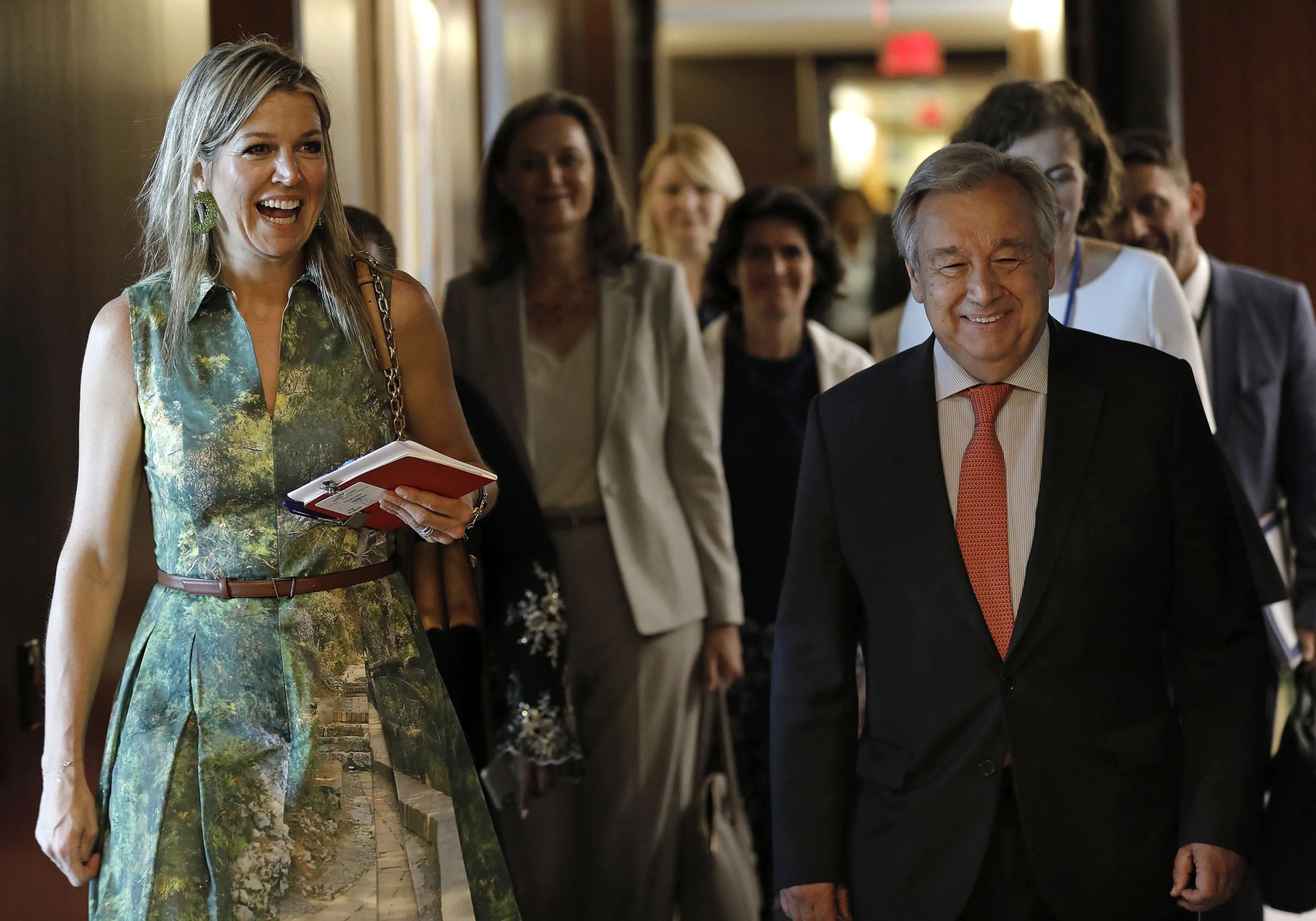 Een dag eerder, wanneer Máxima haar echtgenoot bij een aantal van zijn activiteiten vergezelt, biedt ze VN-baas António Guterres haar jaarverslag aan.