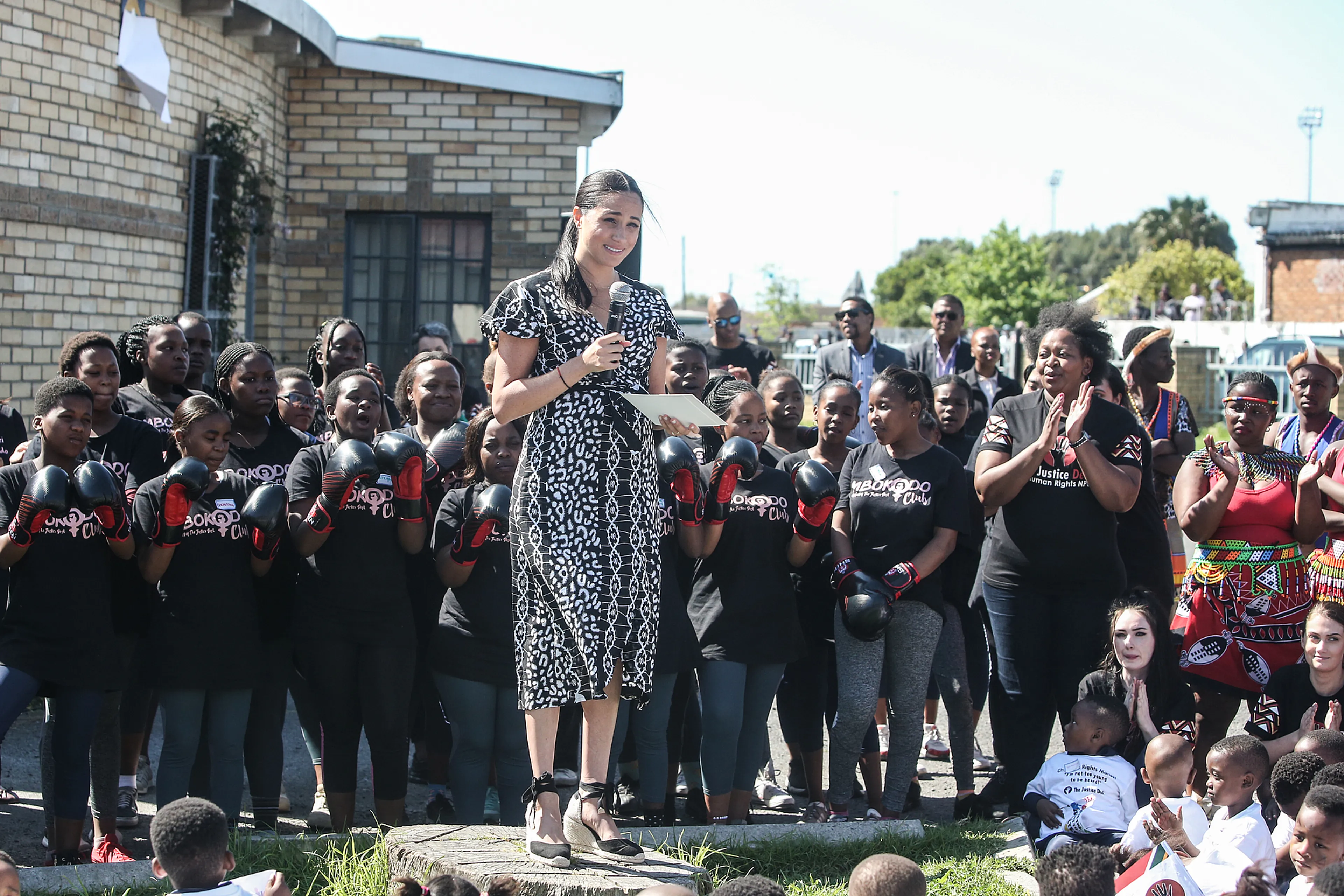 De voormalige actrice zei dat ze als "gekleurde vrouw" op bezoek kwam. "Mag ik zeggen dat ik hier dan wel met mijn man als lid van de koninklijke familie ben, maar ik wil dat jullie weten dat ik hier ook ben als een moeder, een vrouw, een gekleurde vrouw en als jullie zus", aldus Meghan, in de wijk die bekendstaat om de hoge criminaliteit. Harry en Meghan bezochten daarom een organisatie die vrouwen en meisjes zelfverdediging leren.