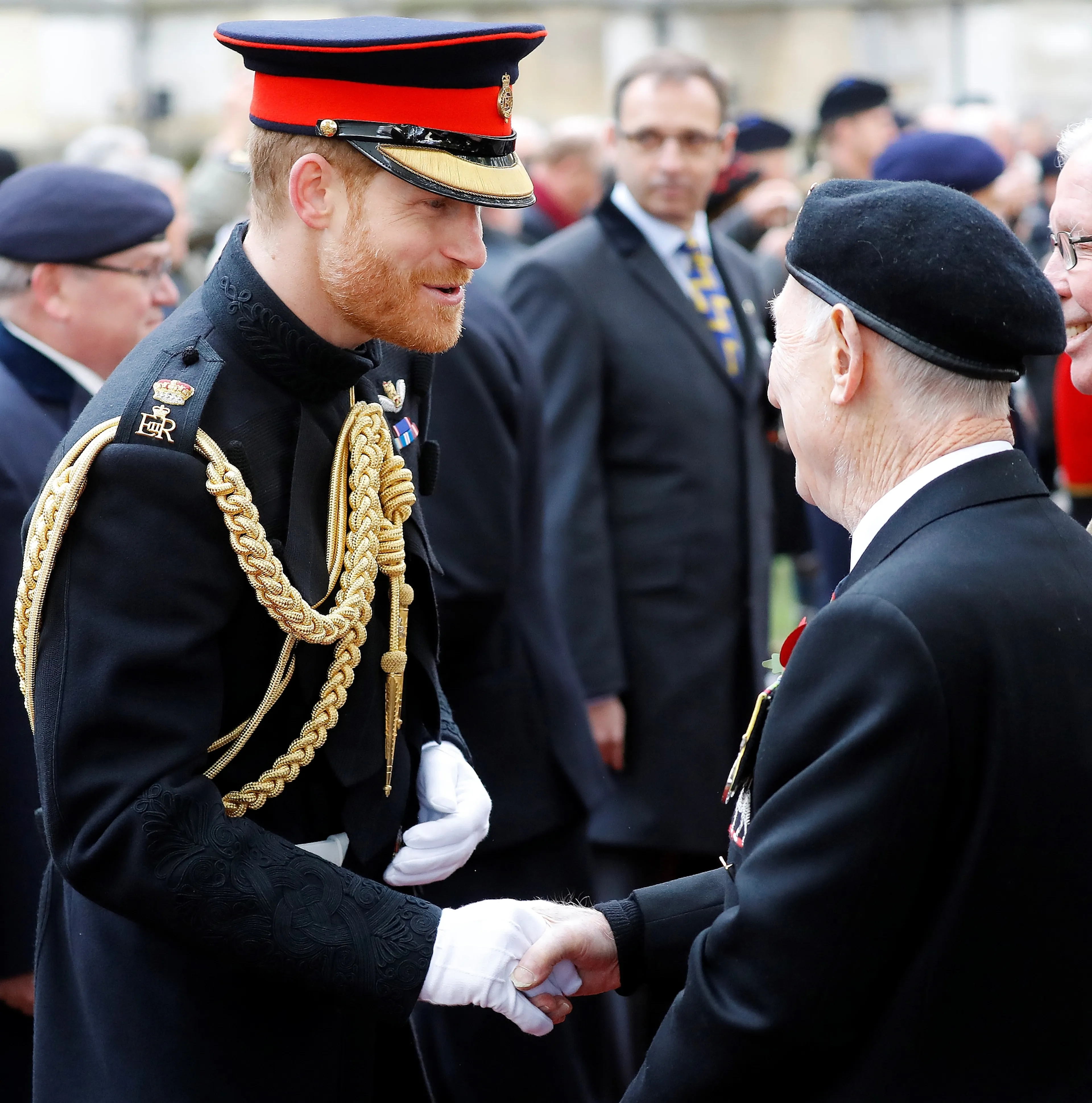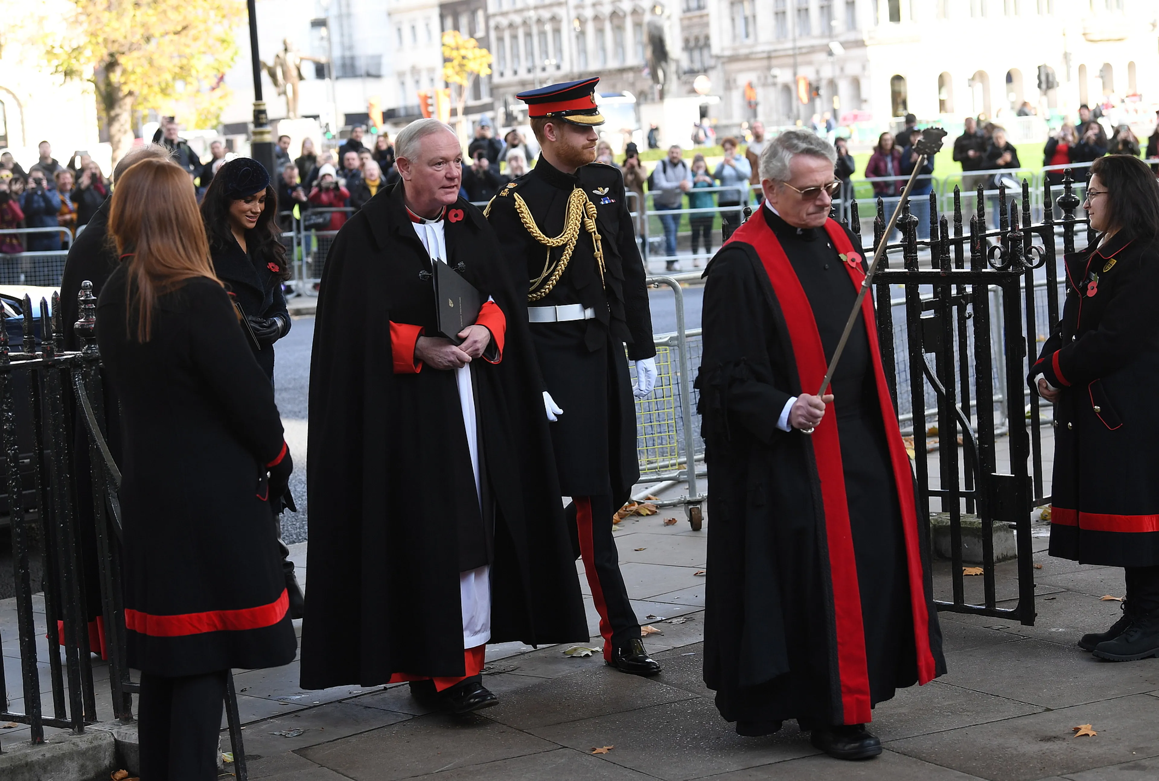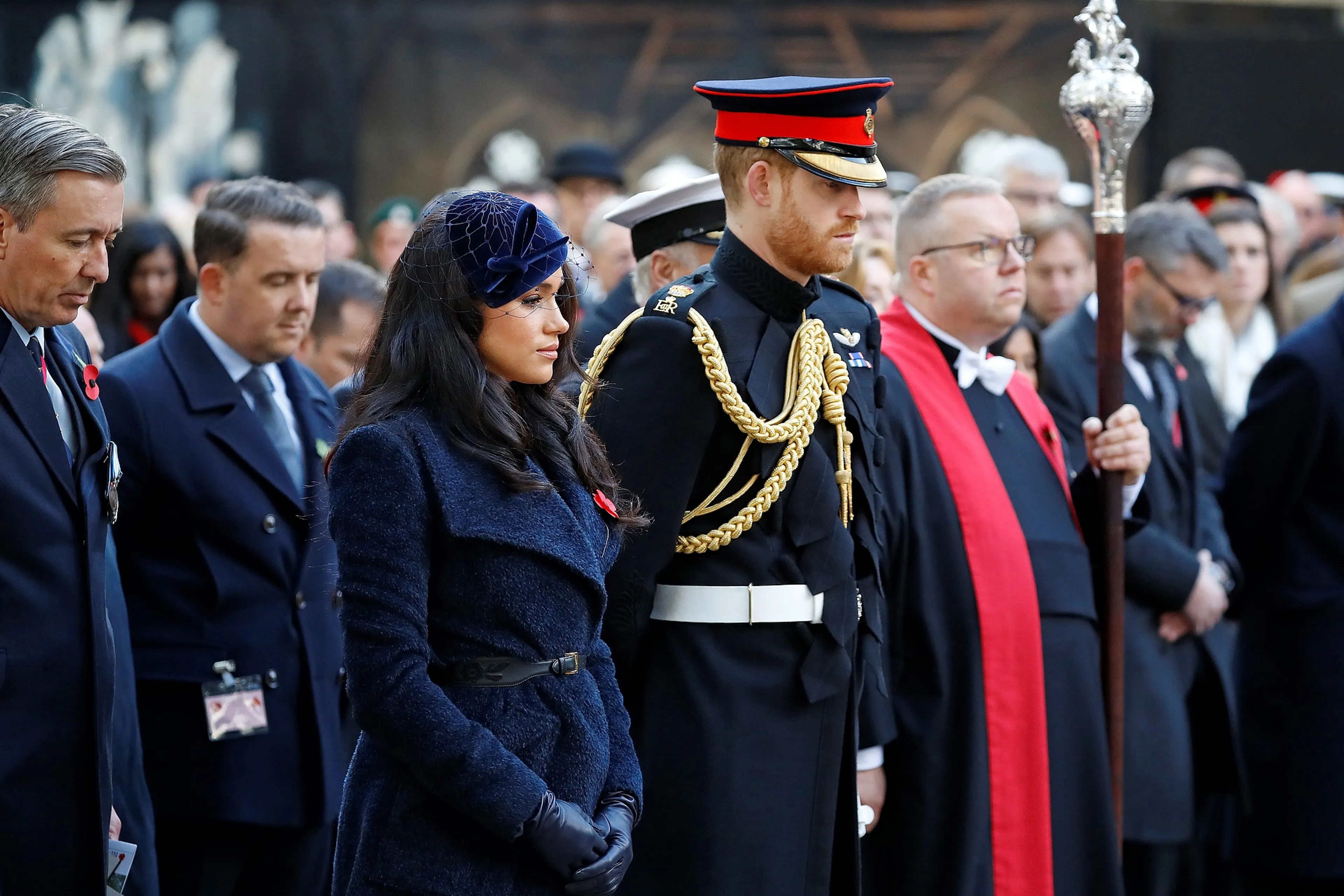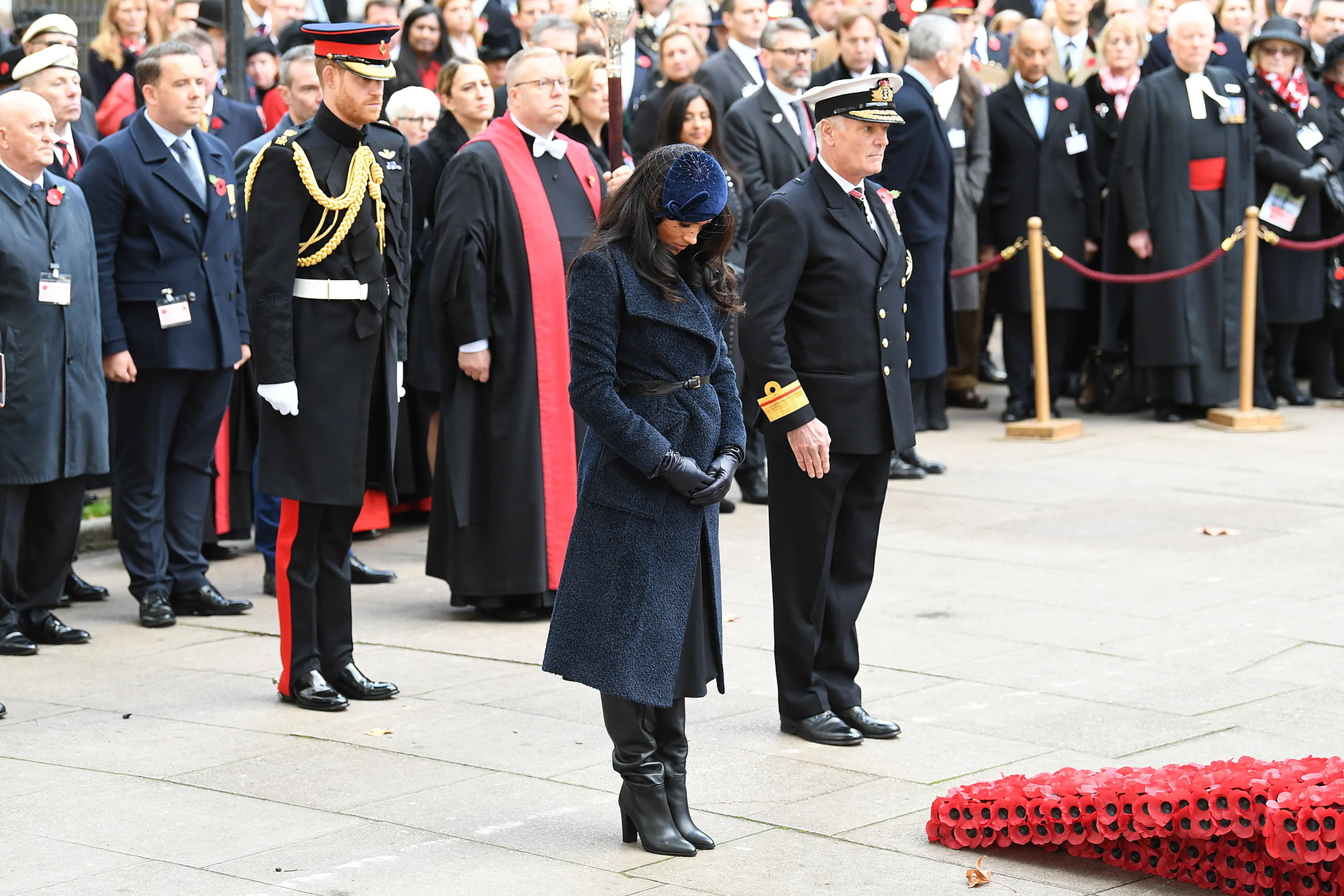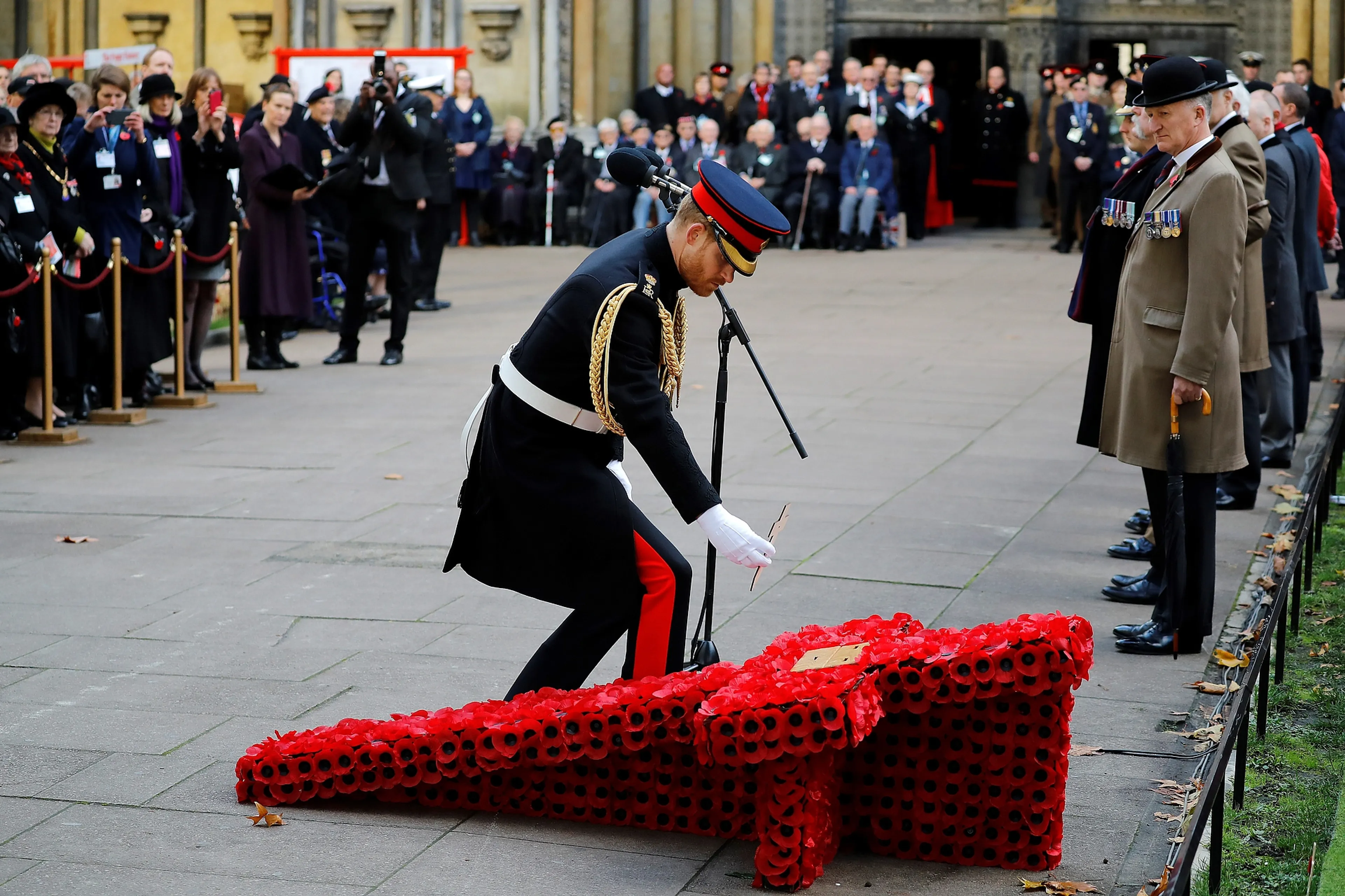 De hertog en hertogin van Sussex plaatsen ieder een herdenkingskruisje op een groter kruis vol met rode klaprozen, die ook veel van de kleine kruizen op het Field of Remembrance sieren. Vervolgens klonk The Last Post en werd er twee minuten stilte gehouden.