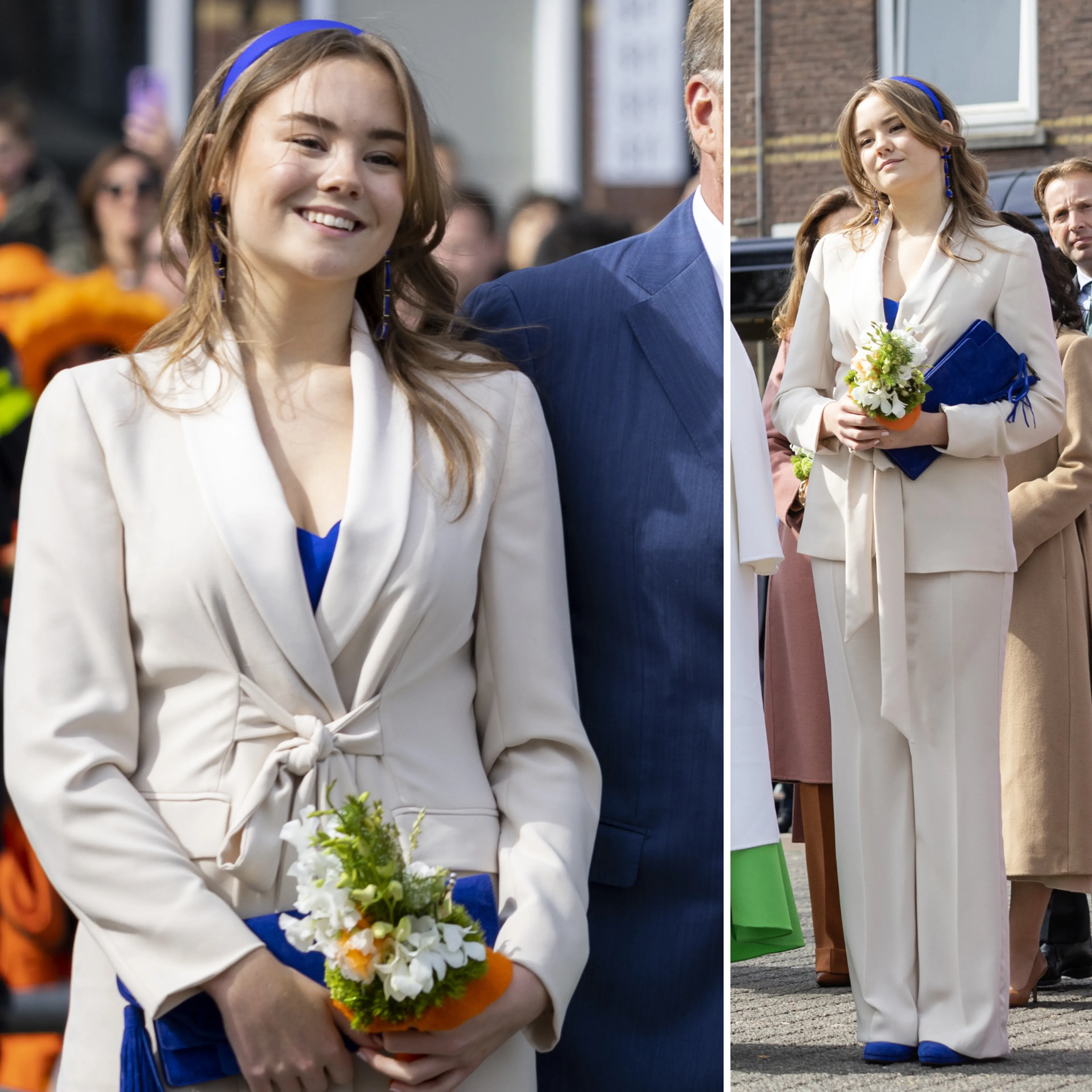 Prinses Ariane draagt een crème broekpak van Max & Co. Haar koningsblauwe tas en pumps zijn van Natan en komen uit de kast van Máxima.