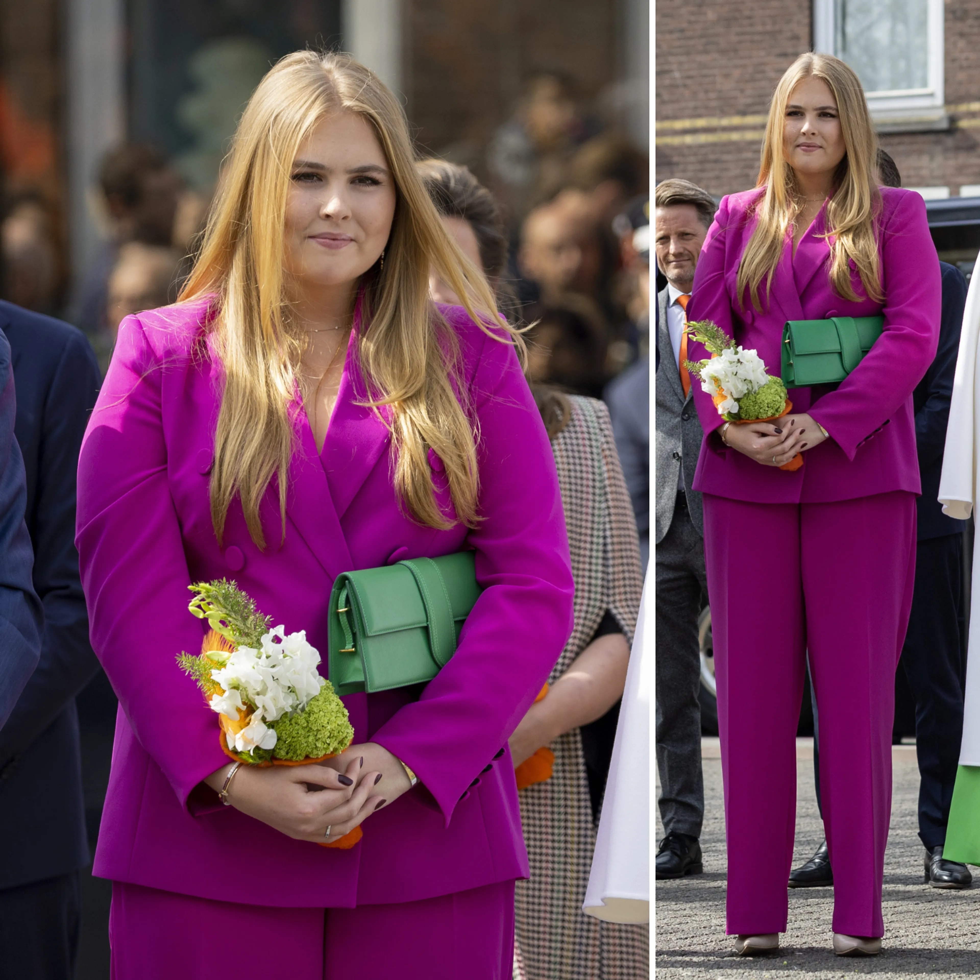 Het roze broekpak van prinses Amalia is van het Italiaanse modemerk Marina Rinaldi. Daarbij draagt ze een groene handtas van Jacquemus.