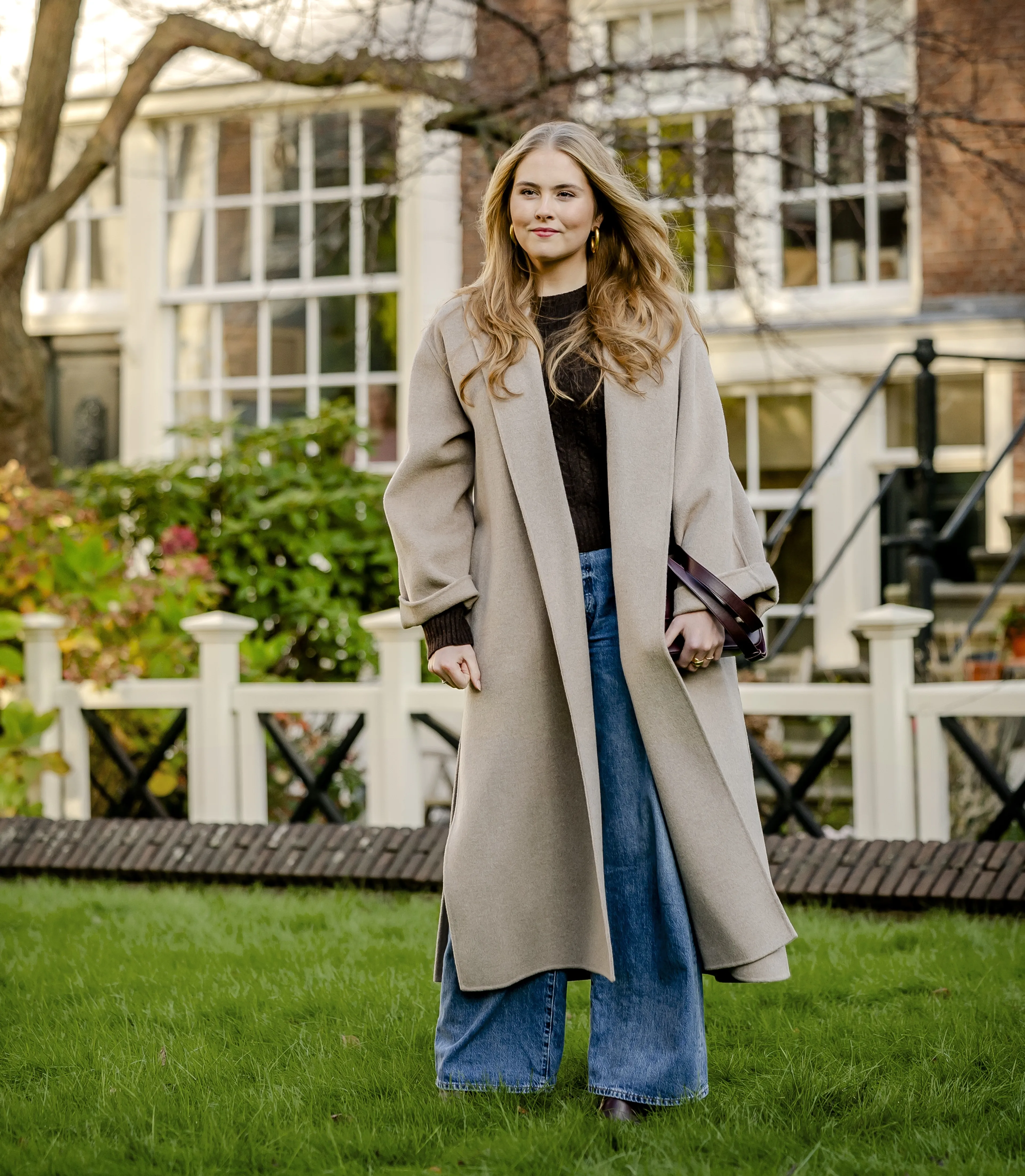 Prinses Amalia ziet er casual uit in een jeans, gebreide bruine trui en een dunne gebreide mantel van Massimo Dutti, weet Josine Droogendijk.