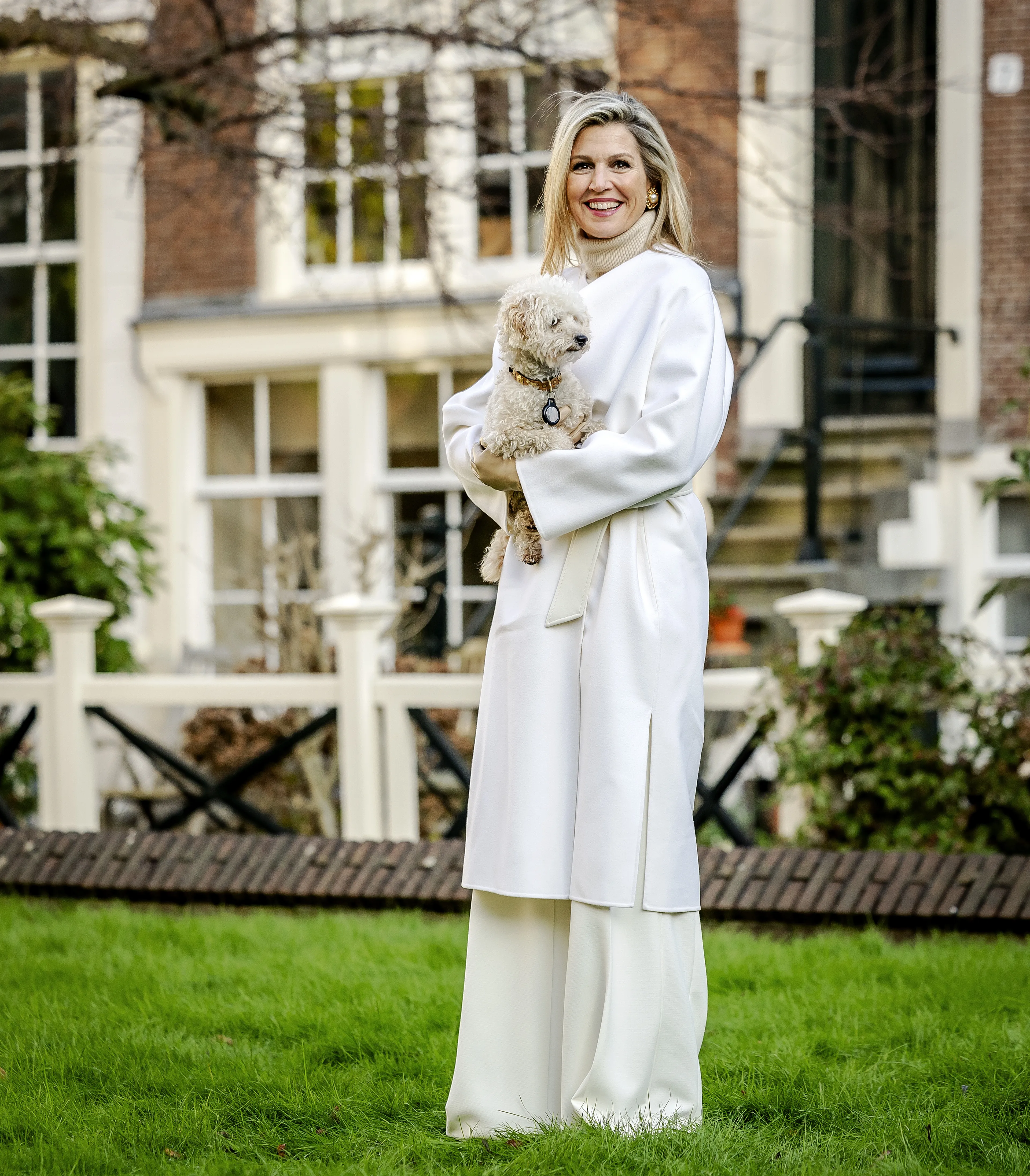 Koningin Máxima kiest voor een rustige basis van beige met daar overheen een smetteloze witte mantel van Natan. Haar haren zitten los en de trui onder de mantel heeft een dikke camelkleurige col. Haar simpele look maakt de koningin af met gouden statement oorbellen en een opvallende broche. De broche heeft de koningin volgens modejournalist Josine Droogendijk al twintig jaar in bezit.
