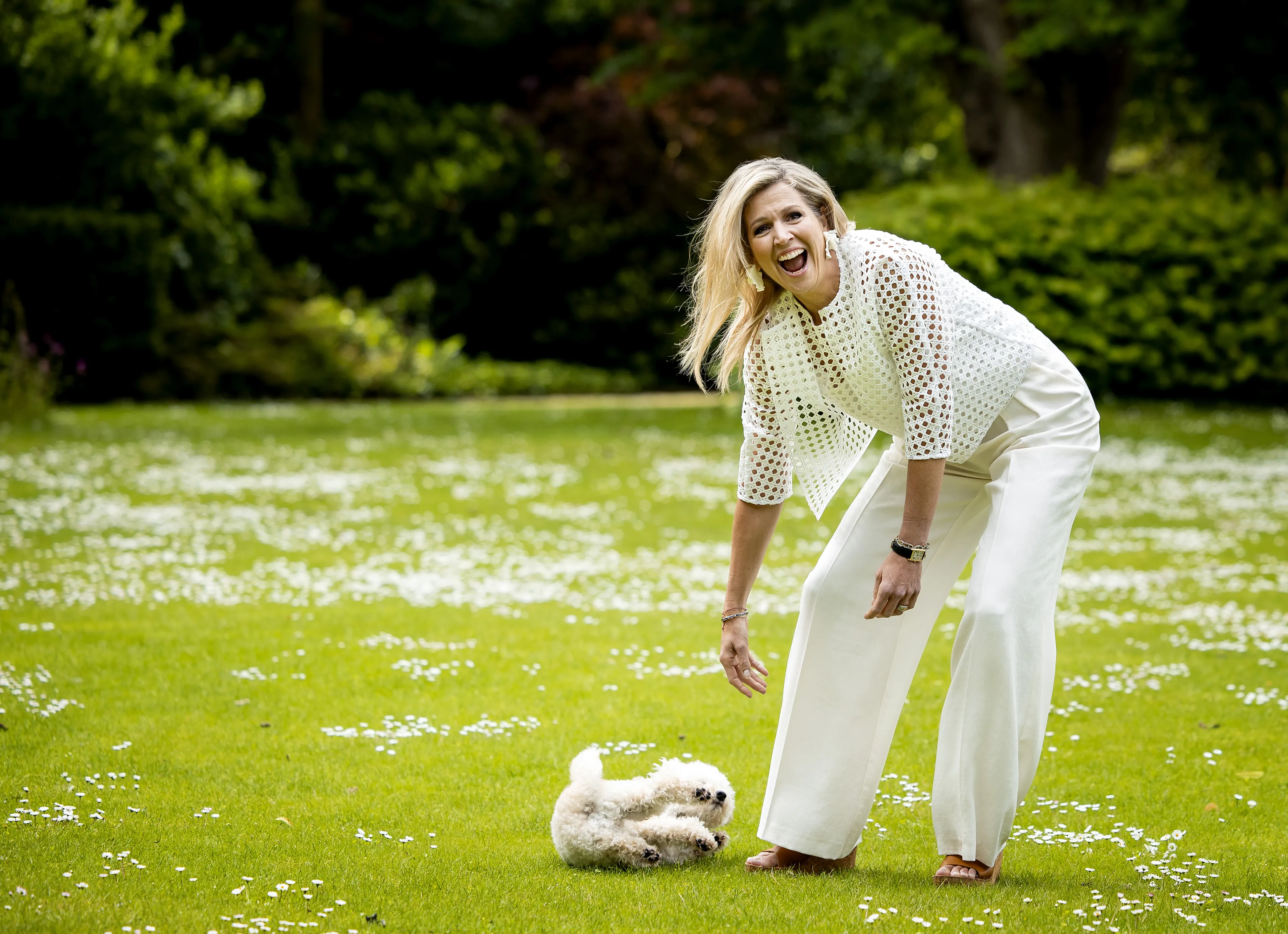 Koningin Máxima ziet er vandaag zonnig uit in haar geheel witte outfit van Natan. Onze koningin kiest graag voor creaties van het Belgische modehuis. Ze maakt haar outfit af met een paar open schoenen.
