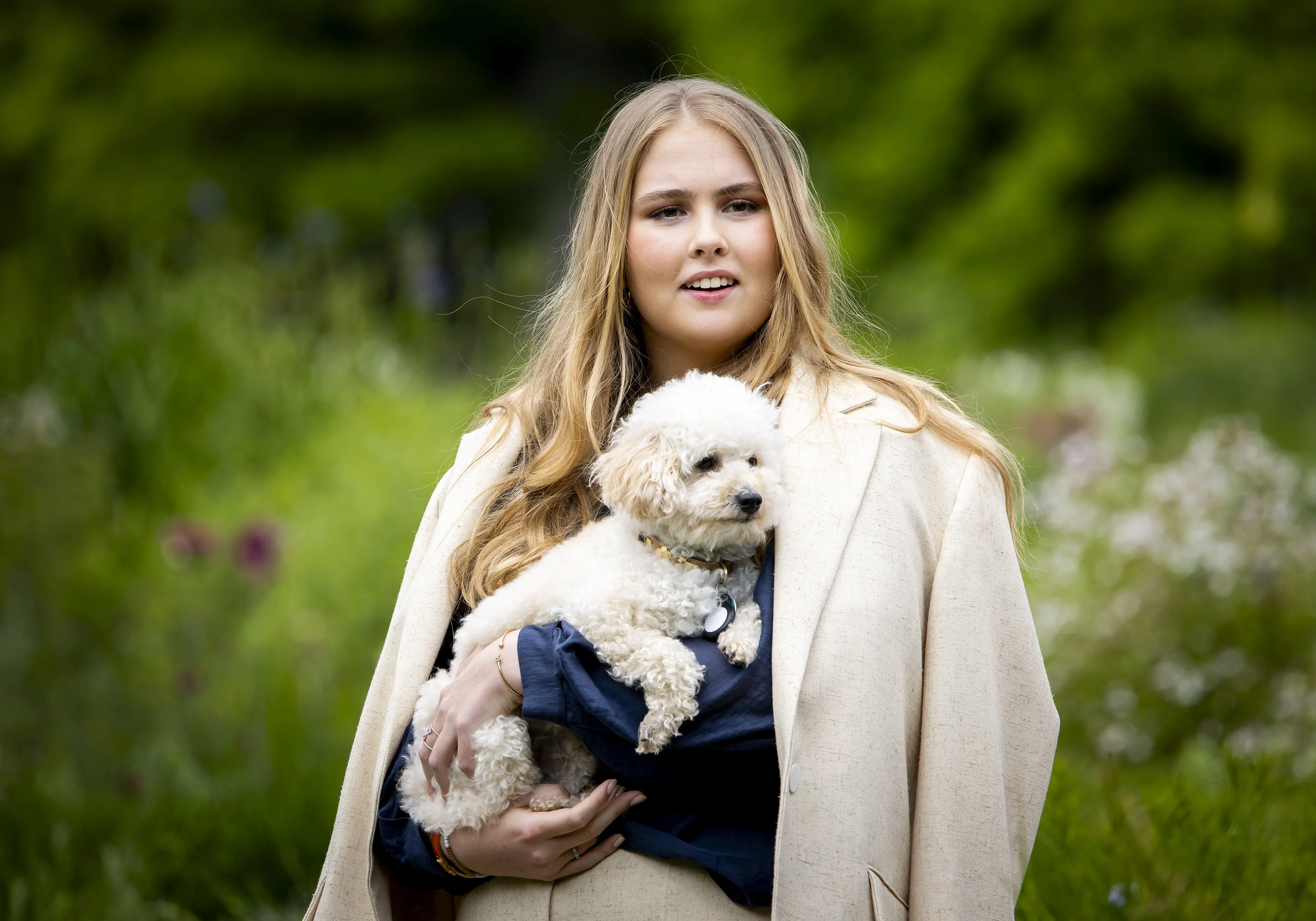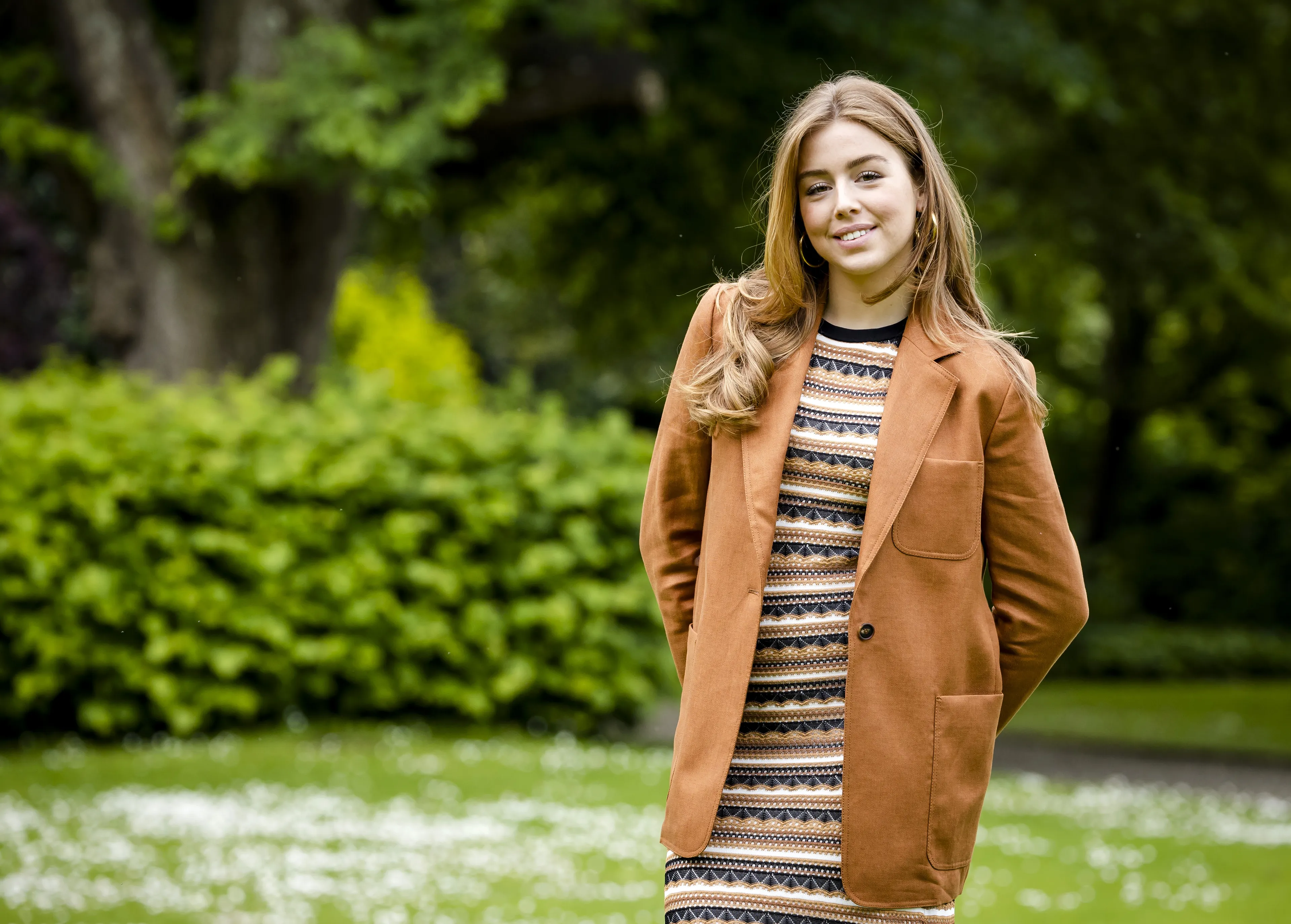 Prinses Amalia heeft gekozen voor een beigekleurig broekpak met een marineblauwe blouse. De blazer van het pak hangt losjes over haar schouders en zorgt voor een nonchalant uiterlijk.