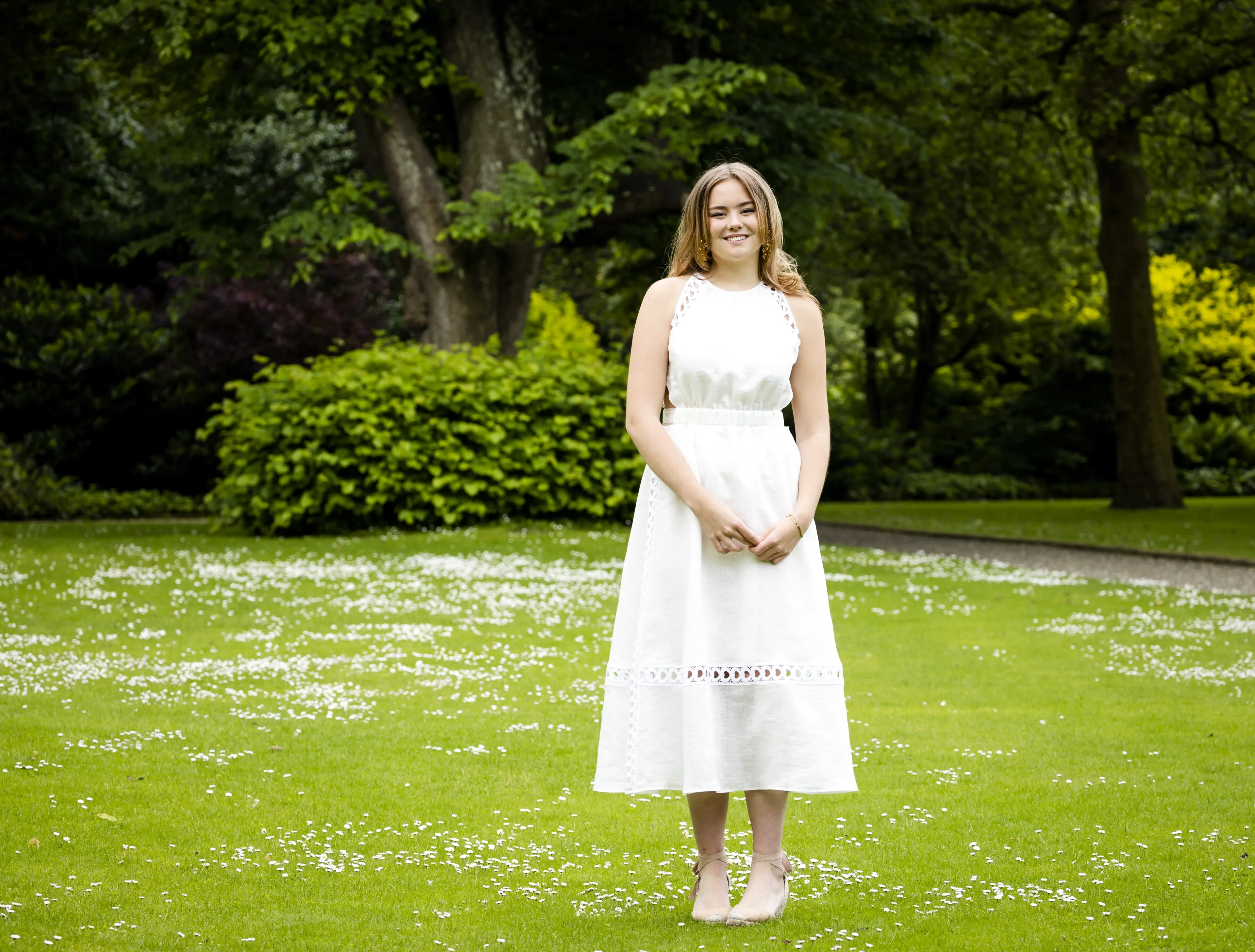 Prinses Ariane trekt voor de gelegenheid een linnen jurk van Sandro Paris uit de kast. Net als haar moeder is ze in het wit gekleed en gaat ze mee met de trend van dit voorjaar.