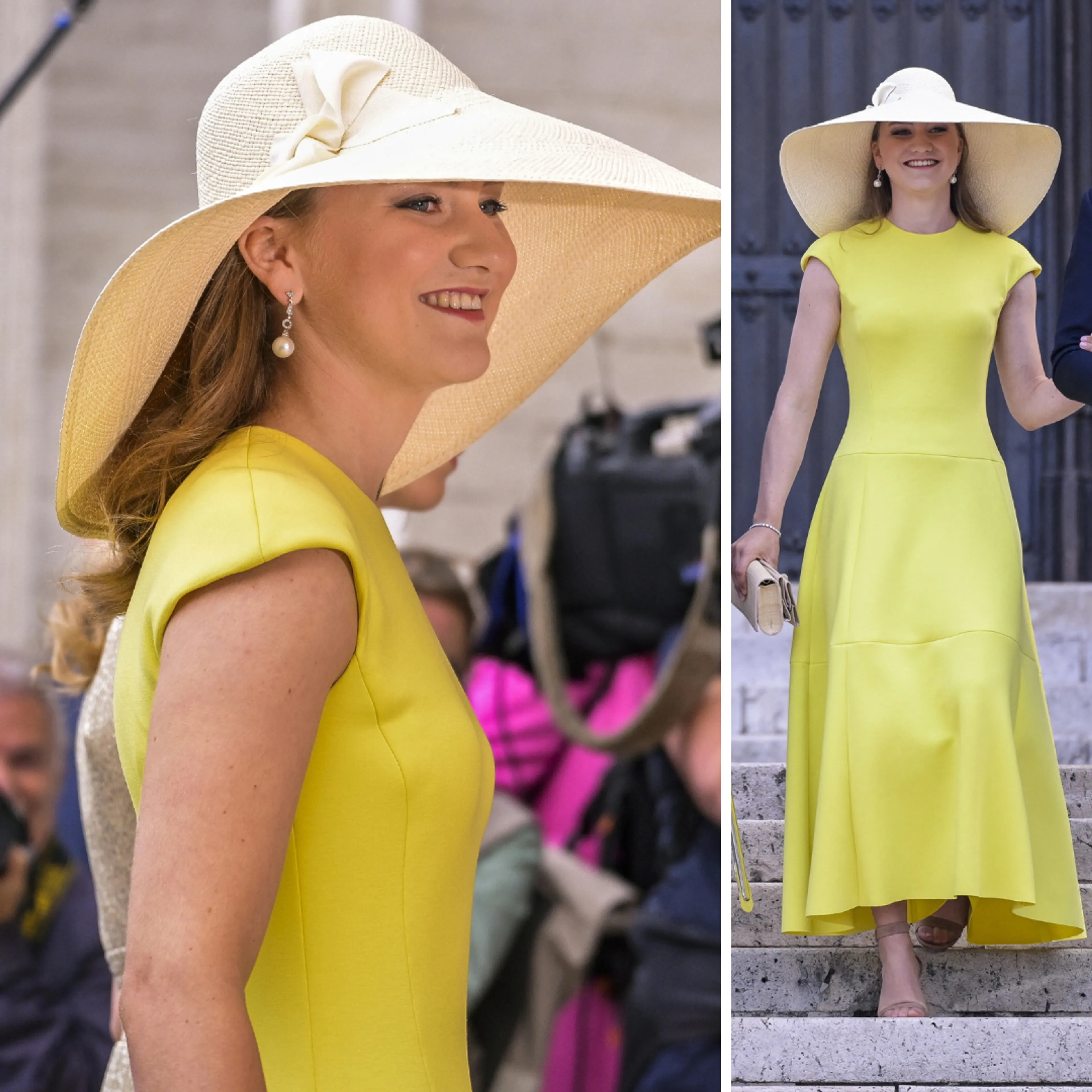Elisabeth verschijnt in een volledig gele look. Ze treedt in de voetsporen van haar moeder, want ook zij draagt een jurk van Natan. Niet alleen de jurk is van hetzelfde merk als Mathilde, ook Elisabeth draagt een stijlvolle hoed van Fabienne Delvigne. Verder kiest de prinses voor sieraden van haar moeder, pareloorbellen en een diamanten armband.