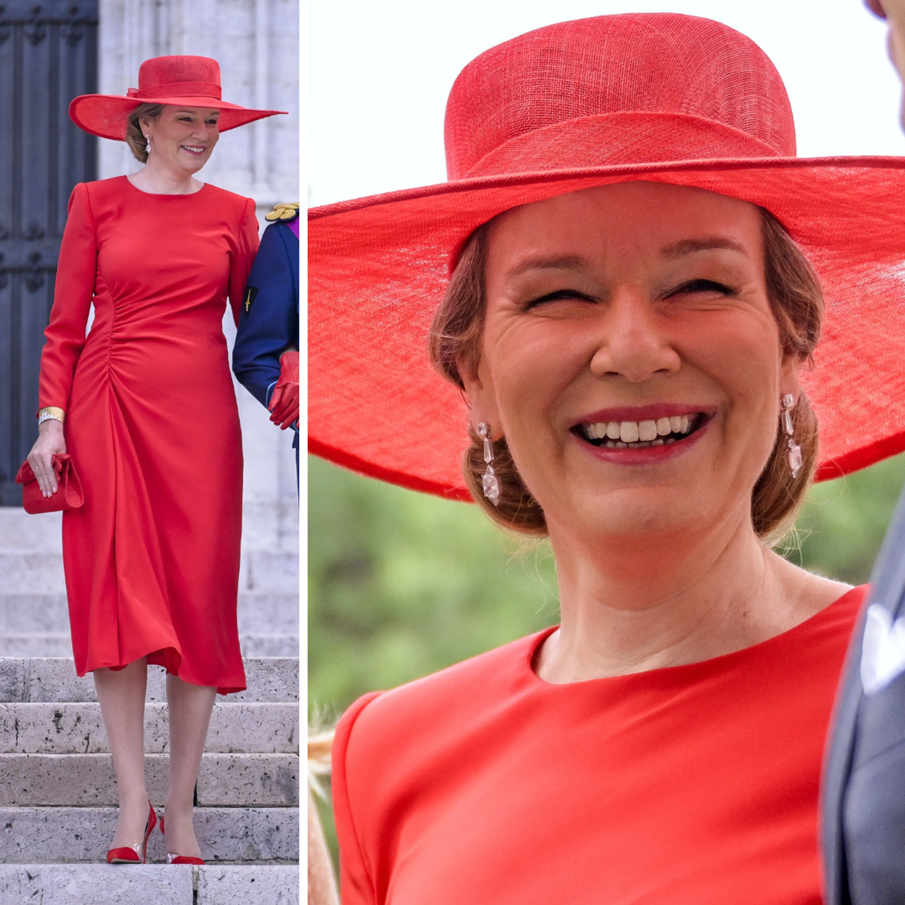 Van top tot teen in het rood! Mathilde verschijnt bij het Te Deum in de St-Michiels en St-Goedelekathedraal in Brussel in een rode japon van Natan. Het Belgische modehuis is een favoriet van de koningin, ze kiest regelmatig creaties van ontwerper Edouard Vermeulen. Ook tijdens het staatsbezoek van koning Willem-Alexander en koningin Máxima aan België vorige maand, draagt Mathilde een jurk van Natan.