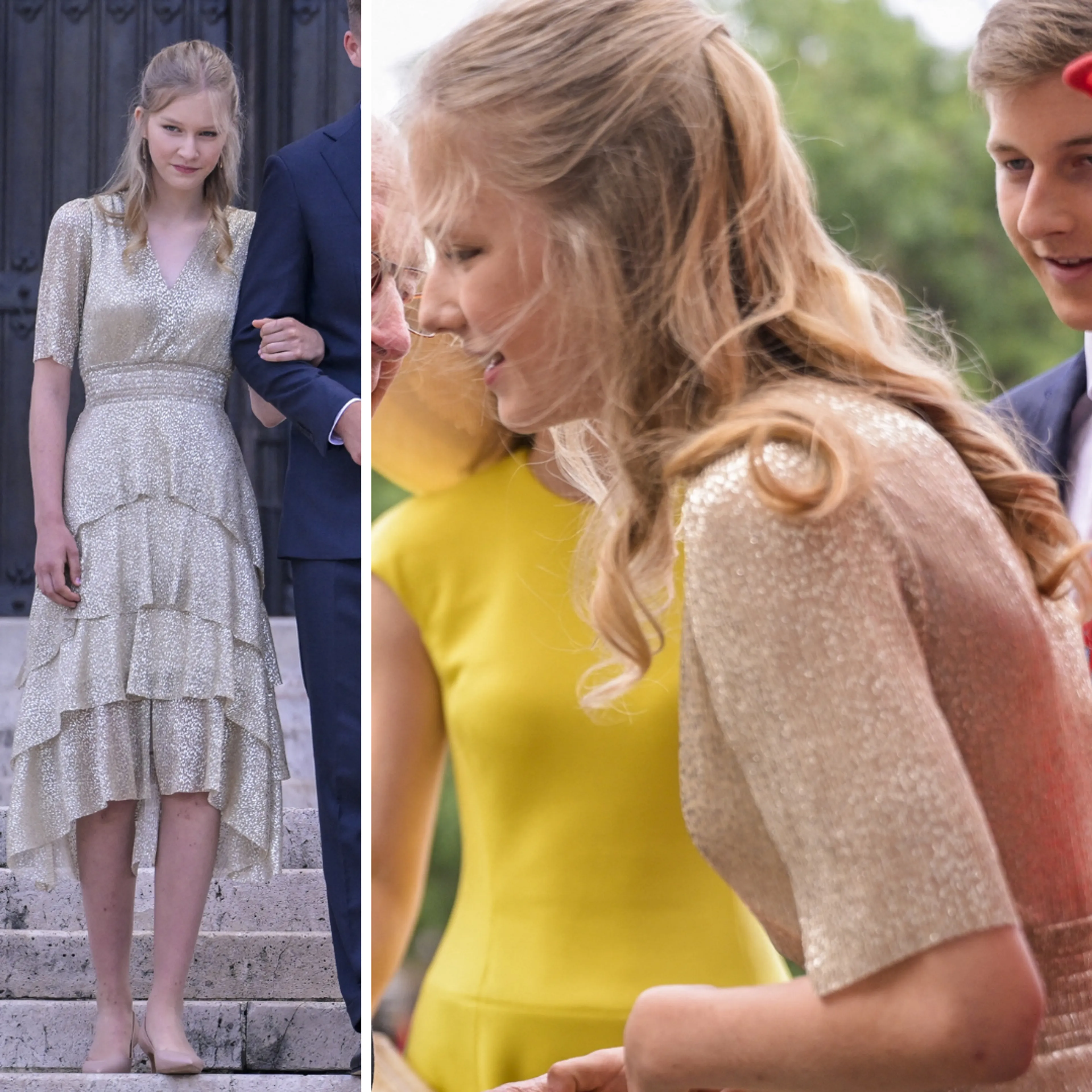 De jongste dochter van koningin Mathilde gaat voor de kleur goud en draagt een glanzende jurk van Maje. De prinses draagt vaker ontwerpen van dit modemerk.