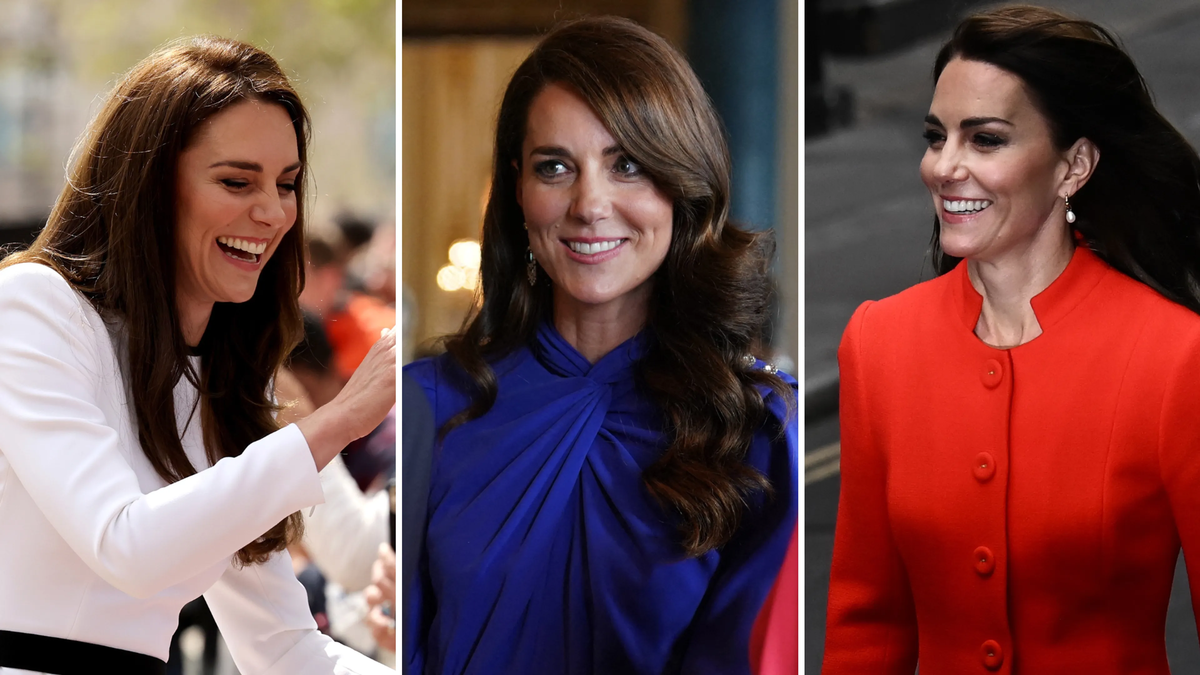 Het weekend van de kroning van koning Charles gaat Catherine geheel in stijl in het rood-wit-blauw, de kleuren van het Verenigd Koninkrijk.