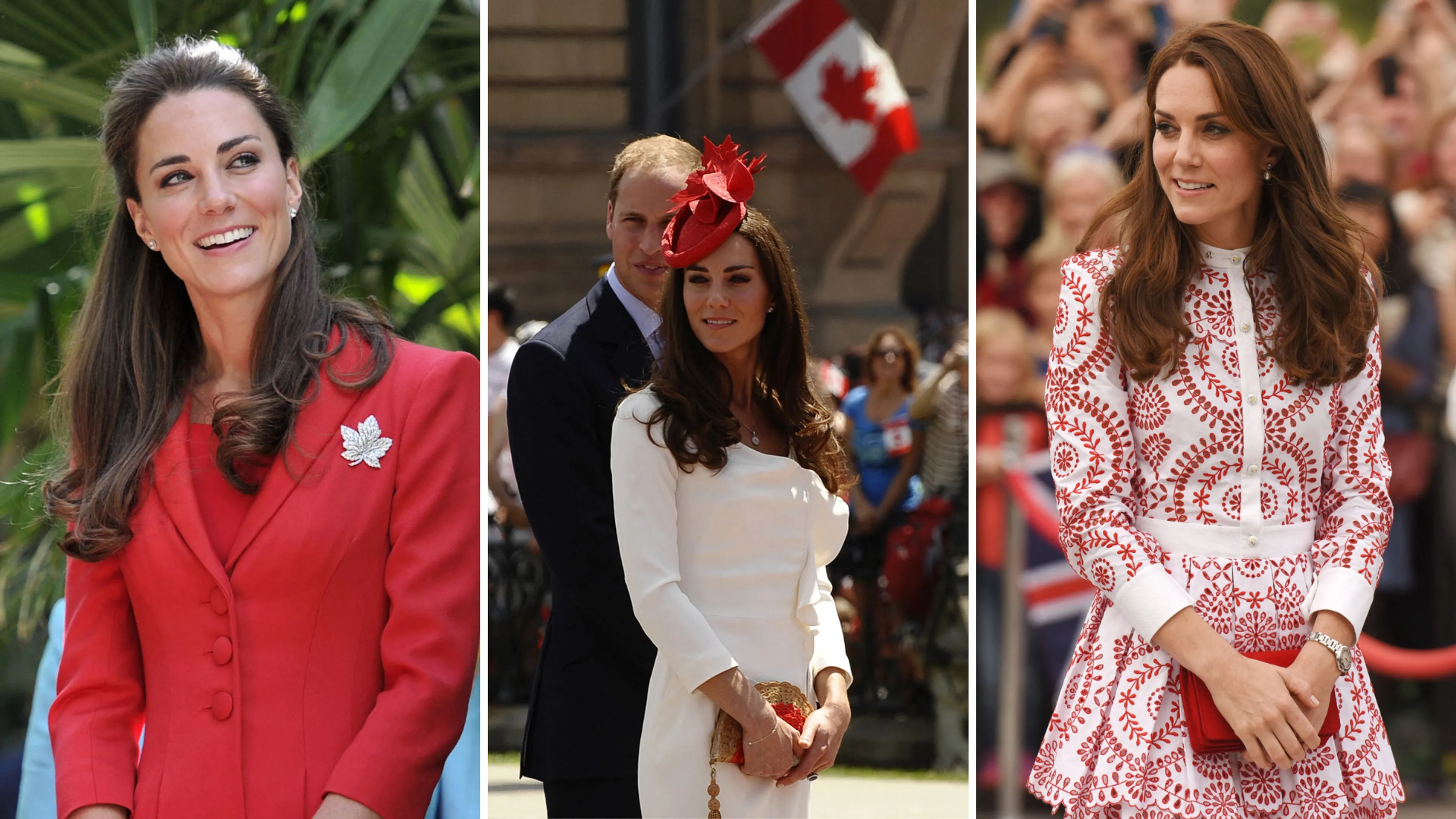 Ook tijdens haar reizen naar Canada zien we haar vaak in het rood en wit en natuurlijk kan het esdoorn blad niet ontbreken aan haar outfits (zie haar broche en hoedje).