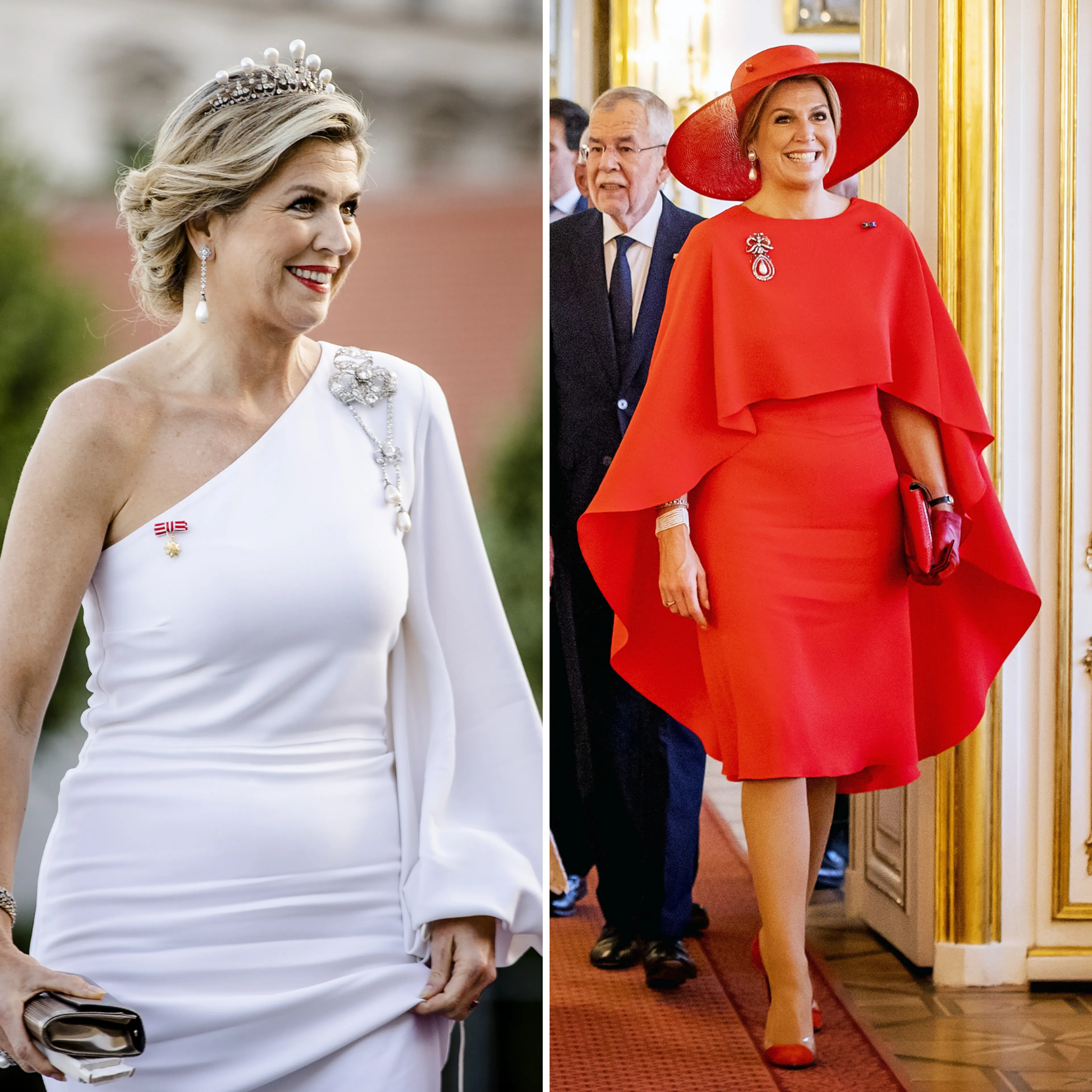 Flagdressing kan ook met meerdere outfits, dat bewijst Máxima tijdens het staatsbezoek aan Oostenrijk. Ze begint het bezoek volledig in het rood en bij het staatsbanket draagt de koningin een prachtige witte jurk van Stella McCartney. Rood en wit zijn de kleuren van de Oostenrijkse vlag.