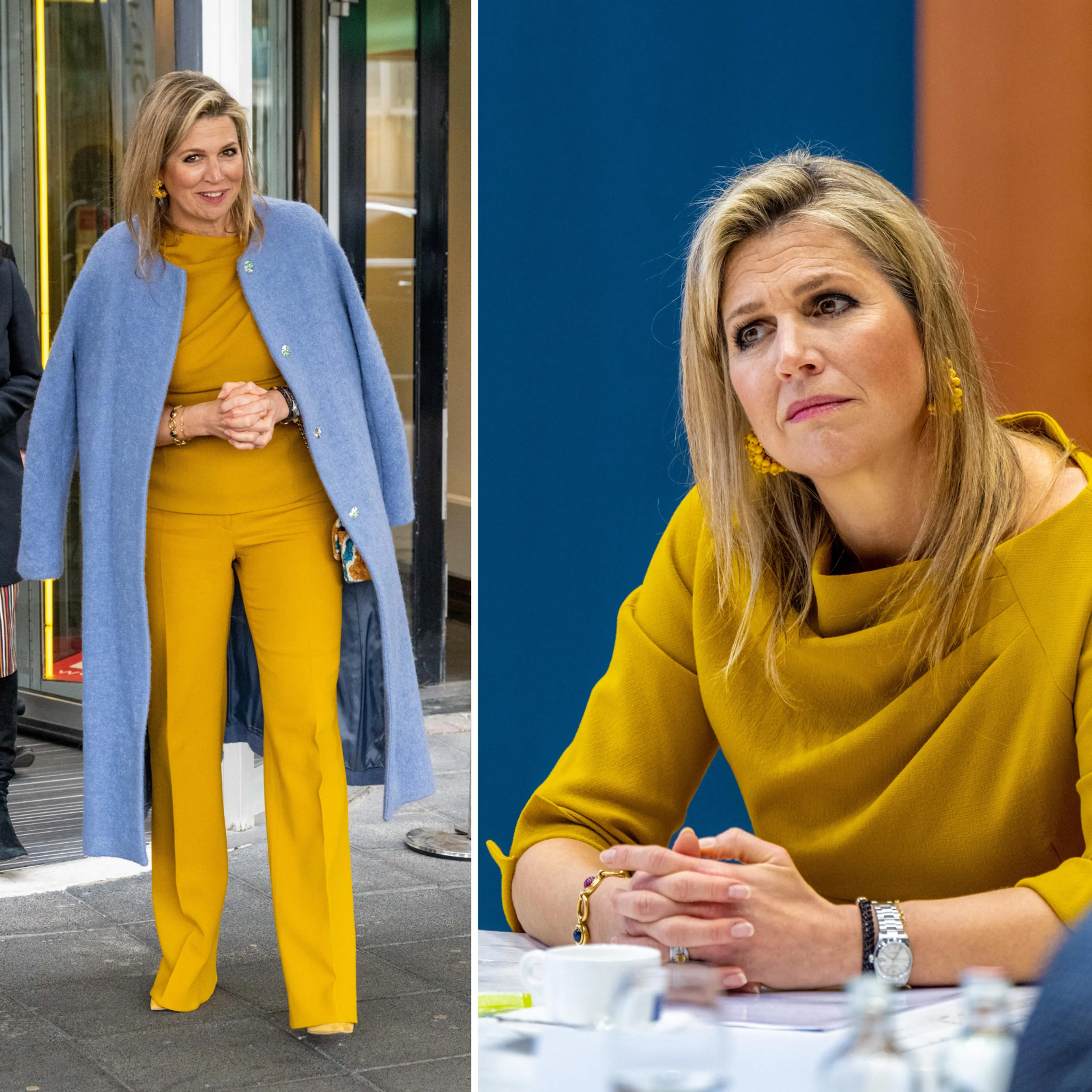 Máxima bezoekt in 2022 de RAI in Amsterdam om met Oekraïense vluchtelingen te praten. Hier kiest ze voor een blauwe en gele outfit: de kleuren van de vlag van Oekraïne.