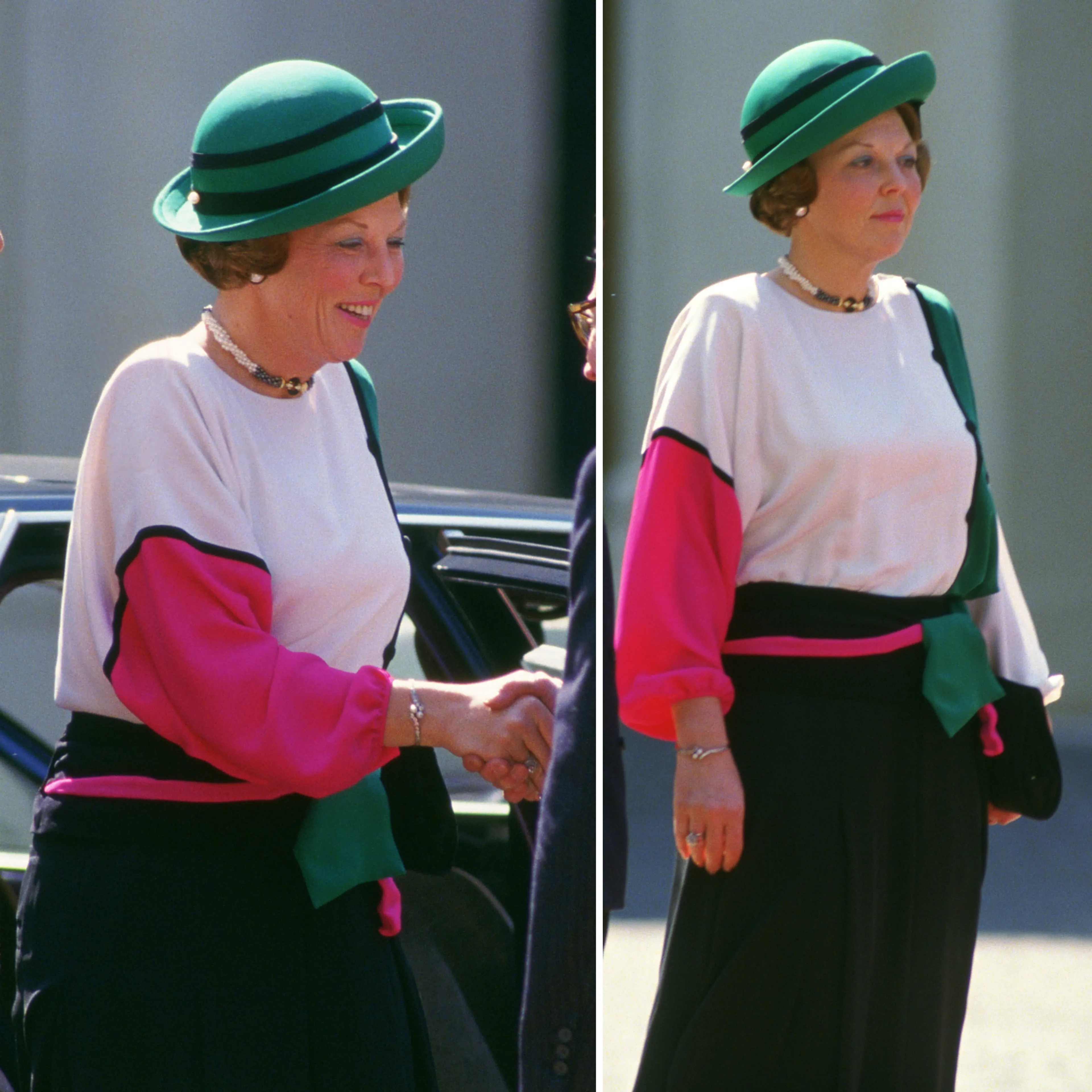 Prinses Beatrix, toen nog koningin, doet ook aan kleden in de kleuren van een land. Zoals bij het staatsbezoek aan Italië in 1985.